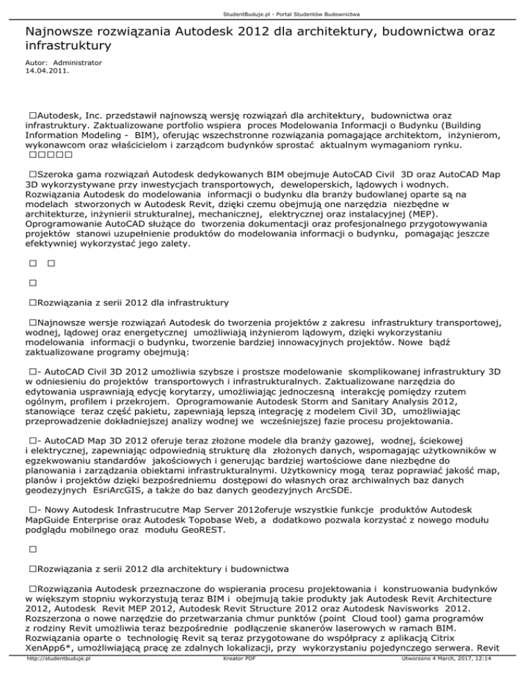 StudentBuduje.pl - Portal Studentów Budownictwa Najnowsze rozwiązania Autodesk 2012 dla architektury, budownictwa oraz infrastruktury Autor: Administrator 14.04.2011. Autodesk, Inc. przedstawił najnowszą wersję rozwiązań dla architektury, budownictwa oraz infrastruktury. Zaktualizowane portfolio wspiera proces Modelowania Informacji o Budynku (Building Information Modeling - BIM), oferując wszechstronne rozwiązania pomagające architektom, inżynierom, wykonawcom oraz właścicielom i zarządcom budynków sprostać aktualnym wymaganiom rynku. Szeroka gama rozwiązań Autodesk dedykowanych BIM obejmuje AutoCAD Civil 3D oraz AutoCAD Map 3D wykorzystywane przy inwestycjach transportowych, deweloperskich, lądowych i wodnych. Rozwiązania Autodesk do modelowania informacji o budynku dla branży budowlanej oparte są na modelach stworzonych w Autodesk Revit, dzięki czemu obejmują one narzędzia niezbędne w architekturze, inżynierii strukturalnej, mechanicznej, elektrycznej oraz instalacyjnej (MEP). Oprogramowanie AutoCAD służące do tworzenia dokumentacji oraz profesjonalnego przygotowywania projektów stanowi uzupełnienie produktów do modelowania informacji o budynku, pomagając jeszcze efektywniej wykorzystać jego zalety. Rozwiązania z serii 2012 dla infrastruktury Najnowsze wersje rozwiązań Autodesk do tworzenia projektów z zakresu infrastruktury transportowej, wodnej, lądowej oraz energetycznej umożliwiają inżynierom lądowym, dzięki wykorzystaniu modelowania informacji o budynku, tworzenie bardziej innowacyjnych projektów. Nowe bądź zaktualizowane programy obejmują: - AutoCAD Civil 3D 2012 umożliwia szybsze i prostsze modelowanie skomplikowanej infrastruktury 3D w odniesieniu do projektów transportowych i infrastrukturalnych. Zaktualizowane narzędzia do edytowania usprawniają edycję korytarzy, umożliwiając jednoczesną interakcję pomiędzy rzutem ogólnym, profilem i przekrojem. Oprogramowanie Autodesk Storm and Sanitary Analysis 2012, stanowiące teraz część pakietu, zapewniają lepszą integrację z modelem Civil 3D, umożliwiając przeprowadzenie dokładniejszej analizy wodnej we wcześniejszej fazie procesu projektowania. - AutoCAD Map 3D 2012 oferuje teraz złożone modele dla branży gazowej, wodnej, ściekowej i elektrycznej, zapewniając odpowiednią strukturę dla złożonych danych, wspomagając użytkowników w egzekwowaniu standardów jakościowych i generując bardziej wartościowe dane niezbędne do planowania i zarządzania obiektami infrastrukturalnymi. Użytkownicy mogą teraz poprawiać jakość map, planów i projektów dzięki bezpośredniemu dostępowi do własnych oraz archiwalnych baz danych geodezyjnych EsriArcGIS, a także do baz danych geodezyjnych ArcSDE. - Nowy Autodesk Infrastrucutre Map Server 2012oferuje wszystkie funkcje produktów Autodesk MapGuide Enterprise oraz Autodesk Topobase Web, a dodatkowo pozwala korzystać z nowego modułu podglądu mobilnego oraz modułu GeoREST. Rozwiązania z serii 2012 dla architektury i budownictwa Rozwiązania Autodesk przeznaczone do wspierania procesu projektowania i konstruowania budynków w większym stopniu wykorzystują teraz BIM i obejmują takie produkty jak Autodesk Revit Architecture 2012, Autodesk Revit MEP 2012, Autodesk Revit Structure 2012 oraz Autodesk Navisworks 2012. Rozszerzona o nowe narzędzie do przetwarzania chmur punktów (point Cloud tool) gama programów z rodziny Revit umożliwia teraz bezpośrednie podłączenie skanerów laserowych w ramach BIM. Rozwiązania oparte o technologię Revit są teraz przygotowane do współpracy z aplikacją Citrix XenApp6*, umożliwiającą pracę ze zdalnych lokalizacji, przy wykorzystaniu pojedynczego serwera. Revit http://studentbuduje.pl Kreator PDF Utworzono 4 March, 2017, 12:14 StudentBuduje.pl - Portal Studentów Budownictwa Server Extension umożliwia natomiast wykorzystanie wielu współdzielonych modeli Revit poprzez sieć WAN. Programy Revit Architecture 2012 oraz Revit Structure 2012 oferują nowe narzędzie do modelowania pomagające lepiej zobrazować proces budowy w oparciu o modele projektowe. Ulepszone koncepcyjne narzędzia analizy energetycznej** w programach Revit Architecture 2012 i Revit MEP 2012 ułatwiają podejmowanie trafnych decyzji na wczesnym etapie procesu projektowania. Pozostałe nowości obejmują: - Autodesk Revit Architecture 2012 umożliwia tworzenie bibliotek wyglądu materiałów, co pozwala na standaryzację materiałów wykorzystywanych w różnych projektach i ułatwia współpracę z zespołem projektowym. Lepsze zdolności wizualizacyjne dają użytkownikom możliwość bardziej realistycznego odwzorowania krawędzi i cieni w trybie spójnych kolorów. - Autodesk Revit Structure 2012 oferuje usprawnienia w ramach tworzenia i zarządzania strukturalnym modelem analitycznym, co z kolei zapewnia lepszą kontrolę i wyższy poziom zgodności ze strukturalnym modelem fizycznym. Poprawki dotyczące uzbrojenia pomagają użytkownikom w łatwiejszym definiowaniu i wizualizowaniu elementów zbrojeniowych betonu. - Autodesk Revit MEP 2012 umożliwia tworzenie zindywidualizowanych systemów, przypisywanie systemów do kanałów/rur bez konieczności ich podłączania do wyposażenia, przypisywanie kolorów i typów linii przez system bez filtrów, jak również obliczanie, w dowolnym momencie, łącznego obciążenia elektrycznego, przepływu powietrza lub przepustowości rur. Nowe mechanizmy blokowania przestrzeni dają użytkownikom możliwość tworzenia koncepcyjnych, jednoliniowych kanałów instalacyjnych na wczesnym etapie procesu projektowania oraz na późniejszą ich zamianę na geometrię 3D. - Autodesk Navisworks 2012 przyspiesza analizę projektów BIM dzięki usprawnieniom w modułach integracji, analizy i komunikacji. Poprawa interoperacyjności plików podnosi poziom wydajności dzięki lepszemu wykorzystaniu wszystkich usprawnień wprowadzonych do rodziny programów Autodesk 