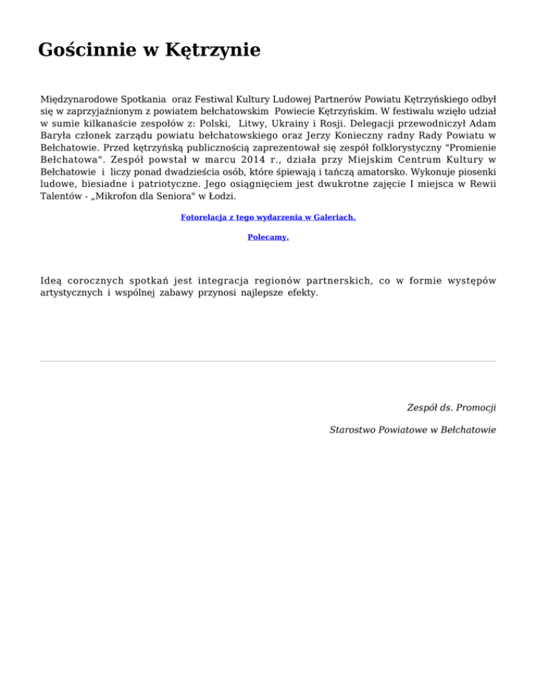 Gościnnie w Kętrzynie Międzynarodowe Spotkania oraz Festiwal Kultury Ludowej Partnerów Powiatu Kętrzyńskiego odbył się w zaprzyjaźnionym z powiatem bełchatowskim Powiecie Kętrzyńskim. W festiwalu wzięło udział w sumie kilkanaście zespołów z: Polski, Litwy, Ukrainy i Rosji. Delegacji przewodniczył Adam Baryła członek zarządu powiatu bełchatowskiego oraz Jerzy Konieczny radny Rady Powiatu w Bełchatowie. Przed kętrzyńską publicznością zaprezentował się zespół folklorystyczny "Promienie Bełchatowa". Zespół powstał w marcu 2014 r., działa przy Miejskim Centrum Kultury w Bełchatowie i liczy ponad dwadzieścia osób, które śpiewają i tańczą amatorsko. Wykonuje piosenki ludowe, biesiadne i patriotyczne. Jego osiągnięciem jest dwukrotne zajęcie I miejsca w Rewii Talentów - „Mikrofon dla Seniora" w Łodzi. Fotorelacja z tego wydarzenia w Galeriach. Polecamy. Ideą corocznych spotkań jest integracja regionów partnerskich, co w formie występów artystycznych i wspólnej zabawy przynosi najlepsze efekty. Zespół ds. Promocji Starostwo Powiatowe w Bełchatowie