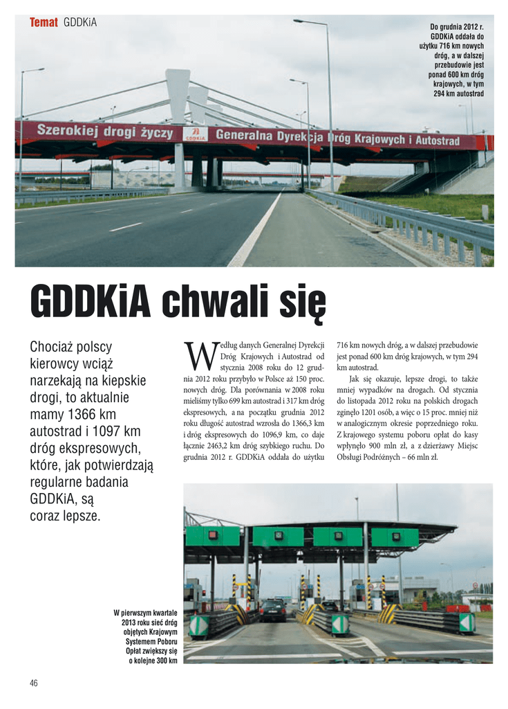 Temat GDDKiA Do grudnia 2012 r. GDDKiA oddała do użytku 716 km nowych dróg, a w dalszej przebudowie jest ponad 600 km dróg krajowych, w tym 294 km autostrad GDDKiA chwali się Chociaż polscy kierowcy wciąż narzekają na kiepskie drogi, to aktualnie mamy 1366 km autostrad i 1097 km dróg ekspresowych, które, jak potwierdzają regularne badania GDDKiA, są coraz lepsze. W pierwszym kwartale 2013 roku sieć dróg objętych Krajowym Systemem Poboru Opłat zwiększy się o kolejne 300 km 46 W edług danych Generalnej Dyrekcji Dróg Krajowych i Autostrad od stycznia 2008 roku do 12 grudnia 2012 roku przybyło w Polsce aż 150 proc. nowych dróg. Dla porównania w 2008 roku mieliśmy tylko 699 km autostrad i 317 km dróg ekspresowych, a na początku grudnia 2012 roku długość autostrad wzrosła do 1366,3 km i dróg ekspresowych do 1096,9 km, co daje łącznie 2463,2 km dróg szybkiego ruchu. Do grudnia 2012 r. GDDKiA oddała do użytku 716 km nowych dróg, a w dalszej przebudowie jest ponad 600 km dróg krajowych, w tym 294 km autostrad. Jak się okazuje, lepsze drogi, to także mniej wypadków na drogach. Od stycznia do listopada 2012 roku na polskich drogach zginęło 1201 osób, a więc o 15 proc. mniej niż w analogicznym okresie poprzedniego roku. Z krajowego systemu poboru opłat do kasy wpłynęło 900 mln zł, a z dzierżawy Miejsc Obsługi Podróżnych – 66 mln zł. Dzięki oddanym w tym roku drogom kierowcy w krótszym czasie pokonają trasę np. ze stolicy do Łodzi, Wrocławia czy Gdańska (Warszawa–Łódź – krócej o 1,5 godz; Warszawa–Wrocław – krócej o 2 godz; Warszawa–Gdańsk – krócej o 1,5 godziny). Wiele z tych dróg zrealizowano za kwoty niższe niż planowane w kosztorysach inwestorskich. Przykładem mogą być chociażby dwa odcinki autostrady A2 Łódź–Warszawa; autostradowa obwodnica Mińska Mazowieckiego oraz odcinki drogi ekspresowej S8 z Zambrowa do Wiśniewa i z Wrocławia do Sycowa. Urealniło to ceny budowy dróg w Polsce przybliżając je do cen europejskich. Średnia cena budowy 1 km drogi szybkiego ruchu w Polsce to obecnie ok. 10 mln euro. W konsekwencji kierowcy mogą obecnie korzystać z 1366,3 km autostrad i 1097 km dróg ekspresowych, a Program Budowy Dróg Krajowych obowiązujący do 2015 r. został zrealizowany w ponad 60 proc. Inwestycje budowlane GDDKiA realizowało 133 generalnych wykonawców. W 2012 r. liczba budujących zmniejszyła się o 8 wykonawców, którzy ogłosili upadłość. Stanowi to 6 proc. wykonawców, którzy mieli podpisane umowy z GDDKiA. Najważniejsza jakość Z uwagi na skalę zamierzeń inwestycyjnych istotnym elementem nadzoru nad realizowanymi inwestycjami jest kwestia prawidłowej jakości budowanych dróg. GDDKiA systematyczne monitoruje jakość robót za pomocą własnych laboratoriów drogowych wypo- sażonych w nowoczesny sprzęt pomiarowy i diagnostyczny. Laboratoria te wykonują co najmniej 10 proc. badań wymaganych przez specyfikację przetargową. Dzięki temu możliwa jest bieżąca kontrola jakości realizowanych prac. W wyniku przeprowadzonych analiz w sposób szczególny zwracana jest uwaga na tych wykonawców, u których negatywne wyniki badań laboratoryjnych przekroczyły 25 procent ogółu badań. Celem jest wychwycenie na jak najwcześniejszym etapie realizacji inwestycji wszystkich nieprawidłowości, tak by wykonawca usunął je niezwłocznie, w ramach podpisanego kontraktu. W ciągu 11 miesięcy 2012 roku laboratoria drogowe przebadały 63392 próbki z 61 kontraktów inwestycyjnych, z czego 15% nie spełniało wymagań. Dla przypomnienia w 2010 roku na 700 pobranych próbek 40% nie spełniało wymagań, a w 2011 na 49065 próbek 18%. Pozwoliło to na wykluczenie już na etapie budowy nieprawidłowości zagrażających najwyższej jakości realizowanych inwestycji. Plany na 2013 W 2013 r w realizacji będzie 706,3 km dróg, do ruchu zostanie oddanych 401 km dróg, w tym 126,3 km autostrad i 235 km dróg ekspresowych. Na realizację zadań budowlanych zarezerwowanych jest w programie budowy dróg na lata 2011-2015 18 mld zł z czego 15 mld zł będzie pochodzić z Krajowego Funduszu Drogowego. Prognozowane wpływy do KFD z tytułu refundacji środków UE to 6,8 mld zł (w tym POIŚ – 6,6 mld zł oraz PORPW – 200 mln Średnia cena budowy 1 km drogi szybkiego ruchu w Polsce to obecnie ok. 10 mln euro Lista dróg objętych rozszerzeniem: Styczeń 2013: 1. Autostrada A1 - Odcinek węzeł Pyrzowice - węzeł Sośnica (43,7 km) - Odcinek węzeł Kotliska – węzeł Stryków I (39,29 km) 2. Droga ekspresowa S1 - Odcinek węzeł Pyrzowice- węzeł Lotnisko (1,9 km) 3. Droga ekspresowa S8 - Odcinek węzeł Pawłowice – węzeł Dąbrowa (22,1 km) - Odcinek węzeł Cieśle – węzeł Syców Wschód (25,1 km) - Odcinek węzeł Modlińska – węzeł Piłsudskiego (7,1 km) Marzec 2013: 1. Droga ekspresowa S7 i droga krajowa nr 7 - Obwodnica Elbląga, odcinek skrzyżowanie z drogą powiatową nr 1104N – węzeł Raczki (ok. 3,7 km) - Odcinek węzeł Modlniczka – węzeł Balice I (ok. 3,5 km) - Odcinek węzeł Raczki – węzeł ElblągWschód (ok. 3,8 km) 2. Droga ekspresowa S8: - Odcinek węzeł Piotrków – węzeł Radziejowice (ok. 93,6 km) 3. Droga ekspresowa S19: - Odcinek Stobierna – węzeł RzeszówWschód (ok. 6,9 km) 4. Droga krajowa nr 4: - Obwodnica Jarosławia, odcinek Tywonia – Tuczempy (koniec obwodnicy Jarosławia) (ok. 11,3 km) 5. Droga krajowa nr 79: - Odcinek Jaworzno (granica miasta) – węzeł Modlniczka (ok. 37,8 km) zł). Zaplanowane wpływy z Krajowego Systemu Poboru Opłat (wpływy z elektronicznego i manualnego poboru opłat) w 2013 roku szacowane są w wysokości 1,48 mld zł. W pierwszym kwartale 2013 roku sieć dróg objętych Krajowym Systemem Poboru Opłat zwiększy się o kolejne 300 km. Rozszerzenia nastąpią w styczniu 2013 r. (139,12 km) oraz w marcu 2013 r. (160 km). Źródło: GDDKiA, fot. Lesław Sagan 47