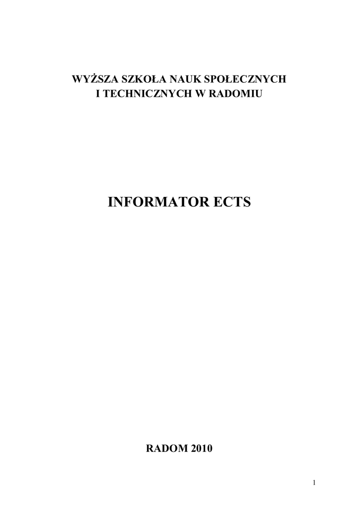WYŻSZA SZKOŁA NAUK SPOŁECZNYCH I TECHNICZNYCH W RADOMIU INFORMATOR ECTS RADOM 2010 1 SPIS TREŚCI 1. Po co i skąd ECTS ? 2. Karta bolońska 3. Informacje o szkole 4. Baza dydaktyczna 5. Misja Uczelni 6. Relacje z otoczeniem 7. Władze uczelni 8. Dane teleadresowe 9. Oferta dydaktyczna 10. Charakterystyka kierunków 11. Czesne 12. Studia podyplomowe 13. Regulamin praktyk 14. Program praktyk poszczególnych kierunków 15. Charakterystyka programu Erasmus 16. Stosowane metody dydaktyczne i organizacja kształcenia 17. Nauka j. obcych 18. Niepełnosprawni w WSNSIT 19. Konsultacje 20. Zasady dyplomowania 21. Sprawy studenckie 22. Koła naukowe 23. Działalność społeczna 2 PO CO I SKĄD ECTS ? Europejski System Transferu Punktów (ECTS od angielskiej nazwy European Credit Transfer System) jest od 1989 roku wprowadzany w szkołach wyższych krajów Europy Zachodniej. Opracowany został z myślą o ułatwieniu dostępu do informacji o programach studiów w uczelniach zagranicznych oraz usprawnieniu wymiany studentów między uczelniami. Każda uczelnia, która chce brać udział w wymianie studentów, przygotowuje informator o studiach, zawierający m.in. plan studiów oraz opisy poszczególnych przedmiotów wraz z przypisanymi im punktami. W związku z postanowieniami Deklaracji Bolońskiej (1999), zaistniała potrzeba stworzenia systemu akumulacji punktów takich jak w ECTS. Wynikiem komunikatu praskiego (2001), a następnie konferencji w Zurichu (2002) było zatwierdzenie ECTS, jako systemu transferu i akumulacji punktów. Komunikat berliński (http://www.bologna-berlin2003.de) z września 2003 podkreślił, że ECTS stanowi podstawę narodowych systemów akumulacji punktów. Obecnie, na podstawie podpisanych porozumień akronim ECTS (European Credit Transfer and Accumulation System) jest rozumiany jako system transferu i akumulacji punktów a w przyszłości prawdopodobnie jako system akumulacji wraz z narzędziami służącymi do transferu. Punkty ECTS są względnym miernikiem nakładu pracy studenta potrzebnej do zaliczenia danego przedmiotu. Ustalane są na podstawie całkowitego obciążenia studenta, a nie tylko na podstawie liczby godzin zajęć. Ilość pracy wymaganej w całym roku akademickim odpowiada 60 punktom ECTS; na semestr przypada średnio 30 punktów. Studentowi, pragnącemu odbyć część swoich studiów w innej uczelni, system punktowy umożliwia rozsądny wybór zajęć ze względu na wkład wymaganej pracy. Oczywiście, student powinien wybrać program zbliżony do programu studiów w uczelni macierzystej, kierując się opisem poszczególnych przedmiotów przedstawionych w informatorze o studiach na danej uczelni. W przypadku wyjazdu studenta na inną uczelnię przygotowuje się dla niego wykaz zaliczeń przed jego wyjazdem i po powrocie. Punkty przyznawane są po uzyskaniu zaliczenia przedmiotu, ale na uczelni macierzystej nie wpisuje się ich do indeksu. Punkty za przedmioty zaliczone za granicą zastępują punkty, które student uzyskałby normalnie w uczelni macierzystej. Podstawowe zasady ECTS: Zasady systemu są wspólne dla wszystkich rodzajów i form prowadzenia studiów. Przydziałem punktów są objęte wszystkie przewidziane programem przedmioty oraz elementy programu studiów, które podlegają ocenie. Punkty przypisywane są całym przedmiotom, a nie poszczególnym formom zajęć. Uzyskanie pozytywnych ocen z wszystkich zajęć wchodzących w skład danego przedmiotu w określonym semestrze (roku) jest równoznaczne z przypisaniem do indywidualnego konta studenta liczby wszystkich punktów przyporządkowanych temu przedmiotowi. Rok zajęć przewidzianych danym programem jest równoważny 60 punktom. Uzyskanie dyplomu, poza spełnieniem wymagań programowych, wymaga zdobycia liczby punktów proporcjonalnej do nominalnego czasu trwania studiów, np. trzyletnich studiów licencjackich jest to 3 x 60, czyli 180 punktów, a dla pięcioletnich studiów magisterskich 5 x 60 czyli 300 punktów. Kluczową rolę w systemie ECTS pełnią trzy dokumenty: 3 Pakiet informacyjny (Information package) zawiera ogólne informacje na temat uczelni przyjmującej, kalendarza akademickiego, procedur administracyjnych oraz szczegółowy opis programu studiów i dostępnych zajęć na jednym lub kilku (zwykle pokrewnych) kierunkach studiów. Opis ten dotyczy przede wszystkim formuły zajęć, ich problematyki, wymagań wstępnych, okresu trwania, sposobu oceny, wartości punktowej oraz innych istotnych danych na temat przedmiotów proponowanych przez uczestniczącą w systemie ECTS instytucję. Pakiet jest formą przewodnika dla studentów i nauczycieli akademickich w uczelniach partnerskich (tzn. takich, z którymi uczelnia macierzysta ma podpisaną umowę dwustronną). Winien być aktualizowany co rok i dostępny w formie elektronicznej oraz w wersji obcojęzycznej. Porozumienie o programie zajęć (Learning agreement) jest to rodzaj kontraktu pomiędzy studentem, a współpracującymi uczelniami (wysyłającą i przyjmującą). Porozumienie to musi zostać podpisane przez wszystkie strony przed wyjazdem studenta za granicę. Student zobowiązuje się w tym dokumencie do zrealizowania określonego programu zajęć wybranych z oferty uczelni przyjmującej. Zatwierdzając porozumienie uczelnia przyjmująca zobowiązuje się zapewnić studentowi udział w wymienionych tamże zajęciach, zaś uczelnia wysyłająca potwierdza wolę uznania zaliczonych przedmiotów według uzgodnionej punktacji i skali ocen zgodnej z systemem ECTS. Wykaz zaliczeń (Transcript of records) opisuje osiągnięcia studenta w nauce przed i po okresie studiów za granicą. W wykazie wymienione są wszystkie studiowane przedmioty, ilość zdobytych punktów oraz uzyskane oceny, przyznawane według skali ocen danej uczelni, a także według skali ocen ECTS. Wszelkie informacje o systemie punktowym (w tym formularze, które są potrzebne przy wymianie studentów) można otrzymać u uczelnianego koord