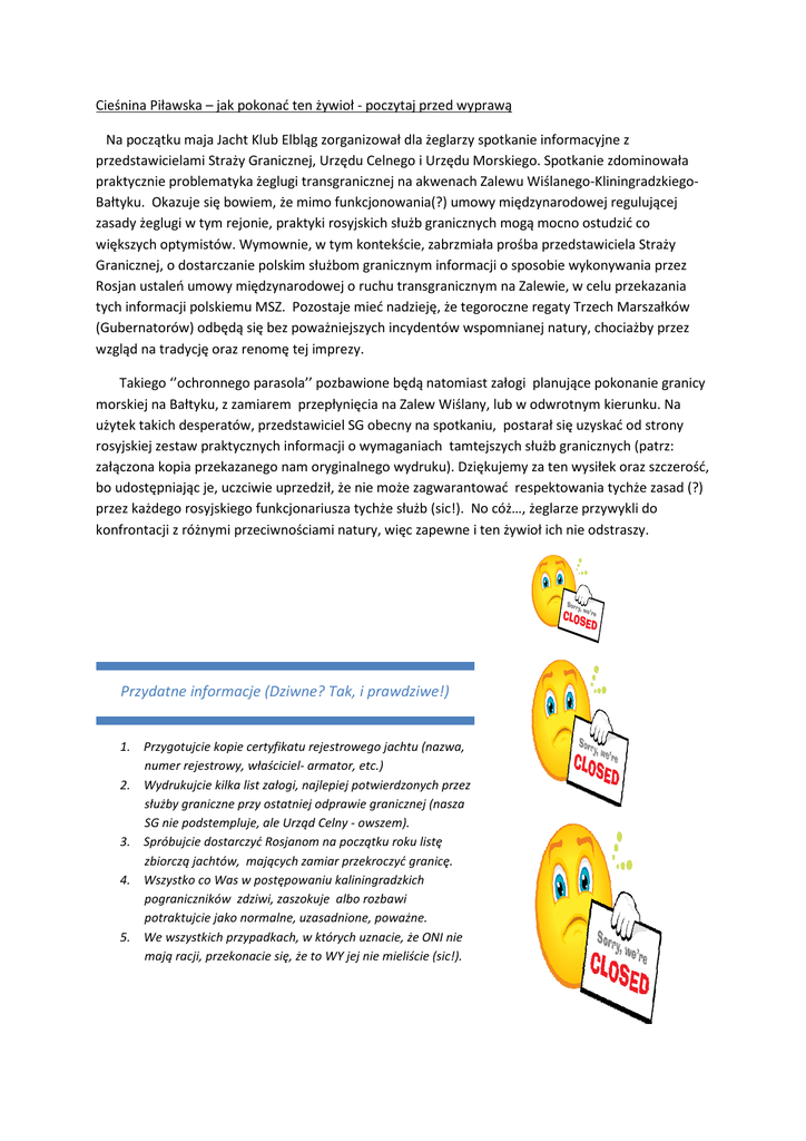Cieśnina Piławska – jak pokonać ten żywioł - poczytaj przed wyprawą Na początku maja Jacht Klub Elbląg zorganizował dla żeglarzy spotkanie informacyjne z przedstawicielami Straży Granicznej, Urzędu Celnego i Urzędu Morskiego. Spotkanie zdominowała praktycznie problematyka żeglugi transgranicznej na akwenach Zalewu Wiślanego-KliningradzkiegoBałtyku. Okazuje się bowiem, że mimo funkcjonowania(?) umowy międzynarodowej regulującej zasady żeglugi w tym rejonie, praktyki rosyjskich służb granicznych mogą mocno ostudzić co większych optymistów. Wymownie, w tym kontekście, zabrzmiała prośba przedstawiciela Straży Granicznej, o dostarczanie polskim służbom granicznym informacji o sposobie wykonywania przez Rosjan ustaleń umowy międzynarodowej o ruchu transgranicznym na Zalewie, w celu przekazania tych informacji polskiemu MSZ. Pozostaje mieć nadzieję, że tegoroczne regaty Trzech Marszałków (Gubernatorów) odbędą się bez poważniejszych incydentów wspomnianej natury, chociażby przez wzgląd na tradycję oraz renomę tej imprezy. Takiego ‘’ochronnego parasola’’ pozbawione będą natomiast załogi planujące pokonanie granicy morskiej na Bałtyku, z zamiarem przepłynięcia na Zalew Wiślany, lub w odwrotnym kierunku. Na użytek takich desperatów, przedstawiciel SG obecny na spotkaniu, postarał się uzyskać od strony rosyjskiej zestaw praktycznych informacji o wymaganiach tamtejszych służb granicznych (patrz: załączona kopia przekazanego nam oryginalnego wydruku). Dziękujemy za ten wysiłek oraz szczerość, bo udostępniając je, uczciwie uprzedził, że nie może zagwarantować respektowania tychże zasad (?) przez każdego rosyjskiego funkcjonariusza tychże służb (sic!). No cóż…, żeglarze przywykli do konfrontacji z różnymi przeciwnościami natury, więc zapewne i ten żywioł ich nie odstraszy. Przydatne informacje (Dziwne? Tak, i prawdziwe!) 1. Przygotujcie kopie certyfikatu rejestrowego jachtu (nazwa, numer rejestrowy, właściciel- armator, etc.) 2. Wydrukujcie kilka list załogi, najlepiej potwierdzonych przez służby graniczne przy ostatniej odprawie granicznej (nasza SG nie podstempluje, ale Urząd Celny - owszem). 3. Spróbujcie dostarczyć Rosjanom na początku roku listę zbiorczą jachtów, mających zamiar przekroczyć granicę. 4. Wszystko co Was w postępowaniu kaliningradzkich pograniczników zdziwi, zaszokuje albo rozbawi potraktujcie jako normalne, uzasadnione, poważne. 5. We wszystkich przypadkach, w których uznacie, że ONI nie mają racji, przekonacie się, że to WY jej nie mieliście (sic!). I jeszcze garść informacji, dla przypomnienia, co po naszej stronie granicy. 1. Przejście graniczne obsługiwane jest całodobowo. Zgłaszać jachty do odprawy granicznej wystarczy tylko do SG (tel.: 55 237 6400 , fax: 55 237 64 05, e-mail: [email protected]), a oni powiadomią o odprawie również celników. Odprawy nadal możliwe będą tylko w Elblągu i Fromborku (uwaga: coraz płycej przy keji w miejscu odpraw, a o pogłębianiu ani słychu…), w Krynicy Morskiej nadal odpraw nie będzie (przepisy Schengen), także do regat Trzech Marszałków. 2. Przy zgłoszeniu przez organizatorów wielu jednostek (przykład: jachty w Regatach Trzech Marszałków) zarówno SG jak też UC są w stanie zorganizować odprawy graniczne przy keji, w miejscu cumowania jachtów. To znaczące ułatwienie dla startujących załóg możliwe będzie pod warunkiem zdyscyplinowania żeglarzy – obowiązuje obecność wszystkich członków załóg na pokładzie jachtów zgłoszonych do odprawy. 3. SG nie wymaga okazywania przy odprawie list załogi i nie potwierdzi ich na użytek służb rosyjskich. Urząd Celny może natomiast przyjąć do wiadomości listę załogi i potwierdzić na dodatkowych egzemplarzach dla Rosjan (takie bumagi Rosjanie przyjmują z udowolstwiem). 4. W odległości do 3 Mm od granicy wszystkie jednostki muszą być rozpoznane przez SG. Wpływając do tej strefy jacht należy zatem zgłaszać radiem na kanałach 10 lub 16. Dowódca jednostki SG na Zalewie Wiślanym dostępny jest także pod tel.: 721 961 632. 5. Urząd Morski przypomina: a/ na rzece Elbląg dopuszczalna jest żegluga wyłącznie w porze dziennej, b/ w portach żegluga pod żaglami jest wykluczona, c/ most nowakowski w sezonie będzie otwierany już od godz. 05 00. Opracował: Tadeusz Kaszczyc Załącznik: Kopia informacji SG o zasadach przekraczania granicy rejonie Cieśniny Piławskiej (tekst zgodny z oryginałem)