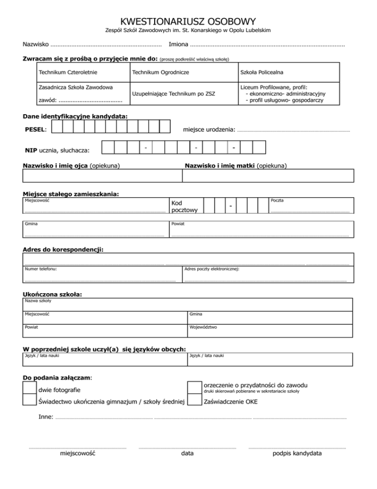 KWESTIONARIUSZ OSOBOWY Zespół Szkół Zawodowych im. St. Konarskiego w Opolu Lubelskim Nazwisko ................................................................ Zwracam się z prośbą o przyjęcie mnie do: Technikum Czteroletnie Zasadnicza Szkoła Zawodowa Imiona ......................................................................................... (proszę podkreślić właściwą szkołę) Technikum Ogrodnicze Szkoła Policealna Uzupełniające Technikum po ZSZ Liceum Profilowane, profil: - ekonomiczno- administracyjny - profil usługowo- gospodarczy zawód: ..................................... Dane identyfikacyjne kandydata: PESEL: miejsce urodzenia: ......................................................................................... NIP ucznia, słuchacza: - - Nazwisko i imię ojca (opiekuna) - Nazwisko i imię matki (opiekuna) Miejsce stałego zamieszkania: Miejscowość Poczta ............................................................................................................... Kod pocztowy Gmina Powiat .............................................................................................................. ............................................................................................................................................ - .............................................................. Adres do korespondencji: .............................................................................................................. .............................................................................................................. .................................. Numer telefonu: Adres poczty elektronicznej: ....................................................................................................................... ................................................................................................................................ Ukończona szkoła: Nazwa szkoły Miejscowość Gmina Powiat Województwo W poprzedniej szkole uczył(a) się języków obcych: Język / lata nauki Język / lata nauki Do podania załączam: orzeczenie o przydatności do zawodu dwie fotografie druki skierowań pobierane w sekretariacie szkoły Świadectwo ukończenia gimnazjum / szkoły średniej Inne: Zaświadczenie OKE ............................................................................. ............................................................................. .......................................................................... ............................................................................. miejscowość ............................................................................. data ............................................................................. podpis kandydata Życiorys kandydata ............................................................................................................................................................................. ............................................................................................................................................................................. ............................................................................................................................................................................. ............................................................................................................................................................................. ............................................................................................................................................................................. ............................................................................................................................................................................. ............................................................................................................................................................................. ............................................................................................................................................................................. ............................................................................................................................................................................. ............................................................................................................................................................................. ............................................................................................................................................................................. ............................................................................................................................................................................. ............................................................................................................................................................................. ............................................................................................................................................................................. ............................................................................................................................................................................. ............................................................................................................................................................................. ............................................................................................................................................................................. ............................................................................................................................................................................. ..................................