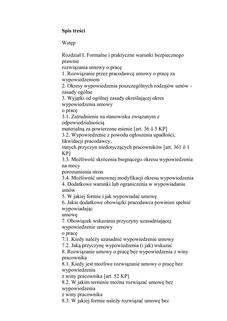 Spis treści Wstęp Rozdział I. Formalne i praktyczne warunki bezpiecznego prawnie rozwiązania umowy o pracę 1. Rozwiązanie przez pracodawcę umowy o pracę za wypowiedzeniem 2. Okresy wypowiedzenia poszczególnych rodzajów umów zasady ogólne 3. Wyjątki od ogólnej zasady określającej okres wypowiedzenia umowy o pracę 3.1. Zatrudnienie na stanowisku związanym z odpowiedzialnością materialną za powierzone mienie [art. 36 ő 5 KP] 3.2. Wypowiedzenie z powodu ogłoszenia upadłości, likwidacji pracodawcy, innych przyczyn niedotyczących pracowników [art. 361 ő 1 KP] 3.3. Możliwość skrócenia biegnącego okresu wypowiedzenia na mocy porozumienia stron 3.4. Możliwość umownej modyfikacji okresu wypowiedzenia 4. Dodatkowe warunki lub ograniczenia w wypowiadaniu umów 5. W jakiej formie i jak wypowiadać umowę 6. Jakie dodatkowe obowiązki pracodawca powinien spełnić wypowiadając umowę 7. Obowiązek wskazania przyczyny uzasadniającej wypowiedzenie umowy o pracę 7.1. Kiedy należy uzasadnić wypowiedzenie umowy 7.2. Jaką przyczynę wypowiedzenia (i jak) wskazać 8. Rozwiązanie umowy o pracę bez wypowiedzenia z winy pracownika 8.1. Kiedy jest możliwe rozwiązanie umowy o pracę bez wypowiedzenia z winy pracownika [art. 52 KP] 8.2. W jakim terminie można rozwiązać umowę bez wypowiedzenia z winy pracownika 8.3. W jakiej formie należy rozwiązać umowę bez wypowiedzenia z winy pracownika 8.4. Jakie dodatkowe obowiązki pracodawca powinien spełnić wypowiadając umowę bez wypowiedzenia z winy pracownika 9. Ciężkie naruszenie przez pracownika podstawowych obowiązków pracowniczych [art. 52 ő 1 pkt 1 KP] 9.1. Uwagi ogólne 9.2. Które obowiązki pracownicze należy uznać za podstawowe 9.3. Kiedy naruszenie podstawowych obowiązków pracowniczych można uznać za ciężkie 9.4. Co w praktyce uznaje się za ciężkie naruszenie podstawowych obowiązków pracowniczych 10. Rozwiązanie umowy o pracę bez wypowiedzenia bez winy pracownika 11. Porozumienie stron o rozwiązaniu umowy o pracę 11.1. Czym jest porozumienie o rozwiązaniu umowy o pracę i kiedy może zostać zawarte 11.2. Elementy porozumienia o rozwiązaniu umowy o pracę 12. Obowiązek udokumentowania zasadności przyczyny rozwiązania umowy o pracę Rozdział II. Wybrane przypadki nadużyć - konsekwencje, tryb działania, możliwości odszkodowawcze, zwolnienie z pracy 1. Wykorzystywanie zwolnienia lekarskiego w sposób niezgodny z przeznaczeniem 1.1. Czy pracodawca może zwolnić dyscyplinarnie pracownika naruszającego regulacje dotyczące czasu choroby 1.2. Czy pracownik musi udzielić informacji, gdzie przebywał w trakcie zwolnienia lekarskiego 1.3. Czy i jak pracodawca może skontrolować pracownika na zwolnieniu lekarskim 1.4. Czy sama nieobecność pracownika w miejscu zamieszkania (pobytu) upoważnia do wyciągnięcia konsekwencji 1.5. Co się dzieje, jeżeli kontrola wykryje, że pracownik wykorzystuje zwolnienie lekarskie niezgodnie z jego przeznaczeniem 1.6. Jakie konsekwencje finansowe dla pracownika powoduje wykorzystanie zwolnienia lekarskiego niezgodnie z jego przeznaczeniem 1.7. Kto oprócz pracodawcy może przeprowadzić kontrolę 2. Nieuprawnione użycie informacji należących do pracodawcy 2.1. Uwagi ogólne 2.2. Jakie kroki powinien podjąć pracodawca w celu ochrony przed nieuprawnionym użyciem należących do niego informacji 2.3. Czy nieuprawnione użycie informacji należących do pracodawcy może być podstawą do rozwiązania z pracownikiem stosunku pracy 3. Przekroczenie granic dozwolonej krytyki pracodawcy 3.1. Gdzie leżą granice dozwolonej krytyki pracodawcy 3.2. Na czym polega przekroczenie granic dozwolonej krytyki pracodawcy 3.3. Jakie można wyciągnąć konsekwencje wobec pracownika przekraczającego granice dozwolonej krytyki 3.4. Czy pracownik może swoją krytyką naruszyć dobra osobiste spółki 3.5. Czy krytyka kierowana wobec poszczególnych pracowników lub członków organów pracodawcy może wpłynąć na naruszenie dóbr osobistych pracodawcy 3.6. Jak dotrzeć do pracownika, który przekroczył granice krytyki poprzez wypowiedzi w internecie 3.7. W jaki sposób pracodawca ma możliwości ustalenia i dochodzenia roszczeń od autora wypowiedzi 4. Prowadzenie działalności konkurencyjnej 4.1. Pierwsze kroki pracodawcy 4.2. Pojęcie działalności konkurencyjnej - gdzie szukać definicji 4.3. Zabrakło definicji w umowie bądź umowy nie zawarto 4.4. Czy sama definicja wystarczy 4.5. Jak sformułować wypowiedzenie lub rozwiązanie umowy bez wypowiedzenia z powodu naruszenia zakazu konkurencji 5. Odmowa wykonania polecenia służbowego 5.1. Polecenie służbowe - podstawa prawna 5.2. Wydać polecenie - w jakiej formie? Polecenie a wewnętrzne procedury 5.3. Odmowa wykonania polecenia 6. Prawo krytyki poleceń służbowych 7. Naruszenie zasad współżycia społecznego w relacji do współpracowników i przełożonych 7.1. Przestrzeganie zasad współżycia społecznego - obowiązek nie tylko pracodawcy 7.2. Kiedy pracownik naruszy zasady współżycia społecznego 8. Wykorzystywanie mienia służbowego do celów prywatnych 8.1. Pracodawco określ jasno granice 8.2. Pojęcie mienia pracodawcy 8.3. Pracownik naruszył jasno określone zasady 8.4. Odpowiedzialność pracownika - niezależna od jego derekrutacji 9. Nietrzeźwość w pracy - podejrzenie, że pracownik znajduje się po użyciu alkoholu 9.1. Oczywistość naruszenia przepisów 9.2. Co zrobić, gdy w pracy stawia się nietrzeźwy pracownik 9.3. Co zawrzeć w procedurze dotyczącej nietrzeźwych pracowników 10. Nadużycie prawa podmiotowego przez pracownika 10.1. Nadużywanie uprawnień pracowniczych związanych z rodzicielstwem 10.2. Roszczenia pracownika związane z rozwiązaniem stosunku pracy Rozdział III. Prawne granice kontroli działań pracownika (m.in. monitoring, kontrola komunikacji e-mail) 1. Wprowadzenie - źródło upoważnienia pracodawcy do monitoringu 2. Minimum przesłane