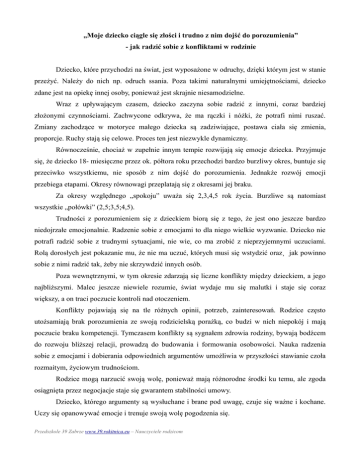 „Moje dziecko ciągle się złości i trudno z nim dojść do porozumienia” - jak radzić sobie z konfliktami w rodzinie Dziecko, które przychodzi na świat, jest wyposażone w odruchy, dzięki którym jest w stanie przeżyć. Należy do nich np. odruch ssania. Poza takimi naturalnymi umiejętnościami, dziecko zdane jest na opiekę innej osoby, ponieważ jest skrajnie niesamodzielne. Wraz z upływającym czasem, dziecko zaczyna sobie radzić z innymi, coraz bardziej złożonymi czynnościami. Zachwycone odkrywa, że ma rączki i nóżki, że potrafi nimi ruszać. Zmiany zachodzące w motoryce małego dziecka są zadziwiające, postawa ciała się zmienia, proporcje. Ruchy stają się celowe. Proces ten jest niezwykle dynamiczny. Równocześnie, chociaż w zupełnie innym tempie rozwijają się emocje dziecka. Przyjmuje się, że dziecko 18- miesięczne przez ok. półtora roku przechodzi bardzo burzliwy okres, buntuje się przeciwko wszystkiemu, nie sposób z nim dojść do porozumienia. Jednakże rozwój emocji przebiega etapami. Okresy równowagi przeplatają się z okresami jej braku. Za okresy względnego „spokoju” uważa się 2,3,4,5 rok życia. Burzliwe są natomiast wszystkie „połówki” (2,5;3,5;4,5). Trudności z porozumieniem się z dzieckiem biorą się z tego, że jest ono jeszcze bardzo niedojrzałe emocjonalnie. Radzenie sobie z emocjami to dla niego wielkie wyzwanie. Dziecko nie potrafi radzić sobie z trudnymi sytuacjami, nie wie, co ma zrobić z nieprzyjemnymi uczuciami. Rolą dorosłych jest pokazanie mu, że nie ma uczuć, których musi się wstydzić oraz¸ jak powinno sobie z nimi radzić tak, żeby nie skrzywdzić innych osób. Poza wewnętrznymi, w tym okresie zdarzają się liczne konflikty między dzieckiem, a jego najbliższymi. Malec jeszcze niewiele rozumie, świat wydaje mu się malutki i staje się coraz większy, a on traci poczucie kontroli nad otoczeniem. Konflikty pojawiają się na tle różnych opinii, potrzeb, zainteresowań. Rodzice często utożsamiają brak porozumienia ze swoją rodzicielską porażką, co budzi w nich niepokój i mają poczucie braku kompetencji. Tymczasem konflikty są sygnałem zdrowia rodziny, bywają bodźcem do rozwoju bliższej relacji, prowadzą do budowania i formowania osobowości. Nauka radzenia sobie z emocjami i dobierania odpowiednich argumentów umożliwia w przyszłości stawianie czoła rozmaitym, życiowym trudnościom. Rodzice mogą narzucić swoją wolę, ponieważ mają różnorodne środki ku temu, ale zgoda osiągnięta przez negocjacje staje się gwarantem stabilności umowy. Dziecko, którego argumenty są wysłuchane i brane pod uwagę, czuje się ważne i kochane. Uczy się opanowywać emocje i trenuje swoją wolę pogodzenia się. Przedszkole 39 Zabrze www.39.rokitnica.eu – Nauczyciele rodzicom Gdy dojdzie do konfliktu: - jeżeli sytuacja jest poważna i emocje wzięły górę- uspokój się, poproś o odłożenie tej sprawy do czasu, kiedy emocje opadną i na spokojnie będzie można rozmawiać - zarezerwuj sobie czas - wysłuchaj argumentów wszystkich stron, zapisz je (nawet te najdziwniejsze lub nieprawdopodobne) - wspólnie ustalcie, co jest bardziej, a co mniej ważne - określcie, co będzie potrzebne do realizacji waszych celów - realizujcie ustalone punkty waszej listy Jeżeli sprawa dotyczy małego dziecka nie lekceważ jego uczuć, ponieważ przestanie ci ufać. Naucz je, że jeżeli zrobi się coś złego, trzeba przeprosić i to naprawić, bo każdy popełnia błędy. Nie zawstydzaj go, nie krzycz. Używaj łagodnego, zrozumiałego języka, nie unoś się gniewem. Jeżeli dziecko krzyczy i próbuje coś na tobie wymusić nie ustępuj pod naciskami z jego strony. Rozmawiaj, pamiętając, że ustąpienie to nagroda za złe zachowanie. Pokaż, że każdą sprawę można załatwić w inny sposób. Ustal, na co możesz się zgodzić, a co w ogóle nie wchodzi w rachubę. Pozwól, żeby dziecko też było odpowiedzialne za jakiś fragment umowy. Na przykład może część swoich pieniędzy przeznaczyć na kupno nowego rowerka lub pomagać w porządkach przed swoim przyjęciem urodzinowym. Dziecko nauczy się, że wszystko ma swoją wartość, będzie miało przyjemne poczucie sprawstwa. Ponadto, dzieci uwielbiają spędzać czas ze swoimi bliskimi. Wspólnie pracując łączymy naukę z zabawą, budujemy więzi i dobre samopoczucie. Bliska więź ułatwia rozwiązywanie ewentualnych problemów i sprzeczek. Literatura: Louise Bates Ames , „Twoje dziecko ma trzy latka. Przyjaciel czy wróg?” Phantom Press International, Gdańsk 1993 Michel Ghazal „Zjedz zupkę i… bądź cicho” Wyd. Naukowe PWN, Warszawa 1995 Przedszkole 39 Zabrze www.39.rokitnica.eu – Nauczyciele rodzicom