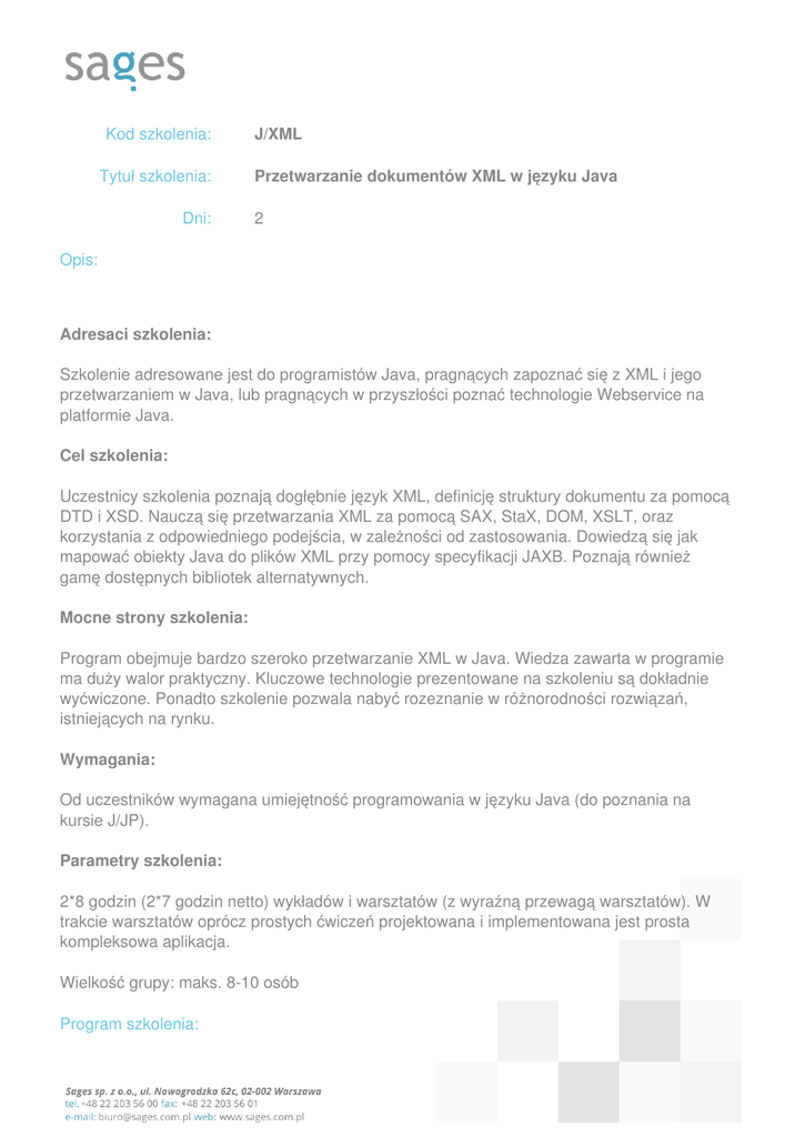 Kod szkolenia: Tytuł szkolenia: Dni: J/XML Przetwarzanie dokumentów XML w języku Java 2 Opis: Adresaci szkolenia: Szkolenie adresowane jest do programistów Java, pragnących zapoznać się z XML i jego przetwarzaniem w Java, lub pragnących w przyszłości poznać technologie Webservice na platformie Java. Cel szkolenia: Uczestnicy szkolenia poznają dogłębnie język XML, definicję struktury dokumentu za pomocą DTD i XSD. Nauczą się przetwarzania XML za pomocą SAX, StaX, DOM, XSLT, oraz korzystania z odpowiedniego podejścia, w zależności od zastosowania. Dowiedzą się jak mapować obiekty Java do plików XML przy pomocy specyfikacji JAXB. Poznają również gamę dostępnych bibliotek alternatywnych. Mocne strony szkolenia: Program obejmuje bardzo szeroko przetwarzanie XML w Java. Wiedza zawarta w programie ma duży walor praktyczny. Kluczowe technologie prezentowane na szkoleniu są dokładnie wyćwiczone. Ponadto szkolenie pozwala nabyć rozeznanie w różnorodności rozwiązań, istniejących na rynku. Wymagania: Od uczestników wymagana umiejętność programowania w języku Java (do poznania na kursie J/JP). Parametry szkolenia: 2*8 godzin (2*7 godzin netto) wykładów i warsztatów (z wyraźną przewagą warsztatów). W trakcie warsztatów oprócz prostych ćwiczeń projektowana i implementowana jest prosta kompleksowa aplikacja. Wielkość grupy: maks. 8-10 osób Program szkolenia: 1. XML I. konstrukcja języka XML II. definiowanie struktury dokumentu przy pomocy DTD III. definiowanie struktury dokumentu przy pomocy XSD 2. Java API for Xml processing (JAXP) i inne API związane z przetwarzaniem XML) I. Rodzaje przetwarzania XML: strumieniowe (pull i push), oparte na drzewie, oparte na wzorcach. II. Wybór właściwego sposobu przetwarzania XML III. Omówienie specyfikacji wchodzących w skład JAXP IV. Przetwarzanie zdarzeniowe na podstawie SAX i. Wprowadzenie do SAX i dostępne implementacje ii. Koncepcja i konfiguracja parsera iii. Zdarzenia dotyczące zawartości (ContentHandler) iv. Zdarzenia dotyczące błędów (ErrorHandler) v. Zdarzenia dotyczące DTD (DTDHandler) vi. Zdarzenia rezolwencji encji (EntityResolver) vii. Lokalizacja źródeł zdarzenia (DocumentLocator) V. Przetwarzanie drzew na podstawie DOM, oraz JDOM i. Wprowadzenie do DOM ii. Poziomy DOM iii. Kluczowe klasy i interfejsy iv. Wczytanie dokumentu v. Nawigacja po dokumencie vi. Konstruowanie dokumentu vii. Walidacja dokumentu viii. DOM , JDOM, dom4J VI. Biblioteka StAX i. API Stax ii. Cursor iii. Iterator iv. Rodzaje i obsługa zdarzeń v. Filtry vi. Czytanie i pisanie strumieni XML vii. Korzystanie ze Stax(XMLInputFactory, XMLOutputFactory, XMLEventFactory) VII. Przetwarzanie wzorców : XSL( XPath, XSLT, XSL-FO) i. Wprowadzenie do XSL ii. Omówienie XPATH iii. Wyrażenia iv. Template v. Adresowanie vi. Wyrażenia złożone vii. Transformacja dokumentu przy pomocy XSLT viii. Formatowanie dokumentów za pomocą XSL-FO ix. XQuery 3. Java Api for XML Binding(JAXB) I. Architektura JAXB II. Mapowanie Klasa Java XML Schema III. Marshalling, Unmarshalling IV. Walidacja V. Modyfikacja standardowych mapowań za pomocą adnotacji 4. Inne biblioteki związane z XML: Apache XmlBeans, JiBX, Castor, Jelly Powered by TCPDF (www.tcpdf.org)