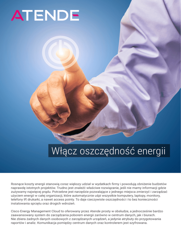Włącz oszczędność energii Rosnące koszty energii stanowią coraz większy udział w wydatkach firmy i powodują obniżenie budżetów naprawdę istotnych projektów. Trudno jest znaleźć właściwe rozwiązanie, jeśli nie mamy informacji gdzie zużywamy najwięcej prądu. Potrzebne jest narzędzie pozwalające z jednego miejsca zmierzyć i zarządzać użyciem energii w całej organizacji, które automatycznie uśpi wszystkie komputery, laptopy, monitory, telefony IP, drukarki, a nawet access pointy. To daje rzeczywiste oszczędności i to bez konieczności instalowania sprzętu oraz drogich wdrożeń. Cisco Energy Management Cloud to oferowany przez Atende prosty w obsłudze, a jednocześnie bardzo zaawansowany system do zarządzania poborem energii zarówno w centrum danych, jak i biurach. Nie zbiera żadnych danych osobowych z zarządzanych urządzeń, a jedynie atrybuty do przygotowania raportów i analiz. Komunikacja pomiędzy centrum danych oraz kontrolerem jest szyfrowana. KORZYŚCI Zwiększona wydajność energetyczna biur i centrum danych Niższe koszty działalności Efektywny kosztowo monitoring zużycia prądu pełna informacja w dowolnym momencie o wykorzystaniu każdego urządzenia w sieci, czasu jego działania i ilości zużywanej energii koszty energii związane z IT można obniżyć nawet o 35% dzięki pakietowi narzędzi i usług Cisco Energy Management Cloud usługa Cisco Energy Management Cloud eliminuje konieczność inwestowania w drogi sprzęt i wyposażenie, jak i redukuje koszty utrzymania tradycyjnie wdrażanych systemów. Wsparcie merytoryczne specjalistów Natychmiastowy efekt Proste skalowanie w razie potrzeby specjaliści Atende pomagają wdrożyć efektywne procedury wykorzystywania energii w oparciu o najlepsze światowe praktyki uruchomienie usługi trwa kilka dni. Nie ma potrzeby instalowania oprogramowania na zarządzanych urządzeniach, dlatego realne oszczędności można osiągnąć właściwie natychmiast jak każda usługa cloudowa, Cisco Energy Management Cloud skaluje się do bieżących potrzeb, nie ma potrzeby kupowania niczego na zapas Przewidywalne wydatki prosty sposób licencjonowania i rozliczeń usługi sprawia, że z góry można precyzyjnie zaplanować wydatki ATENDE S.A. 25 lat temu podłączyliśmy pierwsze polskie firmy do Internetu. Od tego czasu codziennie budujemy sukces naszych klientów poprzez tworzenie oraz wdrażanie innowacyjnego oprogramowania i najwyższej jakości rozwiązań IT. Atende S.A. jest wiodącą firmą w Polsce w zakresie integracji systemów teleinformatycznych. Wiedza oraz wieloletnie doświadczenie naszych inżynierów gwarantuje najlepsze usługi na rynku w obszarze m.in. outsourcingu IT, cloud computingu i cyberbezpieczeństwa. Zapraszamy do kontaktu Atende S.A. +48 22 29 57 300 [email protected] atende.pl