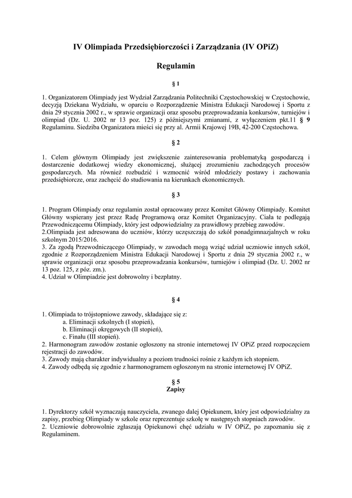 IV Olimpiada Przedsiębiorczości i Zarządzania (IV OPiZ) Regulamin §1 1. Organizatorem Olimpiady jest Wydział Zarządzania Politechniki Częstochowskiej w Częstochowie, decyzją Dziekana Wydziału, w oparciu o Rozporządzenie Ministra Edukacji Narodowej i Sportu z dnia 29 stycznia 2002 r., w sprawie organizacji oraz sposobu przeprowadzania konkursów, turniejów i olimpiad (Dz. U. 2002 nr 13 poz. 125) z późniejszymi zmianami, z wyłączeniem pkt.11 § 9 Regulaminu. Siedziba Organizatora mieści się przy al. Armii Krajowej 19B, 42-200 Częstochowa. §2 1. Celem głównym Olimpiady jest zwiększenie zainteresowania problematyką gospodarczą i dostarczenie dodatkowej wiedzy ekonomicznej, służącej zrozumieniu zachodzących procesów gospodarczych. Ma również rozbudzić i wzmocnić wśród młodzieży postawy i zachowania przedsiębiorcze, oraz zachęcić do studiowania na kierunkach ekonomicznych. §3 1. Program Olimpiady oraz regulamin został opracowany przez Komitet Główny Olimpiady. Komitet Główny wspierany jest przez Radę Programową oraz Komitet Organizacyjny. Ciała te podlegają Przewodniczącemu Olimpiady, który jest odpowiedzialny za prawidłowy przebieg zawodów. 2.Olimpiada jest adresowana do uczniów, którzy uczęszczają do szkół ponadgimnazjalnych w roku szkolnym 2015/2016. 3. Za zgodą Przewodniczącego Olimpiady, w zawodach mogą wziąć udział uczniowie innych szkół, zgodnie z Rozporządzeniem Ministra Edukacji Narodowej i Sportu z dnia 29 stycznia 2002 r., w sprawie organizacji oraz sposobu przeprowadzania konkursów, turniejów i olimpiad (Dz. U. 2002 nr 13 poz. 125, z póz. zm.). 4. Udział w Olimpiadzie jest dobrowolny i bezpłatny. §4 1. Olimpiada to trójstopniowe zawody, składające się z: a. Eliminacji szkolnych (I stopień), b. Eliminacji okręgowych (II stopień), c. Finału (III stopień). 2. Harmonogram zawodów zostanie ogłoszony na stronie internetowej IV OPiZ przed rozpoczęciem rejestracji do zawodów. 3. Zawody mają charakter indywidualny a poziom trudności rośnie z każdym ich stopniem. 4. Zawody odbędą się zgodnie z harmonogramem ogłoszonym na stronie internetowej IV OPiZ. §5 Zapisy 1. Dyrektorzy szkół wyznaczają nauczyciela, zwanego dalej Opiekunem, który jest odpowiedzialny za zapisy, przebieg Olimpiady w szkole oraz reprezentuje szkołę w następnych stopniach zawodów. 2. Uczniowie dobrowolnie zgłaszają Opiekunowi chęć udziału w IV OPiZ, po zapoznaniu się z Regulaminem. 3. Opiekun dokonuje elektronicznej rejestracji uczniów, w ustalonym okresie zapisów, zgodnie z zasadami określonymi na stronie internetowej Olimpiady oraz przesyła wydruk rejestracji do Organizatora. 4. Przesłany wydruk powinien zawierać pisemną zgody każdego ucznia, podpis Opiekuna i Dyrektora szkoły oraz pieczęć szkoły. 5. Zgłoszenie przesłane po wyznaczonym terminie lub z niepełnymi danymi nie będzie uwzględnione. §6 Eliminacje szkolne (I stopień ) 1.Eliminacje szkolne odbywają się jednocześnie we wszystkich zgłoszonych szkołach. 2. Do rywalizacji mogą przystąpić uczniowie, wymienieni w § 3 p.2 i 3, zgłoszeni przez szkoły, zgodnie z procedurą rejestracyjną. 3. Zawody mają formę pisemnego testu złożonego z 50 pytań zamkniętych i trwać będą 60 min. Zakres tematyczny pytań obejmuje program przedmiotu „Podstawy przedsiębiorczości”, znajomości zagadnień dotyczących zarządzania przedsiębiorstwem, podstawowych pojęć finansowych i znajomości bieżących wydarzeń życia gospodarczego. 4. Testy i karty odpowiedzi zostaną dostarczone do szkół przez Organizatora. 5. Rywalizacja odbywa przed Komisją (3-osobową) wyznaczoną przez Dyrektora szkoły. W przypadku gdy w szkole, do której uczęszcza uczeń, nie organizuje się eliminacji, może do nich przystąpić w szkole wskazanej przez Dyrektora szkoły. §7 Eliminacje okręgowe (II stopień) 1.Eliminacje okręgowe zostaną przeprowadzone w sześciu okręgach, w wyznaczonych Szkołach Partnerskich oraz u Organizatora, w następujących miastach: - okręg Północo-zachodni - Poznań, - okręg Północny – Olsztyn, - okręg centralny – Warszawa, - okręg Zachodni – Wrocław, - okręg Południowy – Częstochowa, - okręg Wschodni – Lublin. 2. Lista Szkół Partnerskich, wyłonionych przez Komitet Główny, zostanie zamieszczona na stronie internetowej Olimpiady 3. W przypadku braku możliwości przeprowadzenia eliminacji w wybranej Szkole Partnerskiej, uczestnicy z tego regionu będą rywalizować w innym okręgu lub obiektach Organizatora w Częstochowie. 4. Komisje Okręgowe, powołane przez Przewodniczącego Olimpiady, składają się z minimum 5 osób. Przewodniczącym Komisji Okręgowej jest przedstawiciel Organizatora lub Dyrektor Szkoły Partnerskiej a Członkami zaproszeni Nauczyciele – Opiekunowie uczestników tych Eliminacji. 5. Przydział uczniów do poszczególnych Komisji zostanie ogłoszony wraz z wynikami Eliminacji Szkolnych, w oparciu o lokalizację szkoły, możliwości organizacyjne Szkół Partnerskich i dojazdu uczestników. 6. Do Eliminacji Okręgowych zakwalifikowane zostaną osoby, które uzyskały w zawodach I stopnia minimum kwalifikacyjne, wyznaczone przez Komitet Główny. 7. Eliminacje Okręgowe mają formę testu pisemnego, złożonego z 60 pytań zamkniętych, na rozwiązanie którego przewidziano 60 minut. Zakres tematyczny pytań dotyczy zagadnień wymienionych w załączniku nr 1 do regulaminu. 8. Testy i karty odpowiedzi zostaną dostarczone przez Organizatora, najpóźniej w dniu zawodów. §8 Finał (III stopień) 1. Finał IV OPiZ zostanie przeprowadzony w Auli Wydziału Zarządzania w Częstochowie i trwać będzie 90 minut. 2. Do Finału dopuszczonych zostanie 50 osób, które uzyskały najwyższą ilość punktów w Eliminacjach Okręgowych. W przypadku uzyskania tej samej ilości punków o awansie do finału zdecyduje suma punków z zawodów I i II stopnia a jeśli nie przyniesie to roz