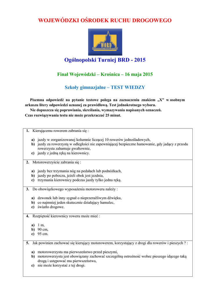 WOJEWÓDZKI OŚRODEK RUCHU DROGOWEGO Ogólnopolski Turniej BRD - 2015 Finał Wojewódzki – Krośnica – 16 maja 2015 Szkoły gimnazjalne – TEST WIEDZY Pisemna odpowiedź na pytanie testowe polega na zaznaczeniu znakiem „X” w osobnym arkuszu litery odpowiedzi uznanej za prawidłową. Test jednokrotnego wyboru. Nie dopuszcza się poprawiania, skreślania, wymazywania napisanych oznaczeń. Czas rozwiązywania testu nie może przekraczać 25 minut. 1. Kierującemu rowerem zabrania się : a) jazdy w zorganizowanej kolumnie liczącej 10 rowerów jednośladowych, b) jazdy za rowerzystą w odległości nie zapewniającej bezpieczne hamowanie, gdy jadący z przodu rowerzysta zahamuje gwałtownie, c) jazdy z jedną ręką na kierownicy. 2. Motorowerzyście zabrania się : a) jazdy bez trzymania nóg na pedałach lub podnóżkach, b) jazdy po poboczu, jeżeli obok jest jezdnia, c) trzymania kierownicy podczas jazdy tylko jedna ręką. 3. Do obowiązkowego wyposażenia motoroweru należy : a) dzwonek lub inny sygnał o nieprzeraźliwym dźwięku, b) co najmniej jeden skutecznie działający hamulec, c) światło drogowe. 4. Rozpiętość kierownicy roweru może mieć : a) 1 m, b) 90 cm, c) 95 cm. 5. Jak powinien zachować się kierujący motorowerem, korzystający z drogi dla rowerów i pieszych ? : a) motorowerzysta ma pierwszeństwo przed pieszymi, b) motorowerzysta jest obowiązany zachować szczególną ostrożność wobec pieszego idącego taką drogą i ustępować mu pierwszeństwa, c) nie może korzystać z tej drogi. 6. Jakim pojazdem jest motorower ? : a) silnikowym, b) dwu lub trójkołowym zaopatrzonym w silnik spalinowy o pojemności skokowej do 50 cm3, c) jednośladowym lub dwuśladowym poruszanym silnikiem elektrycznym. 7. Jak powinien zachować się uczestnik ruchu, gdy nadjeżdża pojazd uprzywilejowany ? : a) zwiększyć prędkość i jechać przed nim w bezpiecznej odległości, b) zawsze zatrzymać się, c) obowiązkowo ułatwić przejazd, a w szczególności niezwłocznie usunąć się z jego drogi i w razie potrzeby zatrzymać się. 8. Kierujący rowerem może wyprzedzać inne powoli jadące pojazdy z ich prawej strony z wyjątkiem : a) motoroweru, b) roweru, c) czterokołowca lekkiego. 9. Rower może być wyposażony w uruchamiany naciskiem na pedały pomocniczy napęd elektryczny zasilany prądem : a) o napięciu nie wyższym niż 24 V o znamionowej mocy ciągłej nie większej niż 500 W, b) o napięciu nie wyższym niż 48 V o znamionowej mocy ciągłej nie większej niż 250 W, c) o napięciu nie wyższym niż 230 V o znamionowej mocy ciągłej nie większej niż 500 W. 10. Po jezdni porusza się pieszy zgodnie z przepisami ruchu drogowego. Z której strony pieszego przejeżdża motorowerzysta podczas wyprzedzania go ? : a) z prawej, b) z lewej, c) z dowolnej. 11. Kiedy można wyprzedzać pojazd uprzywilejowany ? : a) zawsze, gdy jedzie z mniejszą prędkością od naszego pojazdu, b) tylko wtedy, gdy kierujący pojazdem uprzywilejowanym da mu odpowiedni sygnał, c) poza obszarem zabudowanym. 12. W rowerze z pomocniczym napędem elektrycznym moc wyjściowa zmniejsza się stopniowo i spada do zera po przekroczeniu prędkości : a) 20 km/h, b) 30 km/h, c) 25 km/h. 13. Wózek rowerowy może mieć szerokość : a) 85 cm, b) 90 cm, c) 1 m. 14. Długość zorganizowanej kolumny motorowerów nie może przekraczać : a) 100 m, b) 150 m, c) nie jest określona w przepisach o ruchu drogowym. 15. Czy na rowerze jednoosobowym, jednośladowym można przewozić inne osoby ? : a) nie można, b) osoba, która ukończyła 17 lat może przewozić dziecko do lat 7 pod warunkiem, że jest ono umieszczone na dodatkowym siodełku zapewniającym bezpieczną jazdę, c) można zawsze bez dodatkowych warunków. 16. Jeżeli pieszy przechodzi na skrzyżowaniu po jezdni bez wydzielonego przejścia dla pieszych, to ma pierwszeństwo przed motorowerem : a) jadącym prosto, b) skręcającym w drogę, po której idzie pieszy, c) tylko w strefie zamieszkania. 17. Podczas przewożenia motorowerem dziecka do lat 7 można jechać z dozwoloną prędkością : a) 50 km/h, b) 40 km/h, c) 45 km/h. 18. Jakim pojazdem może być motorower ? : a) tylko jednośladowym, b) dwu lub trzykołowym zaopatrzonym w silnik elektryczny o mocy nie większej niż 4 kW, c) wielośladowym zaopatrzonym w silnik spalinowy o pojemności skokowej nie przekraczającej 50 cm3. 19. Gdzie można zaparkować motorower w strefie zamieszkania ? : a) na chodnikach pozostawiając 1,5 m jego szerokości, b) tylko w wyznaczonych miejscach, c) w strefie zamieszkania nie wolno parkować motoroweru. 20. Korzystanie z chodnika lub drogi dla pieszych przez kierującego rowerem jest dozwolone wyjątkowo, gdy : a) opiekuje się on osobą w wieku powyżej 10 lat kierującą rowerem, b) warunki pogodowe zagrażają bezpieczeństwu rowerzysty na jezdni (śnieg, silny wiatr, ulewa, gołoledź, gęsta mgła), c) szerokość chodnika wzdłuż drogi, po której ruch pojazdów jest dozwolony z prędkością większą niż 50 km/h, wynosi co najmniej 1,5 m i brakuje wydzielonej drogi dla rowerów oraz pasa ruchu dla rowerów. 21. Widząc ten znak, kierujący motorowerem: a) musi ustąpić pierwszeństwa nadjeżdżającemu z prawej strony, b) ma pierwszeństwo przed pojazdem nadjeżdżającym z prawej strony, c) może skręcić w prawo. 22. Ten znak oznacza : a) pierwszeństwo dla nadjeżdżających z przeciwka, b) pierwszeństwo na zwężonym odcinku drogi, c) odcinek drogi o ruchu dwukierunkowym. 23. Za tym znakiem : a) można jechać motorowerem, ale tylko jednośladowym, b) jest droga dla rowerów jednośladowych, c) mogą jechać rowerzyści na rowerach wielośladowych. 24. Za tym znakiem obowiązuje zakaz wjazdu : a) rowerów i motorowerów, b) rowerów wielośladowych, c) motorowerów. 25. Ten znak oznacza : a) początek pasa ruchu powolnego, b) obowiązek jazdy prawym pasem ruchu z prędkością mniejszą niż 30 km/h, c) strefę ograniczonej pr