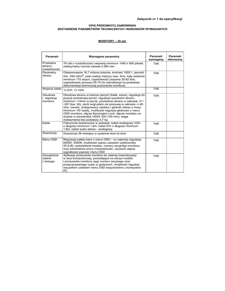 Załącznik nr 1 do specyfikacji OPIS PRZEDMIOTU ZAMÓWIENIA ZESTAWIENIE PARAMETRÓW TECHNICZNYCH I WARUNKÓW WYMAGANYCH MONITORY – 25 szt. Parametr Wymagane parametry Parametr wymagany Przekątna ekranu, rozdzielczość Parametry obrazu 19 cali o rozdzielczości natywnej minimum 1440 x 900 pikseli, maksymalny rozmiar piksela 0.284 mm. TAK Odwzorowanie 16,7 miliona kolorów, kontrast 1000:1, jasność min. 250 cd/m2 ,czas reakcji matrycy max. 5ms, kąty widzenia minimum 170 stopni, częstotliwość pozioma 30-82 kHz, częstotliwość pionowa 55-75 Hz (weryfikacja na podstawie dokumentacji technicznej producenta monitora) TAK Wejścia wideo 1x DVI, 1x VGA TAK Obudowa i regulacja monitora TAK Kable Obudowa ekranu w kolorze jasnym (biała, szara), regulacja do pozycji portretowej (pivot), regulacja wysokości ekranu minimum 110mm w pionie, pochylenie ekranu w zakresie -5° / +20° (tzw. tilt), obrót wzgl ędem osi pionowej w zakresie +/-45 (tzw. swivel), zintegrowany zasilacz i głośniki stereo o mocy minimum 1W kaŜdy, moŜliwość regulacji głośności z menu OSD monitora, złącze Kensington Lock, złącze montaŜu na ścianie w standardzie VESA 100 (100 mm), waga maksymalna bez podstawy 3,7 kg Fabrycznie dostarczone w zestawie: kabel analogowy VGA o długości minimum 1,8m, kabel DVI o długości minimum 1,8m, kabel audio stereo - analogowy TAK Gwarancja Gwarancja 36 miesięcy w systemie door-to-door TAK Menu OSD Regulacja palety barw z menu OSD – co najmniej regulacja 6500K, 9300K, moŜliwość zapisu ustawień uŜytkownika (R,G,B); wyświetlanie modelu, numeru seryjnego monitora oraz parametrów pracy (rozdzielczość, uŜywane złącze sygnałowe) poprzez menu OSD Aplikacja producenta monitora do zdalnej inwentaryzacji w sieci komputerowej, pozwalająca na odczyt modelu i producenta monitora, jego numeru seryjnego oraz przepracowanego czasu w godzinach, moŜliwość regulacji wszystkich ustawień menu OSD bezpośrednio z komputera PC TAK Zarządzanie zdalne I obsługa TAK Parametr oferowany Certyfikaty -TCO Displays 5.0 i normy, -Energy Star 5.0 (EPA 5.0), zuŜycie energii max. 19W wg dokumentacja standardów EPA, zuŜycie energii w trybie stand-by oraz w trybie oszczędzania energii nie więcej niŜ 0,4W – parametry potwierdzone w oficjalnej dokumentacji technicznej producenta monitora -EN60950, CE -ISO13406-2 (klasa II) -Certyfikaty jakości ISO 9001 i 14001 -RoHS, WEE TAK _________________________________ miejscowość, data _____________________________ podpis osób wskazanych w dokumencie uprawniającym do występowania w obrocie prawnym lub posiadających pełnomocnictwo OPIS PRZEDMIOTU ZAMÓWIENIA ZESTAWIENIE PARAMETRÓW TECHNICZNYCH I WARUNKÓW WYMAGANYCH KOMPUTERY – 25 szt. Parametr wymagany Parametr Wymagane parametry Procesor Pamięć RAM Procesor klasy x86 posiadający dwa rdzenie, częstotliwość zegara nie mniej niŜ 3,06, cache 4M ( np. Intel Core i3-540 lub równowaŜny ) 4GB DDR3-1066 (moŜliwość rozbudowy do 16GB), min 1 wolny slot Dysk twardy 500 GB (min. SATA II; min. 7200 rpm, NCQ/3Gbit, 8mb cache) TAK Napędy DVD-RW SATA z oprogramowaniem do nagrywania płyt DVD nie będącym częścią składową systemu operacyjnego -Zaprojektowana i wyprodukowana przez producenta komputera -zgodna ze standardem UEFI -wsparcie producenta komputera dla procesorów czterordzeniowych -oznaczenie modelu płyty głównej i logo producenta komputera trwale naniesione na etapie produkcji - w standardzie µATX - zintegrowany kontroler 4 x SATA II - min. 1x PCI Express 2.0 o szybkości x16 - min. 1x PCI Express o szybkości x4 - min. 1x PCI Express o szybkości x1 - min. 1x PCI 32bit -MoŜliwość zabezpieczenia hasłem dostępu do systemu operacyjnego i dostępu do BIOS komputera - zabezpieczenia te muszą działać niezaleŜnie od siebie -MoŜliwość zabezpieczenia dysku twardego w sposób uniemoŜliwiający moŜliwość odczytu danych po podłączeniu dysku do innego komputera -MoŜliwość deaktywacji karty muzycznej i sieciowej z BIOS komputera -MoŜliwość odczytania z BIOS komputera informacji o numerze seryjnym, numerze inwentaryzacyjnym (asset tag), moŜliwość odczytania z BIOS dokładnych informacji o procesorze – co najmniej model, typ, częstotliwości FSB, prędkości rzeczywista, ilość pamięci cache, -MoŜliwość wyłączenia pracy wielordzeniowej procesora z pozycji BIOS (konieczne w przypadku niektórych aplikacji), moŜliwość wyłączenia portów COM, USB, FDD z BIOS komputera bez pośrednictwa systemu operacyjnego ani bez pośrednictwa urządzeń zewnętrznych, blokada zapisu na dyskietkach 3,5 cala TAK Płyta główna i BIOS TAK TAK TAK Parametr oferowany -Rozwiązanie sprzętowe zintegrowane w płycie głównej komputera zapewniające moŜliwość przywrócenia BIOS w przypadku jego uszkodzenia (ataki wirusów itp.) lub nieudanej aktualizacji bez pośrednictwa jakichkolwiek urządzeń zewnętrznych i w sytuacji, gdy obraz na monitorze nie jest wyświetlany i/lub nie ma moŜliwości wprowadzania znaków za pomocą konsoli tekstowej -Wsparcie na poziomie BIOS dla czytników kart procesorowych Smart Card Karta -Zintegrowana dźwiękowa -w standardzie High Definition -oparta o układ sprzętowy ALC663 lub nowszy -moŜliwość wyłączenia karty muzycznej w BIOS Karta 10/100/1000 Mbps WoL, PXE, sieciowa -moŜliwość wyłączenia karty sieciowej w BIOS, -moŜliwość odczytania adresu MAC karty z BIOS komputera Karta -zintegrowana, 256 MB pamięci własnej lub współdzielonej graficzna z pamięcią systemową (nie wymagane jest uzupełnienie pamięci RAM) min. 12 portów USB 2.0 (w tym 2 na panelu przednim) Porty I/O -1x DVI -1x audio line-in, 2x audio line-out, 2x wejście mikrofonowe (wejście mikrofonowe i line-out zdublowane na panelu przednim obudowy) -nie dopuszcza się moŜliwości zasłonięcia złączy USB znajdujących się na panelu przednim jakimikolwiek zaślepkami, maskownicami utrudniającymi wzrokową weryfikację ich uŜycia 
