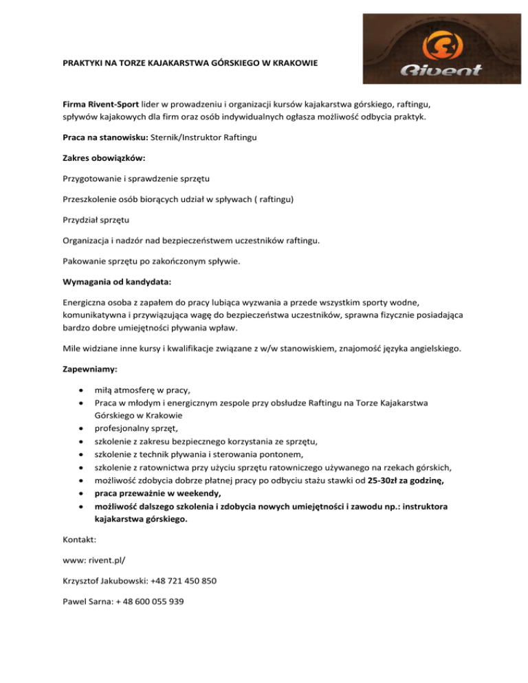 PRAKTYKI NA TORZE KAJAKARSTWA GÓRSKIEGO W KRAKOWIE Firma Rivent-Sport lider w prowadzeniu i organizacji kursów kajakarstwa górskiego, raftingu, spływów kajakowych dla firm oraz osób indywidualnych ogłasza możliwość odbycia praktyk. Praca na stanowisku: Sternik/Instruktor Raftingu Zakres obowiązków: Przygotowanie i sprawdzenie sprzętu Przeszkolenie osób biorących udział w spływach ( raftingu) Przydział sprzętu Organizacja i nadzór nad bezpieczeństwem uczestników raftingu. Pakowanie sprzętu po zakończonym spływie. Wymagania od kandydata: Energiczna osoba z zapałem do pracy lubiąca wyzwania a przede wszystkim sporty wodne, komunikatywna i przywiązująca wagę do bezpieczeństwa uczestników, sprawna fizycznie posiadająca bardzo dobre umiejętności pływania wpław. Mile widziane inne kursy i kwalifikacje związane z w/w stanowiskiem, znajomość języka angielskiego. Zapewniamy: miłą atmosferę w pracy, Praca w młodym i energicznym zespole przy obsłudze Raftingu na Torze Kajakarstwa Górskiego w Krakowie profesjonalny sprzęt, szkolenie z zakresu bezpiecznego korzystania ze sprzętu, szkolenie z technik pływania i sterowania pontonem, szkolenie z ratownictwa przy użyciu sprzętu ratowniczego używanego na rzekach górskich, możliwość zdobycia dobrze płatnej pracy po odbyciu stażu stawki od 25-30zł za godzinę, praca przeważnie w weekendy, możliwość dalszego szkolenia i zdobycia nowych umiejętności i zawodu np.: instruktora kajakarstwa górskiego. Kontakt: www: rivent.pl/ Krzysztof Jakubowski: +48 721 450 850 Pawel Sarna: + 48 600 055 939