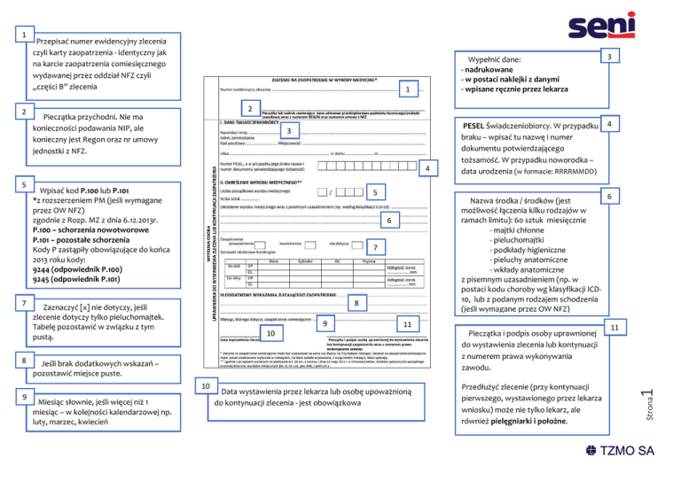1 7 8 3 Wpisać kod P.100 lub P.101 *z rozszerzeniem PM (jeśli wymagane przez OW NFZ) zgodnie z Rozp. MZ z dnia 6.12.2013r. P.100 – schorzenia nowotworowe P.101 – pozostałe schorzenia Kody P zastąpiły obowiązujące do końca 2013 roku kody: 9244 (odpowiednik P.100) 9245 (odpowiednik P.101) PESEL Świadczeniobiorcy. W przypadku braku – wpisać tu nazwę i numer dokumentu potwierdzającego tożsamość. W przypadku noworodka – data urodzenia (w formacie: RRRRMMDD) 4 Nazwa środka / środków (jest możliwość łączenia kilku rodzajów w ramach limitu): 60 sztuk miesięcznie - majtki chłonne - pieluchomajtki - podkłady higieniczne - pieluchy anatomiczne - wkłady anatomiczne z pisemnym uzasadnieniem (np. w postaci kodu choroby wg klasyfikacji ICD10, lub z podanym rodzajem schodzenia (jeśli wymagane przez OW NFZ) 6 5 6 7 8 Zaznaczyć [x] nie dotyczy, jeśli zlecenie dotyczy tylko pieluchomajtek. Tabelę pozostawić w związku z tym pustą. 9 11 10 Jeśli brak dodatkowych wskazań – pozostawić miejsce puste. 10 9 3 2 Pieczątka przychodni. Nie ma konieczności podawania NIP, ale konieczny jest Regon oraz nr umowy jednostki z NFZ. 4 5 Wypełnić dane: - nadrukowane - w postaci naklejki z danymi - wpisane ręcznie przez lekarza Miesiąc słownie, jeśli więcej niż 1 miesiąc – w kolejności kalendarzowej np. luty, marzec, kwiecień Data wystawienia przez lekarza lub osobę upoważnioną do kontynuacji zlecenia - jest obowiązkowa Pieczątka i podpis osoby uprawnionej do wystawienia zlecenia lub kontynuacji z numerem prawa wykonywania zawodu. Przedłużyć zlecenie (przy kontynuacji pierwszego, wystawionego przez lekarza wniosku) może nie tylko lekarz, ale również pielęgniarki i położne. 11 1 2 Przepisać numer ewidencyjny zlecenia czyli karty zaopatrzenia - identyczny jak na karcie zaopatrzenia comiesięcznego wydawanej przez oddział NFZ czyli „części B” zlecenia Strona 1 Tą część wypełnia tylko NFZ (nie jak wcześniej Realizator) – w przypadku pierwszego zlecenia. W kolejnych – należy zostawić tą część pustą. 14 Wpisać pełne dane: TZMO SA , przykładowo: PIELUCHOMAJTKI SUPER SENI MEDIUM 12 Jeśli zlecenie dotyczy więcej niż 1 produktu wpisuje się tu liczby sztuk sprzedanych wyrobów oraz cenę jednostkową detaliczną za 1 sztukę każdego produktu. 13 NFZ dopuszcza pełną dowolność zamiany produktów w ramach danego kodu. 14 Tu realizator wpisuje przykładowo: W cenie detalicznej wyrobu wpisać ceny jednostkowe produktu oraz cenę całego pakietu. 13 Pieczęć imienna farmaceuty / sprzedawcy, jego podpis i data potwierdzenia. 16 Czytelnym pismem, (sugerowane) drukowanymi literami – data odbioru wyrobu medycznego, imię i nazwisko osoby odbierającej oraz jej PESEL (lub nazwa i numer dokumentu potwierdzającego tożsamość) 17 16 17 18 18 Czytelny podpis 2 Cena detaliczna wyrobu medycznego2,25 zł/łączna cena wydanych wyrobów medycznych 135 zł Kwota refundacji 63 zł Dopłata świadczeniobiorcy 72 zł 15 Pieczęć realizatora (odcisk pieczęci) (nr umowy z NFZ wypełnia TZMO SA przybija swoją pieczatkę i uzupełnia nr umowy z NFZ). Strona 15 12 UWAGI! UWAGI! Całość zlecenia musi być wypełniona w sposób czytelny. Od 1 czerwca obowiązuje nowy sposób naliczania udziału własnego pacjenta w limicie finansowania w przypadku, gdy świadczeniobiorca korzysta z mniejszej liczby wyrobów medycznych niż określone w rozporządzeniu. Dotyczy gdy zamiast 60 szt. pieluchomajtek , odbiera tylko 30 szt. Bez względu na to, ile sztuk wyrobu medycznego zleci lekarz, pacjent ma prawo odebrać mniej sztuk i skorzystać z pełnego limitu przysługującego na dany okres. Przy naliczaniu refundacji należy brać pod uwagę: (1) faktyczny koszt wydanego wyrobu medycznego (2) limit finansowania ze środków zgodnie z rozporządzeniem Ministra Zdrowia oraz (3) wysokość udziału własnego w limicie finansowania. Kod P.100 - limit 77 zł - refundacja 100% Kod P.101 - limit 90 zł - refundacja 70% Jeżeli wartość wydanego wyrobu medycznego jest niższa niż limit finansowania ze środków publicznych (wartość wyrobu jest mniejsza od 90 zł dla kodu P.101 i od 77 zł dla kodu P.100), wysokość refundacji jest liczona od wartości wydanego wyrobu. Jeżeli wartość wydanego wyrobu medycznego jest wyższa niż limit (wartość wyrobu jest większa od 90 zł dla kodu P.101 i od 77 zł dla kodu P.100), wysokość refundacji jest liczona od limitu. 3 Zlecenie, w przeciwieństwie do poprzednich wytycznych, ważne jest przez cały okres zaopatrzenia, na który zostało wystawione przez lekarza, a nie jak wcześniej 30 dni od daty wystawienia przez lekarza. Zlecenie bez względu na datę wystawienia jest ważne od pierwszego miesiąca wskazanego przez lekarza lub inne uprawnione osoby. Bez względu na to, czy zostało wystawione na 1, 2 czy 3 miesiące, można je zrealizować w pierwszym, drugim lub trzecim miesiącu, z zastrzeżeniem, że realizując zlecenie w miesiącu drugim – nie możemy zrealizować już zlecenia na miesiąc pierwszy – czyli nie ma możliwości realizacji wniosków wstecz. Strona Ewentualne poprawki muszą być przekreślone, poprawione parafką i pieczęcią lekarza, pielęgniarki lub położnej lub osoby realizującej zlecenie.