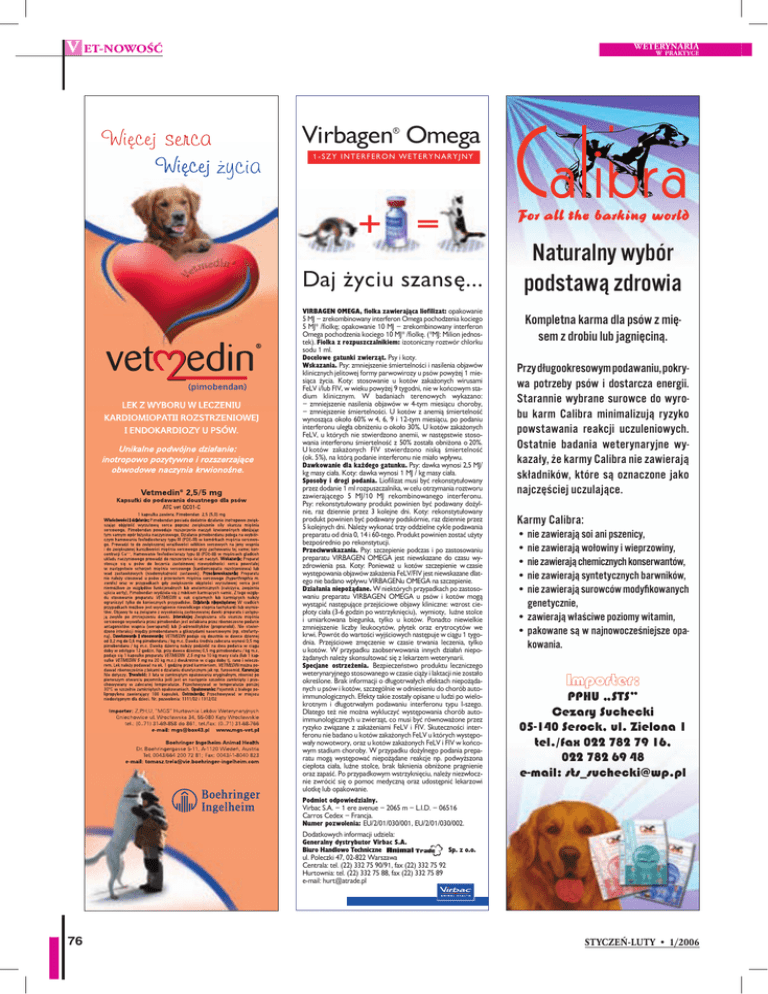 V ET-NOWOŚĆ WETERYNARIA W PRAKTYCE Virbagen Omega ® 1-SZY INTERFERON WETERYNARYJNY + = Daj życiu szansę... VIRBAGEN OMEGA, fiolka zawierająca liofilizat: opakowanie 5 MJ − zrekombinowany interferon Omega pochodzenia kociego 5 MJ* /fiolkę; opakowanie 10 MJ − zrekombinowany interferon Omega pochodzenia kociego 10 MJ* /fiolkę. (*MJ: Milion jednostek). Fiolka z rozpuszczalnikiem: izotoniczny roztwór chlorku sodu 1 ml. Docelowe gatunki zwierząt. Psy i koty. Wskazania. Psy: zmniejszenie śmiertelności i nasilenia objawów klinicznych jelitowej formy parwowirozy u psów powyżej 1 miesiąca życia. Koty: stosowanie u kotów zakażonych wirusami FeLV i/lub FIV, w wieku powyżej 9 tygodni, nie w końcowym stadium klinicznym. W badaniach terenowych wykazano: − zmniejszenie nasilenia objawów w 4-tym miesiącu choroby, − zmniejszenie śmiertelności. U kotów z anemią śmiertelność wynosząca około 60% w 4, 6, 9 i 12-tym miesiącu, po podaniu interferonu uległa obniżeniu o około 30%. U kotów zakażonych FeLV, u których nie stwierdzono anemii, w następstwie stosowania interferonu śmiertelność z 50% została obniżona o 20%. U kotów zakażonych FIV stwierdzono niską śmiertelność (ok. 5%), na którą podanie interferonu nie miało wpływu. Dawkowanie dla każdego gatunku. Psy: dawka wynosi 2,5 MJ/ kg masy ciała. Koty: dawka wynosi 1 MJ / kg masy ciała. Sposoby i drogi podania. Liofilizat musi być rekonstytułowany przez dodanie 1 ml rozpuszczalnika, w celu otrzymania roztworu zawierającego 5 MJ/10 MJ rekombinowanego interferonu. Psy: rekonstytułowany produkt powinien być podawany dożylnie, raz dziennie przez 3 kolejne dni. Koty: rekonstytułowany produkt powinien być podawany podskórnie, raz dziennie przez 5 kolejnych dni. Należy wykonać trzy oddzielne cykle podawania preparatu od dnia 0, 14 i 60-tego. Produkt powinien zostać użyty bezpośrednio po rekonstytucji. Przeciwwskazania. Psy: szczepienie podczas i po zastosowaniu preparatu VIRBAGEN OMEGA jest niewskazane do czasu wyzdrowienia psa. Koty: Ponieważ u kotów szczepienie w czasie występowania objawów zakażenia FeLV/FIV jest niewskazane dlatego nie badano wpływu VIRBAGENu OMEGA na szczepienie. Działania niepożądane. W niektórych przypadkach po zastosowaniu preparatu VIRBAGEN OMEGA u psów i kotów mogą wystąpić następujące przejściowe objawy kliniczne: wzrost ciepłoty ciała (3-6 godzin po wstrzyknięciu), wymioty, luźne stolce i umiarkowana biegunka, tylko u kotów. Ponadto niewielkie zmniejszenie liczby leukocytów, płytek oraz erytrocytów we krwi. Powrót do wartości wyjściowych następuje w ciągu 1 tygodnia. Przejściowe zmęczenie w czasie trwania leczenia, tylko u kotów. W przypadku zaobserwowania innych działań niepożądanych należy skonsultować się z lekarzem weterynarii. Specjane ostrzeżenia. Bezpieczeństwo produktu leczniczego weterynaryjnego stosowanego w czasie ciąży i laktacji nie zostało określone. Brak informacji o długotrwałych efektach niepożądanych u psów i kotów, szczególnie w odniesieniu do chorób autoimmunologicznych. Efekty takie zostały opisane u ludzi po wielokrotnym i długotrwałym podawaniu interferonu typu I-szego. Dlatego też nie można wykluczyć występowania chorób autoimmunologicznych u zwierząt, co musi być równoważone przez ryzyko związane z zakażeniami FeLV i FIV. Skuteczności interferonu nie badano u kotów zakażonych FeLV u których występowały nowotwory, oraz u kotów zakażonych FeLV i FIV w końcowym stadium choroby. W przypadku dożylnego podania preparatu mogą występować niepożądane reakcje np. podwyższona ciepłota ciała, luźne stolce, brak łaknienia obniżone pragnienie oraz zapaść. Po przypadkowym wstrzyknięciu, należy niezwłocznie zwrócić się o pomoc medyczną oraz udostępnić lekarzowi ulotkę lub opakowanie. Naturalny wybór podstawą zdrowia Kompletna karma dla psów z mięsem z drobiu lub jagnięciną. Przy długookresowym podawaniu, pokrywa potrzeby psów i dostarcza energii. Starannie wybrane surowce do wyrobu karm Calibra minimalizują ryzyko powstawania reakcji uczuleniowych. Ostatnie badania weterynaryjne wykazały, że karmy Calibra nie zawierają składników, które są oznaczone jako najczęściej uczulające. Karmy Calibra: • nie zawierają soi ani pszenicy, • nie zawierają wołowiny i wieprzowiny, • nie zawierają chemicznych konserwantów, • nie zawierają syntetycznych barwników, • nie zawierają surowców modyfikowanych genetycznie, • zawierają właściwe poziomy witamin, • pakowane są w najnowocześniejsze opakowania. Importer: PPHU „STS” Cezary Suchecki 05-140 Serock, ul. Zielona 1 tel./fax 022 782 79 16, 022 782 69 48 e-mail: [email protected] Podmiot odpowiedzialny. Virbac S.A. − 1 ere avenue − 2065 m − L.I.D. − 06516 Carros Cedex − Francja. Numer pozwolenia: EU/2/01/030/001, EU/2/01/030/002. Dodatkowych informacji udziela: Generalny dystrybutor Virbac S.A. Biuro Handlowo Techniczne Sp. z o.o. ul. Poleczki 47, 02-822 Warszawa Centrala: tel. (22) 332 75 90/91, fax (22) 332 75 92 Hurtownia: tel. (22) 332 75 88, fax (22) 332 75 89 e-mail: [email protected] 76 STYCZEŃ-LUTY • 1/2006