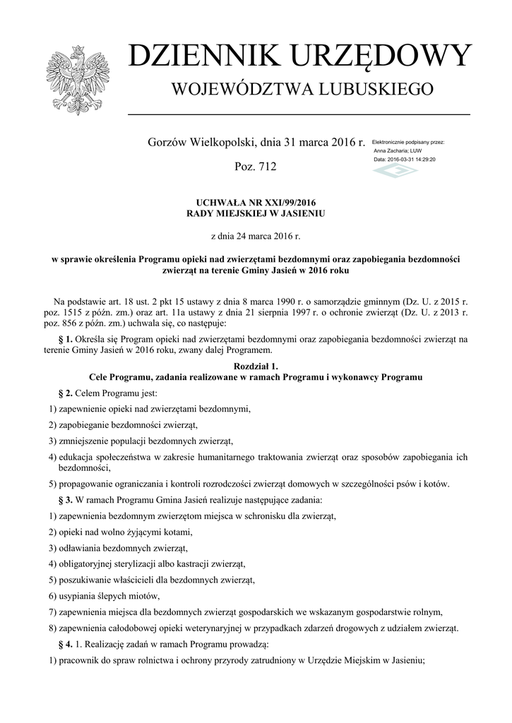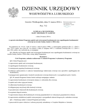DZIENNIK URZĘDOWY WOJEWÓDZTWA LUBUSKIEGO Gorzów Wielkopolski, dnia 31 marca 2016 r. Elektronicznie podpisany przez: Anna Zacharia; LUW Poz. 712 Data: 2016-03-31 14:29:20 UCHWAŁA NR XXI/99/2016 RADY MIEJSKIEJ W JASIENIU z dnia 24 marca 2016 r. w sprawie określenia Programu opieki nad zwierzętami bezdomnymi oraz zapobiegania bezdomności zwierząt na terenie Gminy Jasień w 2016 roku Na podstawie art. 18 ust. 2 pkt 15 ustawy z dnia 8 marca 1990 r. o samorządzie gminnym (Dz. U. z 2015 r. poz. 1515 z późn. zm.) oraz art. 11a ustawy z dnia 21 sierpnia 1997 r. o ochronie zwierząt (Dz. U. z 2013 r. poz. 856 z późn. zm.) uchwala się, co następuje: § 1. Określa się Program opieki nad zwierzętami bezdomnymi oraz zapobiegania bezdomności zwierząt na terenie Gminy Jasień w 2016 roku, zwany dalej Programem. Rozdział 1. Cele Programu, zadania realizowane w ramach Programu i wykonawcy Programu § 2. Celem Programu jest: 1) zapewnienie opieki nad zwierzętami bezdomnymi, 2) zapobieganie bezdomności zwierząt, 3) zmniejszenie populacji bezdomnych zwierząt, 4) edukacja społeczeństwa w zakresie humanitarnego traktowania zwierząt oraz sposobów zapobiegania ich bezdomności, 5) propagowanie ograniczania i kontroli rozrodczości zwierząt domowych w szczególności psów i kotów. § 3. W ramach Programu Gmina Jasień realizuje następujące zadania: 1) zapewnienia bezdomnym zwierzętom miejsca w schronisku dla zwierząt, 2) opieki nad wolno żyjącymi kotami, 3) odławiania bezdomnych zwierząt, 4) obligatoryjnej sterylizacji albo kastracji zwierząt, 5) poszukiwanie właścicieli dla bezdomnych zwierząt, 6) usypiania ślepych miotów, 7) zapewnienia miejsca dla bezdomnych zwierząt gospodarskich we wskazanym gospodarstwie rolnym, 8) zapewnienia całodobowej opieki weterynaryjnej w przypadkach zdarzeń drogowych z udziałem zwierząt. § 4. 1. Realizację zadań w ramach Programu prowadzą: 1) pracownik do spraw rolnictwa i ochrony przyrody zatrudniony w Urzędzie Miejskim w Jasieniu; Dziennik Urzędowy Województwa Lubuskiego –2– Poz. 712 2) Łużycka Spółdzielnia Socjalna, prowadząca Schronisko dla Zwierząt w Piotrowie nr 2, Przewóz (68-132); 3) lekarz weterynarii w zakresie zadań wskazanych w § 6 ust. 2 pkt 4 i 5, § 8, § 10 i § 12; 4) społeczni opiekunowie wolno żyjących kotów; 5) gospodarstwo rolne, o którym mowa w § 11; 6) podmioty wskazane w § 14. 2. Koordynatorem Programu jest Burmistrz Jasienia. Rozdział 2. Opis poszczególnych zadań realizowanych w ramach Programu § 5. Zapewnienie bezdomnym zwierzętom miejsca w schronisku Zapewnienie bezdomnym zwierzętom z terenu Gminy Jasień miejsca w schronisku dla zwierząt realizuje się poprzez: 1) zawarcie umowy z Łużycką Spółdzielnią Socjalną w Piotrowie, prowadzącą Schronisko dla Zwierząt w Piotrowie nr 2, Przewóz (68-132), spełniającą warunki określone w ustawie z dnia 11 marca 2004 r. o ochronie zdrowia zwierząt oraz zwalczaniu chorób zakaźnych zwierząt (Dz.U z 2014 r. poz. 1539 z późn. zm.), 2) przyjmowanie zgłoszeń o błąkających się zwierzętach przez pracownika do spraw rolnictwa i ochrony przyrody zatrudnionego w Urzędzie Miejskim w Jasieniu. § 6. Opieka nad wolno żyjącymi kotami 1. Opieka nad wolno żyjącymi kotami z terenu Gminy Jasień realizowana jest przez Gminę Jasień przy współpracy ze społecznymi opiekunami kotów wolno żyjących i lekarza weterynarii. 2. Opieka, o której mowa w ust. 1 obejmuje w szczególności: 1) ustalenie miejsc, w których przebywają koty wolno żyjące; 2) tworzenie i prowadzenie rejestru społecznych opiekunów kotów wolno żyjących; 3) zapewnienie dokarmiania przy udziale społecznych opiekunów kotów wolno żyjących; miejscami właściwymi do dokarmiania kotów wolnożyjących, będą tereny w strefie zabudowy i tereny działkowe; 4) zapewnienie opieki rannym lub chorym wolno żyjącym kotom. § 7. Odławianie bezdomnych zwierząt 1. Odławianiu podlegają zwierzęta domowe i gospodarskie, które uciekły, zabłąkały się lub zostały porzucone przez człowieka, a nie istnieje możliwość ustalenia właściciela lub innej osoby, pod której opieką zwierzę dotąd pozostawało. 2. Bezdomne zwierzęta na terenie Gminy Jasień podlegają stałemu odławianiu. Zgłoszenia od mieszkańców Gminy Jasień o bezdomnych zwierzętach przyjmuje pracownik do spraw rolnictwa i ochrony przyrody zatrudniony w Urzędzie Miejskim w Jasieniu, który zawiadamia Łużycką Spółdzielnię Socjalną, prowadzącą Schronisko dla Zwierząt w Piotrowie nr 2, Przewóz (68-132) o potrzebie odłowienia bezdomnego zwierzęcia. 3. Odławianie zwierząt bezdomnych może być prowadzone za pomocą specjalistycznego sprzętu, który nie będzie stwarzał zagrożenia dla życia i zdrowia wyłapanych zwierząt, a także nie będzie zadawał im cierpienia. 4. Środki do przewozu zwierząt powinny spełniać warunki określone w ustawie o ochronie zwierząt. 5. Łużycka Spółdzielnia Socjalna, prowadząca Schronisko dla Zwierząt w Piotrowie nr 2, Przewóz (68-132), przeprowadza odławianie psów z terenu Gminy Jasień. Odłowione psy Łużycka Spółdzielnia Socjalna przewozi do Schroniska dla Zwierząt w Piotrowie nr 2 Przewóz (68-132). 6. Odłowione zwierzęta gospodarskie podlegają przewiezieniu do gospodarstwa rolnego, o którym mowa w § 11. Przewóz odłowionych zwierząt gospodarskich zapewnia pracownik do spraw rolnictwa i ochrony przyrody zatrudniony w Urzędzie Miejskim w Jasieniu. § 8. Obligatoryjna sterylizacja albo kastracja zwierząt w schronisku Dziennik Urzędowy Województwa Lubuskiego –3– Poz. 712 Obligatoryjną sterylizację albo kastrację zwierząt realizuje lekarz weterynarii świadczący usługi w Łużyckiej Spółdzielni Socjalnej w Piotrowie, prowadzącej Schronisko dla Zwierząt w Piotrowie nr 2, gm. Przewóz (68-132), względem zwierząt przyjętych do Schroniska. § 9. Poszukiwanie właścicieli dla bezdomnych zwi