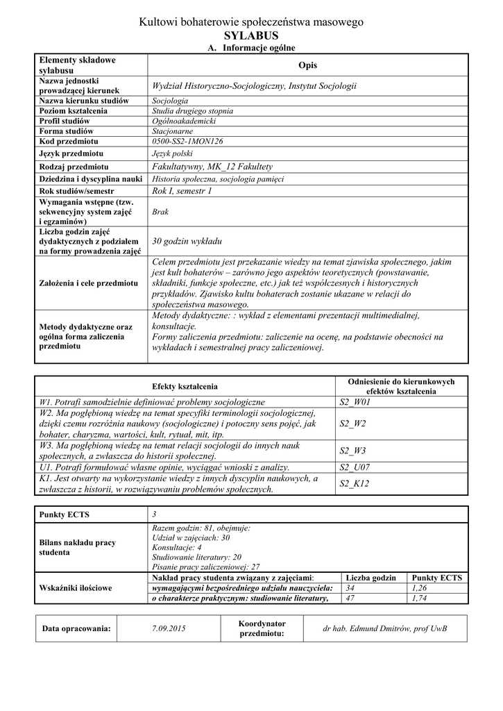 Kultowi bohaterowie społeczeństwa masowego SYLABUS A. Informacje ogólne Elementy składowe sylabusu Opis Nazwa jednostki prowadzącej kierunek Nazwa kierunku studiów Poziom kształcenia Profil studiów Forma studiów Kod przedmiotu Język przedmiotu Wydział Historyczno-Socjologiczny, Instytut Socjologii Rodzaj przedmiotu Dziedzina i dyscyplina nauki Rok studiów/semestr Wymagania wstępne (tzw. sekwencyjny system zajęć i egzaminów) Liczba godzin zajęć dydaktycznych z podziałem na formy prowadzenia zajęć Fakultatywny, MK_12 Fakultety Założenia i cele przedmiotu Metody dydaktyczne oraz ogólna forma zaliczenia przedmiotu Socjologia Studia drugiego stopnia Ogólnoakademicki Stacjonarne 0500-SS2-1MON126 Język polski Historia społeczna, socjologia pamięci Rok I, semestr 1 Brak 30 godzin wykładu Celem przedmiotu jest przekazanie wiedzy na temat zjawiska społecznego, jakim jest kult bohaterów – zarówno jego aspektów teoretycznych (powstawanie, składniki, funkcje społeczne, etc.) jak też współczesnych i historycznych przykładów. Zjawisko kultu bohaterach zostanie ukazane w relacji do społeczeństwa masowego. Metody dydaktyczne: : wykład z elementami prezentacji multimedialnej, konsultacje. Formy zaliczenia przedmiotu: zaliczenie na ocenę, na podstawie obecności na wykładach i semestralnej pracy zaliczeniowej. Odniesienie do kierunkowych efektów kształcenia Efekty kształcenia W1. Potrafi samodzielnie definiować problemy socjologiczne S2_W01 W2. Ma pogłębioną wiedzę na temat specyfiki terminologii socjologicznej, dzięki czemu rozróżnia naukowy (socjologiczne) i potoczny sens pojęć, jak bohater, charyzma, wartości, kult, rytuał, mit, itp. W3. Ma pogłębioną wiedzę na temat relacji socjologii do innych nauk społecznych, a zwłaszcza do historii społecznej. U1. Potrafi formułować własne opinie, wyciągać wnioski z analizy. K1. Jest otwarty na wykorzystanie wiedzy z innych dyscyplin naukowych, a zwłaszcza z historii, w rozwiązywaniu problemów społecznych. Punkty ECTS Bilans nakładu pracy studenta Wskaźniki ilościowe Data opracowania: S2_W2 S2_W3 S2_U07 S2_K12 3 Razem godzin: 81, obejmuje: Udział w zajęciach: 30 Konsultacje: 4 Studiowanie literatury: 20 Pisanie pracy zaliczeniowej: 27 Nakład pracy studenta związany z zajęciami: wymagającymi bezpośredniego udziału nauczyciela: o charakterze praktycznym: studiowanie literatury, 7.09.2015 Koordynator przedmiotu: Liczba godzin 34 47 Punkty ECTS 1,26 1,74 dr hab. Edmund Dmitrów, prof UwB SYLABUS B. Informacje szczegółowe Elementy składowe sylabusu Opis Nazwa przedmiotu Kultowi bohaterowie społeczeństwa masowego 0500-SS2-1MON126 Kod przedmiotu Nazwa kierunku Socjologia Nazwa jednostki prowadzącej Wydział Historyczno-Socjologiczny kierunek Język przedmiotu Język polski. Rok studiów/ semestr Rok I, semestr 1 Liczba godzin zajęć dydaktycznych 30 godzin wykładu oraz forma prowadzenia zajęć Podać w wypadku, gdy nie wypełniono części A. Liczba punktów ECTS Prowadzący dr hab. Edmund Dmitrów, prof. UwB 1. Pamięć zbiorowa i jej rola w życiu społeczeństwa. Historia–pamięć–mit. Treści 2. Cechy społeczeństwa masowego. merytoryczne 3. Co to jest kult bohaterów. Tradycje kultu bohaterów. przedmiotu Kult pośmiertny. Nieznany żołnierz Włodzimierz Lenin – bohater zakonserwowany. Józef Piłsudski – pierwszy idol społeczeństwa masowego w Polsce. Józef Stalin i „kult jednostki“ w państwie totalitarnym. Adolf Hitler – „Wódz” narodu i państwa totalitarnego. Kim – dynastia koreańskich bogów. Reżyseria kultu – bohaterowie Iwo Jimy. Bohaterowie pracy socjalistycznej. Bohaterowie popkultury: Elvis i inni idole młodzieży (4 godz.) 13. Bohater beatyfikowany Efekt Weryfikacja praca W1. Potrafi samodzielnie definiować problemy socjologiczne zaliczeniowa. W2. Ma pogłębioną wiedzę na temat specyfiki terminologii praca socjologicznej, dzięki czemu rozróżnia naukowy (socjologiczne) i zaliczeniowa potoczny sens pojęć, jak bohater, charyzma, wartości, kult, rytuał, mit, itp. W3. Ma pogłębioną wiedzę na temat relacji socjologii do innych nauk praca społecznych, a zwłaszcza do historii społecznej. zaliczeniowa praca U1. Potrafi formułować własne opinie, wyciągać wnioski z analizy. zaliczeniowa K1. Jest otwarty na wykorzystanie wiedzy z innych dyscyplin praca naukowych, a zwłaszcza z historii, w rozwiązywaniu problemów zaliczeniowa społecznych. Warunkiem zaliczenia przedmiotu jest obecność na wykładach oraz poprawne napisanie pracy zaliczenowej. Nieobecność na wykładzie trzeba zaliczyć w formie pisemnego opracowania tematu, w oparciu o literaturę. Trzy nieusprawiedliwione nieobecności na wykładzie kwalifikują do niezaliczenia przedmiotu. 4. 5. 6. 7. 8. 9. 10. 11. 12. Efekty kształcenia wraz ze sposobem ich weryfikacji Forma i warunki zaliczenia przedmiotu Wykaz literatury podstawowej i uzupełniającej Literatura podstawowa: -Stefan Czarnowski, Kult bohaterów i jego społeczne podłoże. Święty Patryk bohater narodowy Irlandii, [w:] Dzieła t. IV, Warszawa 1989 -Heidi Hein–Kirchen, Kult Piłsudskiego i jego znaczenie dla państwa polskiego 1926– 1939, Warszawa 2009 -Robert Kupiecki, Natchnienie milionów. Kult Stalina w Polsce 1944–1956, Warszawa 1993. -Monika Milewska, Bogowie u władzy: Od Aleksandra Wielkiego do Kim Dzong Ila. Antropologiczne studium mitów boskiego władcy, Gdańsk 2012 Literatura uzupełniająca: -Eugeniusz Duraczyński, Stalin. Twórca i dyktator supermocarstwa, Pułtusk–Warszawa 2012. -Alan Bullock, Hitler. Studium tyranii. Warszawa 1970. ………………………………. podpis osoby składającej sylabus