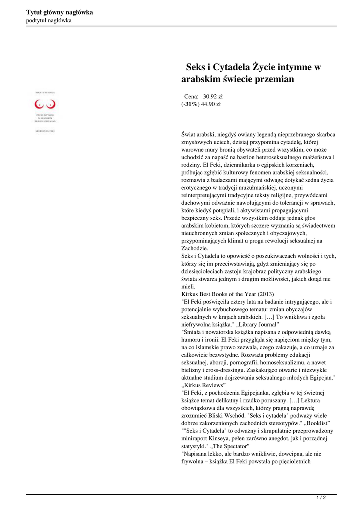 Tytuł główny nagłówka podtytuł nagłówka Seks i Cytadela Życie intymne w arabskim świecie przemian Cena: 30.92 zł (-31%) 44.90 zł Świat arabski, niegdyś owiany legendą nieprzebranego skarbca zmysłowych uciech, dzisiaj przypomina cytadelę, której warowne mury bronią obywateli przed wszystkim, co może uchodzić za napaść na bastion heteroseksualnego małżeństwa i rodziny. El Feki, dziennikarka o egipskich korzeniach, próbując zgłębić kulturowy fenomen arabskiej seksualności, rozmawia z badaczami mającymi odwagę dotykać sedna życia erotycznego w tradycji muzułmańskiej, uczonymi reinterpretującymi tradycyjne teksty religijne, przywódcami duchowymi odważnie nawołującymi do tolerancji w sprawach, które kiedyś potępiali, i aktywistami propagującymi bezpieczny seks. Przede wszystkim oddaje jednak głos arabskim kobietom, których szczere wyznania są świadectwem nieuchronnych zmian społecznych i obyczajowych, przypominających klimat u progu rewolucji seksualnej na Zachodzie. Seks i Cytadela to opowieść o poszukiwaczach wolności i tych, którzy się im przeciwstawiają, gdyż zmieniający się po dziesięcioleciach zastoju krajobraz polityczny arabskiego świata stwarza jednym i drugim możliwości, jakich dotąd nie mieli. Kirkus Best Books of the Year (2013) "El Feki poświęciła cztery lata na badanie intrygującego, ale i potencjalnie wybuchowego tematu: zmian obyczajów seksualnych w krajach arabskich. […] To wnikliwa i zgoła niefrywolna książka." „Library Journal” "Śmiała i nowatorska książka napisana z odpowiednią dawką humoru i ironii. El Feki przygląda się napięciom między tym, na co islamskie prawo zezwala, czego zakazuje, a co uznaje za całkowicie bezwstydne. Rozważa problemy edukacji seksualnej, aborcji, pornografii, homoseksualizmu, a nawet bielizny i cross-dressingu. Zaskakująco otwarte i niezwykle aktualne studium dojrzewania seksualnego młodych Egipcjan." „Kirkus Reviews” "El Feki, z pochodzenia Egipcjanka, zgłębia w tej świetnej książce temat delikatny i rzadko poruszany. […] Lektura obowiązkowa dla wszystkich, którzy pragną naprawdę zrozumieć Bliski Wschód. "Seks i cytadela" podważy wiele dobrze zakorzenionych zachodnich stereotypów." „Booklist” ""Seks i Cytadela" to odważny i skrupulatnie przeprowadzony miniraport Kinseya, pełen zarówno anegdot, jak i porządnej statystyki." „The Spectator” "Napisana lekko, ale bardzo wnikliwie, dowcipna, ale nie frywolna – książka El Feki powstała po pięcioletnich 1/2 Tytuł główny nagłówka podtytuł nagłówka badaniach nad obyczajami seksualnymi regionu przechodzącego polityczną transformację. Autorka pisze z wrażliwością i oburzeniem, które przywodzą na myśl społecznych rewolucjonistów." „Boston Globe” "To jednocześnie poważne, ale i dowcipne studium obyczajowości seksualnej arabskiego świata." „The Independent” "Dzięki rozmowom ze zwykłymi ludźmi, seksuologami i socjologami El Feki udało się stworzyć oryginalny portret młodych ludzi." „Financial Times” "Jakkolwiek temat brzmi ekscytująco, sposób, w jaki El Feki o nim pisze, jest poważny. Szczerze, bezstronnie, unikając sensacji, która mogłaby skusić słabszego reportera, mającego do czynienia z tematami tak trudnymi, jak okaleczanie kobiet czy przemoc domowa." „San Francisco Chronicle” "El Feki pisząc o seksie, pozwala zarazem lepiej zrozumieć kraj i społeczeństwo, którymi wstrząsnęła rewolucja." „The Economist” 2/2 Powered by TCPDF (www.tcpdf.org)