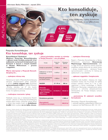 Informator Banku Millennium – styczeń 2016 AKTUALNOŚCI Kto konsoliduje, ten zyskuje Spłacaj jedną niższą ratę i zyskaj dodatkowe środki, na co tylko chcesz. oprocentowanie oprocentowanie 4,99% 4,99% dla dla kwoty kwoty konsolidowanych konsolidowanych środków środków prowizja 0% od kwoty konsolidowanych środków JEDNA NISKA RATA Pożyczka Konsolidacyjna Kto konsoliduje, ten zyskuje Konsolidujesz? Zyskujesz! Wybierz Pożyczkę Konsolidacyjną i spłacaj swoje kredyty, pożyczki oraz zadłużenie na kartach kredytowych czy limitach w koncie z innych banków w Banku Millennium – prosto i wygodnie. Warto skorzystać z Pożyczki Konsolidacyjnej, bo... ... zyskujesz niższą ratę Wystarczy, że razem z Pożyczką Konsolidacyjną zakupisz ubezpieczenie spłaty pożyczki, a oprócz jednej niższej raty otrzymasz oprocentowanie 4,99% w ramach Promocji „Wielka obniżka rat II” dla kwoty konsolidowanych środków. Dodatkowo od tej kwoty nie zapłacisz prowizji. ... realizujesz marzenia i plany Nadeszła nowa era w realizowaniu Twoich marzeń i planów. Z Pożyczką Konsolidacyjną możesz płacić mniej i otrzymać więcej. Wraz z niższą ratą możesz liczyć na dodatkowe środki, które wydasz, na co tylko chcesz. ... więcej pieniędzy zostaje co miesiąc w Twojej kieszeni – oto przykład: Kredyt Kwota do spłaty Miesięczna płatność Kredyt na samochód 17 000 zł 548 zł Zadłużenie na karcie kredytowej 5 670 zł 283 zł Pożyczka gotówkowa na remont kuchni 4 500 zł 154 zł 27 170 zł 985 zł 36 520,84 zł 520,66 zł RAZEM Pożyczka Konsolidacyjna z ubezpieczeniem spłaty w Banku Millennium ... zyskujesz Gwarancję Razem z Pożyczką Konsolidacyjną w Banku Millennium otrzymasz Gwarancję Najniższego Oprocentowania. Jeśli w ciągu 30 dni po zawarciu umowy pożyczki znajdziesz tańszą ofer tę dla tej samej kwoty i okresu kredytowania – obniżymy Twoje oprocentowanie i zwrócimy Ci różnicę już zapłaconych u nas odsetek. ... spłacasz wygodnie i bezpiecznie Dodatkowa gotówka 2 000 zł Oszczędności w budżecie domowym 464,34 zł Zaplanuj swój budżet i dopasuj do niego wysokość nowej raty. To proste, bo spłatę możesz rozłożyć nawet na 7 lat, a raty regulować z konta osobistego w Banku Millennium. Skorzystaj z ubezpieczenia spłaty pożyczki, a ochronę ubezpieczeniową dostosujemy do Twojej bieżącej sytuacji zawodowej. ... pomożemy Ci załatwić wszelkie formalności Skorzystaj z Pożyczki Konsolidacyjnej: • odwiedź najbliższy oddział Banku Millennium • zadzwoń do TeleMillennium 801 331 331 Promocja „Wielka obniżka rat II” dotyczy Pożyczek Konsolidacyjnych z ubezpieczeniem spłaty pożyczki. Wyliczenia dla przykładu z tabeli dla Pożyczki Konsolidacyjnej z Promocją „Wielka obniżka rat II”: całkowita kwota pożyczki: 36 520,84 zł, okres kredytowania 84 miesiące, oprocentowanie stałe: 5,26% w skali roku (oprocentowanie liczone od całkowitej kwoty kredytu powiększonej o koszty kredytu, o ile są kredytowane), prowizja (kredytowana): 0% (0 zł), ubezpieczenie (kredytowane): 7350,84 zł, rata pożyczki (równa): 520,66 zł, I. rata płatna po 30 dniach od dnia uruchomienia pożyczki, kwota odsetek: 7214,24 zł, całkowita kwota do zapłaty: 43 735,08 zł, RRSO (rzeczywista roczna stopa oprocentowania): 13,09%. Wyliczenia w tabeli są orientacyjne, przykładowe i mają charakter niewiążący. Służą wyłącznie celom informacyjnym i nie stanowią ofer ty, rekomendacji ani zaproszenia (dla jednej osoby lub grupy osób) do zawarcia umowy pożyczki na zaprezentowanych warunkach. W szczególności, informacja ta nie stanowi ofer ty w rozumieniu Ustawy z dnia 23.04.1964 r. – Kodeks Cywilny i nie jest również usługą doradztwa inwestycyjnego, finansowego, podatkowego, prawnego ani jakiegokolwiek innego. Informacja nie uwzględnia oceny r yzyka kredytowego i nie wypełnia obowiązków informacyjnych wynikających z Ustawy z dnia 12.05.2011r. o kredycie konsumenckim. Promocja „Wielka obniżka rat II” dotyczy Pożyczek Konsolidacyjnych z ubezpieczeniem spłaty pożyczki. Warunki Promocji są zawar te w Regulaminie Promocji „Wielka obniżka rat II”, Promocja jest ważna do 31 marca 2016 roku. Opłaty, prowizje i oprocentowanie są pobierane zgodnie z Cennikiem Pożyczki Gotówkowej. Szczegóły dotyczące zasad i warunków udzielania pożyczek są zawar te w Regulaminie kredytów i pożyczek udzielanych Klientom indywidualnym przez Bank Millennium SA. Szczegółowe zasady udzielania ochrony ubezpieczeniowej w ramach ubezpieczenia Bezpieczna Pożyczka przez Towarzystwo Ubezpieczeń Europa S.A. i Towarzystwo Ubezpieczeń na Życie Europa S.A. zawar te są w Warunkach Ubezpieczenia Bezpieczna Pożyczka. Wymienione wyżej Regulaminy, Warunki Ubezpieczenia oraz Cennik są dostępne w oddziałach Banku i na stronie www.bankmillennium.pl. Bank każdorazowo ocenia zdolność i wiar ygodność kredytową Wnioskodawcy przed udzieleniem pożyczki; w uzasadnionych przypadkach może odmówić jej udzielenia. Przykład reprezentatywny: całkowita kwota pożyczki: 24 497,01 zł, okres kredytowania 74 miesiące, oprocentowanie stałe: 8,10% w skali roku (oprocentowanie liczone od całkowitej kwoty kredytu powiększonej o koszty kredytu, o ile są kredytowane), prowizja (kredytowana): 2,63% (644,27 zł), bez ubezpieczenia, rata pożyczki (równa): 432,76 zł, I. rata płatna po 30 dniach od dnia uruchomienia pożyczki, kwota odsetek: 6882,63 zł, całkowita kwota do zapłaty: 32 023,91 zł, RRSO (rzeczywista roczna stopa oprocentowania): 9,40%. Kredyt Hipoteczny „Mieszkanie dla Młodych” Zamieszkaj w wymarzonych warunkach! Marzysz o własnym mieszkaniu? Dzięki Kredytowi Hipotecznemu w Banku Millennium możesz zrealizować swoje plany mieszkaniowe, korzystając z ułatwień, jakie daje program „Mieszkanie dla Młodych”. Przyjdź do Banku Millennium, sprawdź jakie dofinansowanie możesz dostać i spełnij marzenia o własnym