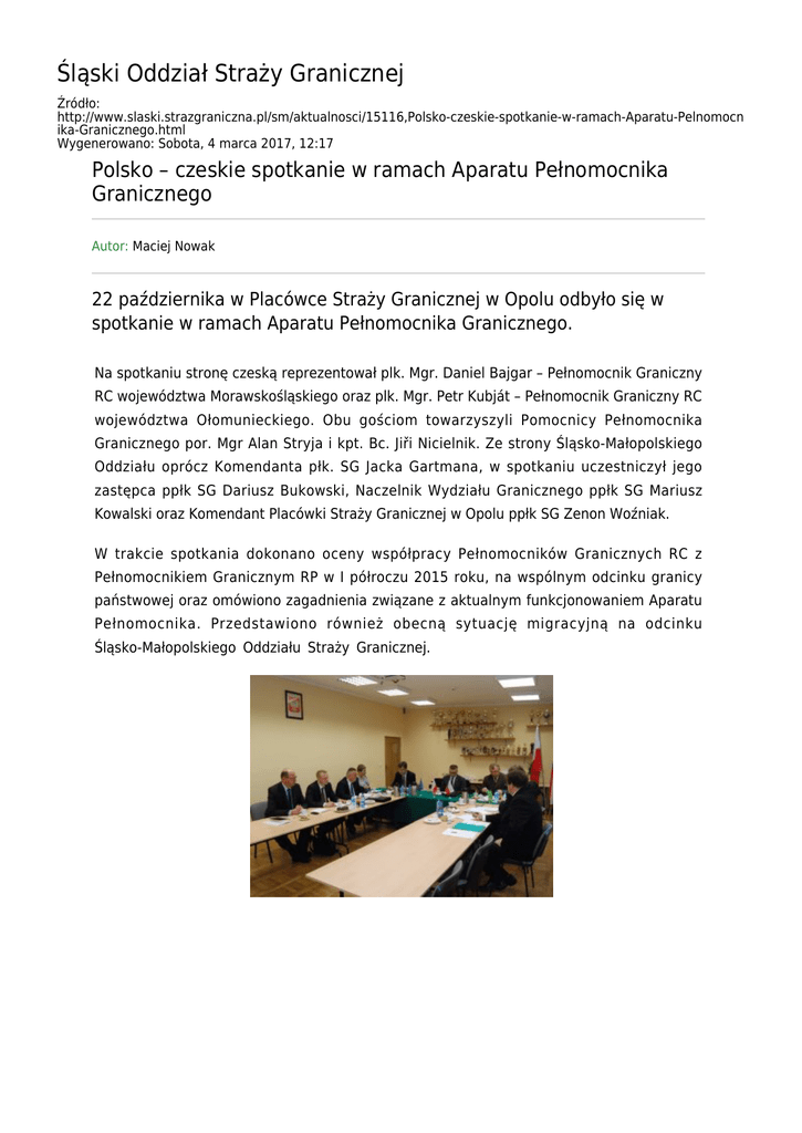 Śląski Oddział Straży Granicznej Źródło: http://www.slaski.strazgraniczna.pl/sm/aktualnosci/15116,Polsko-czeskie-spotkanie-w-ramach-Aparatu-Pelnomocn ika-Granicznego.html Wygenerowano: Sobota, 4 marca 2017, 12:17 Polsko – czeskie spotkanie w ramach Aparatu Pełnomocnika Granicznego Autor: Maciej Nowak 22 października w Placówce Straży Granicznej w Opolu odbyło się w spotkanie w ramach Aparatu Pełnomocnika Granicznego. Na spotkaniu stronę czeską reprezentował plk. Mgr. Daniel Bajgar – Pełnomocnik Graniczny RC województwa Morawskośląskiego oraz plk. Mgr. Petr Kubját – Pełnomocnik Graniczny RC województwa Ołomunieckiego. Obu gościom towarzyszyli Pomocnicy Pełnomocnika Granicznego por. Mgr Alan Stryja i kpt. Bc. Jiři Nicielnik. Ze strony Śląsko-Małopolskiego Oddziału oprócz Komendanta płk. SG Jacka Gartmana, w spotkaniu uczestniczył jego zastępca ppłk SG Dariusz Bukowski, Naczelnik Wydziału Granicznego ppłk SG Mariusz Kowalski oraz Komendant Placówki Straży Granicznej w Opolu ppłk SG Zenon Woźniak. W trakcie spotkania dokonano oceny współpracy Pełnomocników Granicznych RC z Pełnomocnikiem Granicznym RP w I półroczu 2015 roku, na wspólnym odcinku granicy państwowej oraz omówiono zagadnienia związane z aktualnym funkcjonowaniem Aparatu Pełnomocnika. Przedstawiono również obecną sytuację migracyjną na odcinku Śląsko-Małopolskiego Oddziału Straży Granicznej.