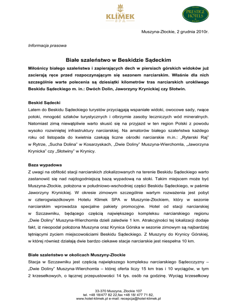 Muszyna-Złockie, 2 grudnia 2010r. Informacja prasowa Białe szaleństwo w Beskidzie Sądeckim Miłośnicy białego szaleństwa i zapierających dech w piersiach górskich widoków już zacierają ręce przed rozpoczynającym się sezonem narciarskim. Właśnie dla nich szczególnie warte polecenia są dziesiątki kilometrów tras narciarskich urokliwego Beskidu Sądeckiego m. in.: Dwóch Dolin, Jaworzyny Krynickiej czy Słotwin. Beskid Sądecki Latem do Beskidu Sądeckiego turystów przyciągają wspaniałe widoki, owocowe sady, rwące potoki, mnogość szlaków turystycznych i olbrzymie zasoby leczniczych wód mineralnych. Natomiast zimą niewątpliwie warto skusić się na przyjazd w ten region Polski z powodu wysoko rozwiniętej infrastruktury narciarskiej. Na amatorów białego szaleństwa każdego roku od listopada do kwietnia czekają liczne ośrodki narciarskie m.in.: „Ryterski Raj” w Rytrze, „Sucha Dolina” w Kosarzyskach, „Dwie Doliny” Muszyna-Wierchomla, „Jaworzyna Krynicka” czy „Słotwiny” w Krynicy. Baza wypadowa Z uwagi na obfitość stacji narciarskich zlokalizowanych na terenie Beskidu Sądeckiego warto zastanowić się nad najdogodniejszą bazą wypadową na stoki. Takim miejscem może być Muszyna-Złockie, położona w południowo-wschodniej części Beskidu Sądeckiego, w paśmie Jaworzyny Krynickiej. W okresie zimowym szczególnie wartym rozważenia jest pobyt w czterogwiazdkowym Hotelu Klimek SPA w Muszynie-Złockiem, który w sezonie narciarskim wprowadza specjalne pakiety promocyjne. Hotel od stacji narciarskiej w Szczawniku, będącego częścią największego kompleksu narciarskiego regionu „Dwie Doliny” Muszyna-Wierchomla dzieli zaledwie 1 km. Atrakcyjności tej lokalizacji dodaje fakt, iż nieopodal położona Muszyna oraz Krynica Górska w sezonie zimowym są najbardziej tętniącymi życiem miejscowościami Beskidu Sądeckiego. Z Muszyny do Krynicy Górskiej, w której również działają dwie bardzo ciekawe stacje narciarskie jest niespełna 10 km. Białe szaleństwo w okolicach Muszyny-Złockie Stacja w Szczawniku jest częścią największego kompleksu narciarskiego Sądecczyzny – „Dwie Doliny” Muszyna-Wierchomla – której oferta liczy 15 km tras i 10 wyciągów, w tym 2 krzesełkowych, o łącznej przepustowości 14 tys. osób na godzinę. Wyciąg krzesełkowy 33-370 Muszyna, Złockie 107 tel. +48 18/477 82 22,fax +48 18/ 477 71 82, www.hotel-klimek.pl e-mail: [email protected] w Szczawniku liczy 1525 m długości, przy 273 m różnicy poziomów. Następnie przechodzi w orczyk pn. „Szczawnik II”. Trasa jest w pełni oświetlona, szeroka i sztucznie naśnieżana, dzięki czemu można tu szusować do późnych godzin nocnych. Dobre warunki śniegowe stacja zawdzięcza specyficznemu klimatowi. Śnieg utrzymuje się tutaj od listopada do kwietnia, a temperatura jest średnio 4 stopnie niższa, niż w pobliskich miejscowościach. Z Muszyny-Złockie jest niedaleko na równie atrakcyjne trasy na „Jaworzynie Krynickiej” i „Słotwinach”. W niedalekiej przyszłości stacje te mają się połączyć z ośrodkiem MuszynaWierchomla, tworząc największy w Polsce kompleks narciarski pn. „Czterech Dolin”. 33-370 Muszyna, Złockie 107 tel. +48 18/477 82 22,fax +48 18/ 477 71 82, www.hotel-klimek.pl e-mail: [email protected]
