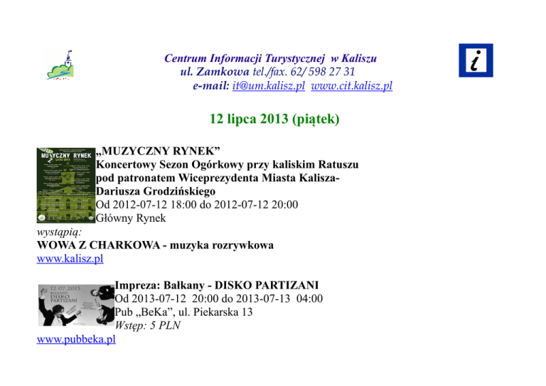 Centrum Informacji Turystycznej w Kaliszu ul. Zamkowa tel./fax. 62/ 598 27 31 e-mail: [email protected] www.cit.kalisz.pl 12 lipca 2013 (piątek) „MUZYCZNY RYNEK” Koncertowy Sezon Ogórkowy przy kaliskim Ratuszu pod patronatem Wiceprezydenta Miasta KaliszaDariusza Grodzińskiego Od 2012-07-12 18:00 do 2012-07-12 20:00 Główny Rynek wystąpią: WOWA Z CHARKOWA - muzyka rozrywkowa www.kalisz.pl Impreza: Bałkany - DISKO PARTIZANI Od 2013-07-12 20:00 do 2013-07-13 04:00 Pub „BeKa”, ul. Piekarska 13 Wstęp: 5 PLN www.pubbeka.pl Eazy Dyonizy Koncert premierowy „Owocowe drzewa kwitną” Od 2013-07-12 20:00 do 2013-07-13 04:00 Pod Muzami, Al. Wolności 27 Supporty: DJ's: DMN, Pamp, Fakeface MC's: Buli & Bobson Wstęp: 5zł 13 lipca 2013 (sobota) „Weekend Celtycko - Irlandzki” Od 2013-07-13 14:00 do do 2013-07-13 20:00 Kaliski Gród Piastów na Zawodziu, ul. B. Pobożnego 87-105 org. Muzeum Okręgowe Ziemi Kaliskiej, Fundacja Kultury Irlandzkiej impreza biletowana www.fki.home.pl , www.muzeum.kalisz.pl „Wybierz Kalisz na weekend” Zwiedzanie miasta zabytkowym autobusem San H100B Od 2013-07-13 12:00 do do 2013-07-13 17:30 Plac W. Bogusławskiego (przed Teatrem im. W. Bogusławskiego) Autobus będzie odjeżdżał o godz. 12.00, 14.00, 16.00 (trasa tematyczna) Trasa przejazdu: Pl. W. Bogusławskiego- Zawodzie- Nowy Świat-Rogatka- Śródmiejska- Główny RynekKanonicka- Parczewskiego- Pl. Jana Pawła II- Pl. Św. Józefa-Kolegialna-Sukiennicza-al. WolnościPl. W. Bogusławskiego Kursy odbywać się będą z przewodnikami PTTK , kurs trwać będzie około 1 - 1,5 h. Przewodnicy będą sprzedawać karty - bilety w cenie 3 zł (normalny) i 2 zł (ulgowy) Kursy współfinansuje Biuro ds. Promocji i Współpracy Międzynarodowej UM w Kaliszu www.pttk.kalisz.pl, www.cit.kalisz.pl, www.kalisz.pl „Wybierz Kalisz na weekend” Zwiedzanie Wieży Ratuszowej Od 2013-07-13 13:00 do 2013-07-13 17:00 Ratusz, Główny Rynek 20 Wejścia o pełnych godzinach: 13.00, 14.00, 15.00, 16.00 i 17.00 Wstęp: 3 zł (normalne), 2 zł (ulgowe) www.pttk.kalisz.pl , www.cit.kalisz.pl , www.kalisz.pl „MUZYCZNY RYNEK” Koncertowy Sezon Ogórkowy przy kaliskim Ratuszu pod patronatem Wiceprezydenta Miasta KaliszaDariusza Grodzińskiego Od 2013-07-13 18:00 do 2013-07-13 20:00 Główny Rynek wystąpią: MONROE - rock www.kalisz.pl 14 lipca 2013 (niedziela) Otwarta Akcja Poboru Krwi Od 2013-07-14 9:30 do 2013-07-14 13:30 Parafia Opatrzności Bożej, ul. Polna Org.: Polski Czerwony Krzyż, Rejonowa Rada Honorowego Krwiodawstwa, Parafia Opatrzności Bożej „Lato z Radiem” – audycja 100,0 FM Studio plenerowe Od 2013-07-14 10:00 do 2013-07-14 13:00 Główny Rynek org. Polskie Radio S.A. w Warszawie, Miasto Kalisz www.kalisz.pl Spływ Kajakowy Celta Od 2013-07-14 10:00 do 2013-07-14 19:00 Zbiórka przy Kaliskim Parku Wodnym, ul. Sportowa 10 Trasa spływu: Kalisz- Grodzisk www.kajakiprosna.pl „Wybierz Kalisz na weekend” Zwiedzanie Wieży Ratuszowej Od 2013-07-14 13:00 do 2013-07-14 17:00 Ratusz, Główny Rynek 20 Wejścia o pełnych godzinach: 13.00, 14.00, 15.00, 16.00 i 17.00 Wstęp: 3 zł (normalne), 2 zł (ulgowe) www.pttk.kalisz.pl , www.cit.kalisz.pl , www.kalisz.pl „Wybierz Kalisz na weekend” Rejsy Łodzią Słowiańską św. Wojciecha „Calisia” Od 2013-07-14 14:00 do 2013-07-14 17:00 Trasa rejsu: Teatr - Zawodzie godz. 14.00, 15.00, 16.00, 17.00 Trasa rejsu: Zawodzie - Teatr godz. 14.30, 15.30, 16.30, 17.30 bilety w cenie: dzieci do lat 3- bezpłatnie dzieci od 3-15 lat- 5 PLN (bilet w jedną stronę), 10 PLN (bilet w dwie strony) dzieci powyżej 15 lat i dorośli- 7 PLN (bilet w jedną stronę), 14 PLN (bilet w dwie strony) Rejsy łodzią współfinansuje Biuro ds. Promocji i Współpracy Międzynarodowej UM w Kaliszu www.zawodzie.eu, www.cit.kalisz.pl, www.kalisz.pl „Weekend Celtycko - Irlandzki” Od 2013-07-14 14:00 do do 2013-07-14 18:00 Kaliski Gród Piastów na Zawodziu, ul. B. Pobożnego 87-105 org. Muzeum Okręgowe Ziemi Kaliskiej, Fundacja Kultury Irlandzkiej impreza biletowana www.fki.home.pl , www.muzeum.kalisz.pl „Wybierz Kalisz na weekend” Niedzielne kursy zabytkową dorożką „Victoria” Od 2013-07-14 14:00 do 2013-07-14 19:00 początkowy i końcowy przystanek każdej przejażdżki zlokalizowany jest na Głównym Rynku dorożka kursowała będzie od godz: 14:00- 19:00 początkowy i końcowy przystanek każdej przejażdżki zlokalizowany jest na Głównym Rynku cena: od 40 zł za kurs www.cit.kalisz.pl, www.kalisz.pl „Lato z Radiem” – koncerty Od 2013-07-14 16:00 do 2013-07-14 23:00 Pola Marsowe na Osiedlu Dobrzec (obok hali Kalisz ARENA) godz. 16.00 - specjalnie dla najmłodszych - Robi Show z piosenkami opartymi na tekstach Jana Brzechwy. Godz. 20.00 - MYSLOVITZ godz. 21.00 - LADY PANK Prowadzenie: Roman Czejarek org. Polskie Radio S.A. w Warszawie, Miasto Kalisz wstęp wolny www.kalisz.pl „Kultura na Trawie” Od 2013-07-14 16:00 do 2013-07-14 18:30 Park Miejski - Koncert Muzyki Klasycznej - Accorinet Trio - Marek Maciejewski (klarnet), Arkadiusz Hylewski (skrzypce) Hieronim Bartczak (akordeon) - Akademia Talentu - działania artystyczne dla dzieci - Uciechowo Org. Stowarzyszenie Kaliska Inicjatywa Miejska oraz Centrum Kultury i Sztuki Kina 12-14 lipca 2013 Seanse filmu „Przed północą” (Dramat/USA) o godz: 17:00 w Kinie Centrum 3D (Centrum Kultury i Sztuki), ul. Łazienna 6 www.ckis.kalisz.pl/film 12-14 lipca 2013 Seanse filmu „Wielkie wesele” (Komedia/USA) o godz: 18:55, 20:30 w Kinie Centrum 3D (Centrum Kultury i Sztuki), ul. Łazienna 6 www.ckis.kalisz.pl/film 12-14 lipca 2013 Seanse filmu „Uniwersytet Potworny” 3D(Animowany/Przygodowy/USA) o godz: 9:15, 16:00, 17:30 w Cinema 3D (Galeria Tęcza), ul. 3-go Maja 1 www.cinema3d.pl 12-14 lipca 2013 Seanse filmu „World War Z” 3D (Science-fiction/ Przygodowy/USA) o godz: 12:00, 14:30, 17:00, 19:30, 22:00 w Cinema 3D (Galeria Tęcza), ul. 3-go Maja 1 www.cinema3d.pl 12-14 lipca 2013 Seanse fil