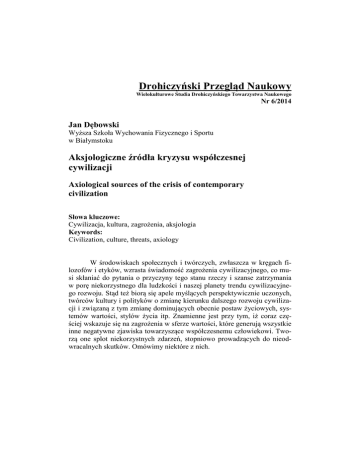 Drohiczyński Przegląd Naukowy Wielokulturowe Studia Drohiczyńskiego Towarzystwa Naukowego Nr 6/2014 Jan Dębowski Wyższa Szkoła Wychowania Fizycznego i Sportu w Białymstoku Aksjologiczne źródła kryzysu współczesnej cywilizacji Axiological sources of the crisis of contemporary civilization Słowa kluczowe: Cywilizacja, kultura, zagrożenia, aksjologia Keywords: Civilization, culture, threats, axiology W środowiskach społecznych i twórczych, zwłaszcza w kręgach filozofów i etyków, wzrasta świadomość zagrożenia cywilizacyjnego, co musi skłaniać do pytania o przyczyny tego stanu rzeczy i szanse zatrzymania w porę niekorzystnego dla ludzkości i naszej planety trendu cywilizacyjnego rozwoju. Stąd też biorą się apele myślących perspektywicznie uczonych, twórców kultury i polityków o zmianę kierunku dalszego rozwoju cywilizacji i związaną z tym zmianę dominujących obecnie postaw życiowych, systemów wartości, stylów życia itp. Znamienne jest przy tym, iż coraz częściej wskazuje się na zagrożenia w sferze wartości, które generują wszystkie inne negatywne zjawiska towarzyszące współczesnemu człowiekowi. Tworzą one splot niekorzystnych zdarzeń, stopniowo prowadzących do nieodwracalnych skutków. Omówimy niektóre z nich. 54 Jan Dębowski Depersonalizacja a zagrożenia ekosfery Jedną z przyczyn implikujących niekorzystne zmiany w cywilizacyjnych warunkach życia współczesnej ludzkości jest bez wątpienia zagrożenie ekosfery. Ma ono swe źródło nie tylko w charakterze obecnej cywilizacji, ale przede wszystkim w sposobie „odczytywania” ludzkiego świata1. Upowszechnia się więc przekonanie, że kryzys ekologiczny bierze początek we wnętrzu człowieka, w jego życiu wewnętrznym, będąc skutkiem zagubienia właściwej relacji pomiędzy nim a środowiskiem przyrodniczym. Dlatego też redukowanie środków zapobiegających dalszej degradacji przyrody do działań o charakterze wyłącznie techniczno-inżynierskich, czy też poprzestawanie na analizach i propozycjach gospodarczych i ekonomistów, wydaje się dalece niewystarczające. W tym przypadku pomija się bowiem milczeniem ważny, a może nawet decydujący o powodzeniu działań proekologicznych czynnik, jakim jest refleksja antropologiczna – w jej filozoficznym, ale także ogólnokulturowym wymiarze. W tym zaś planie środowisko przyrodnicze jawi się jako naturalne środowisko życia człowieka, jako nisza ekologiczna, mająca służyć nie tylko jego funkcjom czysto biologicznym, lecz ponadto rozwojowi jego osobowej godności. Można nawet zaryzykować stwierdzenie, że środowisko przyrodnicze jest drugim domem (oikos) człowieka. Mając zapewne ten aspekt zagadnienia na uwadze Jan Paweł II pisał w encyklice „Redemptor hominis”: „Zdaje się, że jesteśmy coraz bardziej świadomi, iż eksploatacja ziemi, planety, na której żyjemy, domaga się jakiegoś racjonalnego i uczciwego planowania. (…) Człowiek zdaje się nie dostrzegać innych znaczeń swego naturalnego środowiska, jak tylko te, które służą celom doraźnego użycia i zużycia”. A przecież, czytamy dalej w encyklice, chodzi o to, „aby człowiek obcował z przyrodą jako jej rozumny i szlachetny «pan» i «stróż», a nie jako bezwzględny «eksploatator»” (nr 15). Powyżej zacytowany fragment papieskiej encykliki kieruje uwagę na to, że proces kształtowania postaw proekologicznych powinien z jednej strony zakładać konieczność rozwijania pozytywnych odniesień jednostki do przyrody jako jej naturalnego środowiska, z drugiej zaś − kreować pozytywne nastawienie do życia jako takiego. Tym samym osoba ludzka staje się ostateczną racją ochrony przyrody i warunkiem afirmacji jej wartości. Dlatego depersonalizacja człowieka jest nie tylko wyrazem pogwałcenia jej 1 Por. J. Szmyd, Czy radzimy sobie z odczytaniem świata, w którym żyjemy? Res Humana 2009, nr 6, s. 7. Aksjologiczne źródła kryzysu współczesnej cywilizacji 55 osobowej godności, ale ponadto prowadzi do destrukcji przyrody w wyniku instrumentalnego jej traktowania. Można wymienić sporo przyczyn depersonalizacji współczesnego człowieka, jeżeli pod tym pojęciem będziemy rozumieć pozbawienie go osobowej podmiotowości. W tym znaczeniu depersonalizacja pociąga za sobą szereg konsekwencji dla konkretnej jednostki ludzkiej i dla kształtu jej odniesień do społeczeństwa. Sprowadzają się one przede wszystkim do różnorodnych form alienacji, z których na szczególną uwagę zasługuje uprzedmiotowienie człowieka we wszystkich płaszczyznach życia, włącznie z manipulacją ideologiczną i polityczną. W efekcie mamy do czynienia ze wspomnianą depersonalizacją, która charakteryzuje nie tylko społeczeństwa totalitarne, ale również może dawać o sobie znać w rozwiniętych demokracjach, przybierając postać narzucanych jednostce wzorców zachowań, systemów wartości i norm moralnych. Przykładem mechanizmu depersonalizacji jest chociażby narzucany model konsumpcyjnego stylu życia, realizowany kosztem zubożania życia duchowego. Mamy tu więc do czynienia z irracjonalnym w swej istocie przełożeniem akcentów z „być” na „mieć”, a tym samym ze zmianą proporcji między rozwojem cywilizacyjnym i moralnym doskonaleniem się człowieka. Uproszczony, skrajnie konsumpcyjny model życia, oparty na teorii rozwoju ekonomicznego, która koncentruje się wyłącznie na wzroście produkcji i wynikach go stymulujących, jest źródłem zarówno degradacji człowieka, jak również podważa naturalną jego współzależność ze środowiskiem przyrodniczym. Destrukcja środowiska objawia się w postaci coraz bardziej niekorzystnych dla życia zmian w ekosferze, te zaś są w przeważającej mierze rezultatem traktowania przyrody jako wyłącznie czynnika produkcji, którego zasoby nie są bynajmniej niewyczerpalne. Na odwrót, wraz z rozwojem cywilizacji wyczerpują się pokłady naturaln