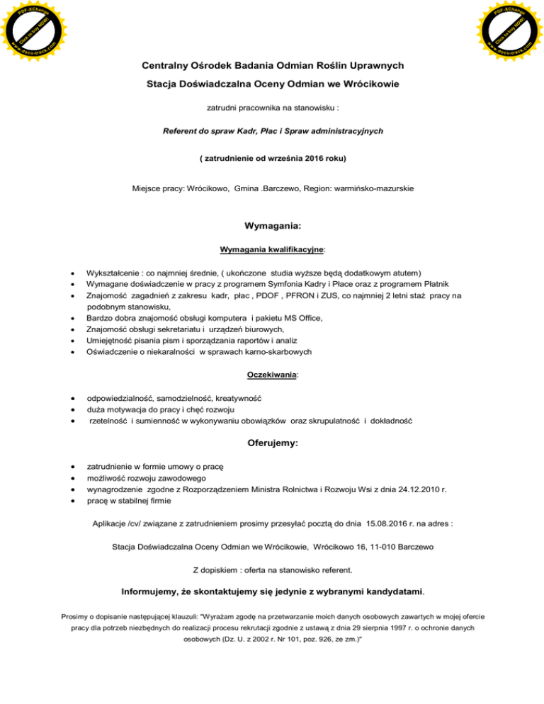 F -X C h a n ge F -X C h a n ge c u -tr a c k N y bu to k lic Centralny O rodek Badania Odmian Ro lin Uprawnych Stacja Do wiadczalna Oceny Odmian we Wrócikowie zatrudni pracownika na stanowisku : Referent do spraw Kadr, P ac i Spraw administracyjnych ( zatrudnienie od wrze nia 2016 roku) Miejsce pracy: Wrócikowo, Gmina .Barczewo, Region: warmi sko-mazurskie Wymagania: Wymagania kwalifikacyjne: Wykszta cenie : co najmniej rednie, ( uko czone studia wy sze b dodatkowym atutem) Wymagane do wiadczenie w pracy z programem Symfonia Kadry i P ace oraz z programem P atnik Znajomo zagadnie z zakresu kadr, p ac , PDOF , PFRON i ZUS, co najmniej 2 letni sta podobnym stanowisku, Bardzo dobra znajomo obs ugi komputera i pakietu MS Office, Znajomo obs ugi sekretariatu i urz dze biurowych, pracy na Umiej tno pisania pism i sporz dzania raportów i analiz O wiadczenie o niekaralno ci w sprawach karno-skarbowych Oczekiwania: odpowiedzialno , samodzielno , kreatywno du a motywacja do pracy i ch rozwoju rzetelno i sumienno w wykonywaniu obowi zków oraz skrupulatno i dok adno Oferujemy: zatrudnienie w formie umowy o prac mo liwo rozwoju zawodowego wynagrodzenie zgodne z Rozporz dzeniem Ministra Rolnictwa i Rozwoju Wsi z dnia 24.12.2010 r. prac w stabilnej firmie Aplikacje /cv/ zwi zane z zatrudnieniem prosimy przesy poczt do dnia 15.08.2016 r. na adres : Stacja Do wiadczalna Oceny Odmian we Wrócikowie, Wrócikowo 16, 11-010 Barczewo Z dopiskiem : oferta na stanowisko referent. Informujemy, e skontaktujemy si jedynie z wybranymi kandydatami. Prosimy o dopisanie nast puj cej klauzuli: "Wyra am zgod na przetwarzanie moich danych osobowych zawartych w mojej ofercie pracy dla potrzeb niezb dnych do realizacji procesu rekrutacji zgodnie z ustaw z dnia 29 sierpnia 1997 r. o ochronie danych osobowych (Dz. U. z 2002 r. Nr 101, poz. 926, ze zm.)" .d o o .c m C m w o .d o w w w w w C lic k to bu y N O W ! PD O W ! PD c u -tr a c k .c