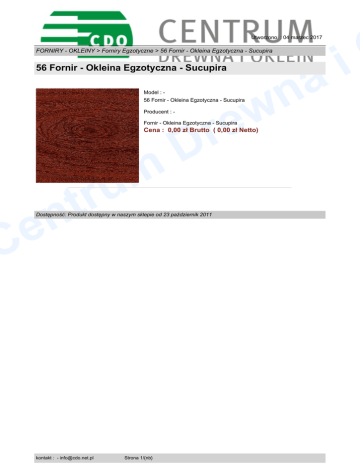 Utworzono : 04 marzec 2017 i a FORNIRY - OKLEINY > Forniry Egzotyczne > 56 Fornir - Okleina Egzotyczna - Sucupira 56 Fornir - Okleina Egzotyczna - Sucupira n w Model : 56 Fornir - Okleina Egzotyczna - Sucupira Producent : - e r D Fornir - Okleina Egzotyczna - Sucupira Cena : 0,00 zł Brutto ( 0,00 zł Netto) m u r t n e C Dostępność: Produkt dostępny w naszym sklepie od 23 październik 2011 kontakt : - [email protected] Strona 1/{nb}