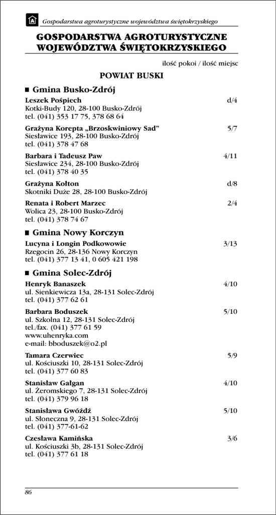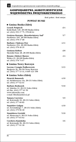 Gospodarstwa agroturystyczne województwa świętokrzyskiego GOSPODARSTWA AGROTURYSTYCZNE WOJEWÓDZTWA ŚWIĘTOKRZYSKIEGO ilość pokoi / ilość miejsc POWIAT BUSKI Gmina Busko-Zdrój Leszek Pośpiech Kotki-Budy 120, 28-100 Busko-Zdrój tel. (041) 353 17 75, 378 68 64 d/4 Grayna Korepta „Brzoskwiniowy Sad” Siesławice 193, 28-100 Busko-Zdrój tel. (041) 378 47 68 5/7 Barbara i Tadeusz Paw Siesławice 234, 28-100 Busko-Zdrój tel. (041) 378 40 35 4/11 Grayna Kołton Skotniki Due 28, 28-100 Busko-Zdrój d/8 Renata i Robert Marzec Wolica 23, 28-100 Busko-Zdrój tel. (041) 378 74 67 2/4 Gmina Nowy Korczyn Lucyna i Longin Podkowowie Rzegocin 26, 28-136 Nowy Korczyn tel. (041) 377 13 41, 0 605 421 198 3/13 Gmina Solec-Zdrój Henryk Banaszek ul. Sienkiewicza 13a, 28-131 Solec-Zdrój tel. (041) 377 62 61 4/10 Barbara Boduszek ul. Szkolna 12, 28-131 Solec-Zdrój tel./fax. (041) 377 61 59 www.uhenryka.com e-mail: [email protected] 5/10 Tamara Czerwiec ul. Kościuszki 10, 28-131 Solec-Zdrój tel. (041) 377 60 83 5/9 Stanisław Gałgan ul. eromskiego 7, 28-131 Solec-Zdrój tel. (041) 379 96 18 4/10 Stanisława Gwóźdź ul. Słoneczna 9, 28-131 Solec-Zdrój tel. (041) 377-61-62 5/10 Czesława Kamińska ul. Kościuszki 3b, 28-131 Solec-Zdrój tel. (041) 377 61 18 86 3/6 Gospodarstwa agroturystyczne województwa świętokrzyskiego Waldemar Korniłowicz i Cyryla Podsiadło ul. Krakowska 9, 28-131 Solec-Zdrój tel. (041) 377 64 82, 377 60 53 Anna Lasak ul. Szkolna 4, 28-131 Solec-Zdrój tel. (041) 377 61 85 Danuta Pęcherek ul. Słoneczna 15, 28-131 Solec-Zdrój tel. (041) 377 61 10 www.udanusi.prv.pl e-mail: [email protected] 5/10 2/4 5/12 Agata Rajczak ul.1 Maja 12a, 28-131 Solec-Zdrój tel. (041) 377 67 04 4/9 Helena Rokita ul. Słoneczna 14, 28-131 Solec-Zdrój tel. (041) 377 62 50 4/6 Cecylia Sosin ul. eromskiego 10, 28-131 Solec-Zdrój tel. (041) 379 96 13, 0 503 013 715 4/10 Barbara i Lucjan Swatek ul. Słoneczna 16, 28-131 Solec-Zdrój tel. (041) 377 60 94, 0 609 253 660 4/8 Krzysztof Suder Zagajów 36, 28-131 Solec-Zdrój tel. (041) 377 60 42 2/7 Zdzisław Szczepanek Zagorzany 36, 28-131 Solec-Zdrój tel. (041) 377 64 97 5/10 Gmina Stopnica Małgorzata i Zdzisław Olszewscy Bosowice, 28-130 Stopnica adres kontaktowy: Palonki 20, 28-114 Gnojno tel. (041) 353 31 64 d/6 Czesław Janicki Skrobaczów 38, 28-130 Stopnica tel. 0 602 887 264 4/12 Barbara Kapusta ul. dr Piotrowskiego 41, 28-130 Stopnica tel. (041) 377 90 54 5/20 Eleonora Małgorzata Bąk Szczeglin 30, 28-130 Stopnica tel. 0 502 481 220 2/4 Gmina Tuczępy Danuta i Mieczysław Augustyn Niziny 156, 28-142 Tuczępy tel. (041) 354 09 02 2/6 87 Gospodarstwa agroturystyczne województwa świętokrzyskiego Zofia Guz Niziny 159, 28-142 Tuczępy tel. (041) 353 31 91, 0 606 708 377 5/10 Gmina Wiślica Alina Szostak ul. Podgrodzie 2, 28-160 Wiślica tel. (041) 379 21 53 4/12 POWIAT JĘDRZEJOWSKI Gmina Jędrzejów Helena i Jan Mierzwińscy Cierno-abieniec 125, 28-361 Prząsław tel. 0 695 644 677 2/8 Anna i Andrzej Grzelec Jasionka 54b, 28-300 Jędrzejów 2/4 Gmina Małogoszcz Zofia Samburska Bocheniec 36C, 28-366 Małogoszcz tel. (041) 385 57 52 2/7 Teresa i Andrzej Gołębiowscy Bocheniec 12a, 28-366 Małogoszcz tel. (041) 385 57 77 2/4 Urszula i Jerzy Hajduk Sabianów 2, 28-366 Małogoszcz tel. (041) 385 58 06 3/9 Gmina Nagłowice Małgorzata i Zdzisław Bałowie ul. Parkowa 17, 28-362 Nagłowice tel. 0 608 507 961 1/3 Jerzy Zapart ul. Mikołaja Reja 26, 28-362 Nagłowice tel. (041) 381 43 77 2/6 Anna i Marian Gajosowie Nowa Wieś 20, 28-362 Nagłowice tel. (041) 381 43 91 2/5 Małgorzata i Waldemar Miśtowie Nowa Wieś 114, 28-362 Nagłowice tel. (041) 381 44 57 3/9 Krystyna i Bogusław Sygutowie Rakoszyn 91, 28-362 Nagłowice tel. (041) 381 44 43 d/3 Janina Maślarz Rejowiec 11, 28-362 Nagłowice tel. grzeczn. (041) 381 45 70 tel. 0 600 132 956 2/6 Danuta i Bogusław Bałowie Ślęcin 91a, 28-362 Nagłowice tel. (041) 381 47 45 d/8 88 Gospodarstwa agroturystyczne województwa świętokrzyskiego Gmina Oksa Maciek Wnuk ul. Leśna 2, 28-363 Oksa tel. (041) 380 80 27 Małgorzata i Zbigniew Równiccy Popowice 61, 28-363 Oksa tel. (041) 380 81 86 5/14 4/4 Gmina Słupia Małgorzata Bodzioch Raszków 104, 28-350 Słupia Jędrzejowska tel. (041) 381 63 43 3/6 Gmina Sobków Gospodarstwo Rolno-Hodowlane „Stajnia ul. Kielecka 134, 28-305 Sobków tel. (041) 387 10 19, 0 503 311 919 2/8 Helena Lis AGROPARK „Dworek pod Lipą” Nowe Kotlice 54, 28-305 Sobków tel. (041) 387 92 23, 0 505 803 328 e-mail: [email protected] 5/20 POWIAT KAZIMIERSKI Gmina Bejsce Ryszard Czajka Królewice 93, 28-512 Bejsce tel. (041) 351 10 57 www.krolewice.pl 4/7 POWIAT KIELECKI Gmina Bieliny Marta i Zbigniew Łataś Huta Nowa 62a, 26-004 Bieliny tel. (041) 302 59 24, 0 605 144 757 Barbara i Jarosław Kot „Podłysica” Huta Podłysica 36, 26-004 Bieliny tel. (041) 312 71 56, 0 501 541 364 www.podlysica.agrowakacje.pl Danuta i Jan Mazurowie Huta Podłysica 66, 26-004 Bieliny tel. (041) 302 52 96 Bogusława i Stanisław Durlejowie Lechów 74c, 26-004 Bieliny tel. (041) 302 54 45, 0 608 187 926 5/15 4/9 3/12 2/7 Gmina Bodzentyn Krystyna i Kazimierz Gałkowie ul. Wolności 8, 26-010 Bodzentyn tel. (041) 311 55 20 3/7 89 Gospodarstwa agroturystyczne województwa świętokrzyskiego Anna Gałka „Zielona Dolina” ul. eromskiego 22, 26-010 Bodzentyn tel. (041) 311 56 86, 0 501 059 263 www.zielonadolina.wczasywpolsce.pl Stanisław Łubek „U Kazia” ul. Szermentowskiego 14, 26-010 Bodzentyn tel. (041) 311 52 10, 0 887 224 565 www.ukazia.wczasywpolsce.pl 3/8 2d/14 Zdzisław Rajtar „Pod Świerkami” ul. Ogrodowa 9, 26-010 Bodzentyn tel. (041) 311 51 37, 0 501 045 807 www.podswierkami.wczasywpolsce.pl 5/15 Magdalena Słowińska Dom Gościnny „Ola” ul. Ogrodowa 14, 26-010 Bodzentyn tel. (041) 311 57 84, 0 508 507 924 www.ola.wczasywpolsce.pl 7/19 Ewa Maniara „Marysieńka” ul. Ogrodowa 20, 26-010 Bodzentyn tel. (0-41) 311 51 51, 0 608 324 114 5/14 Maria i Krzysztof Sou