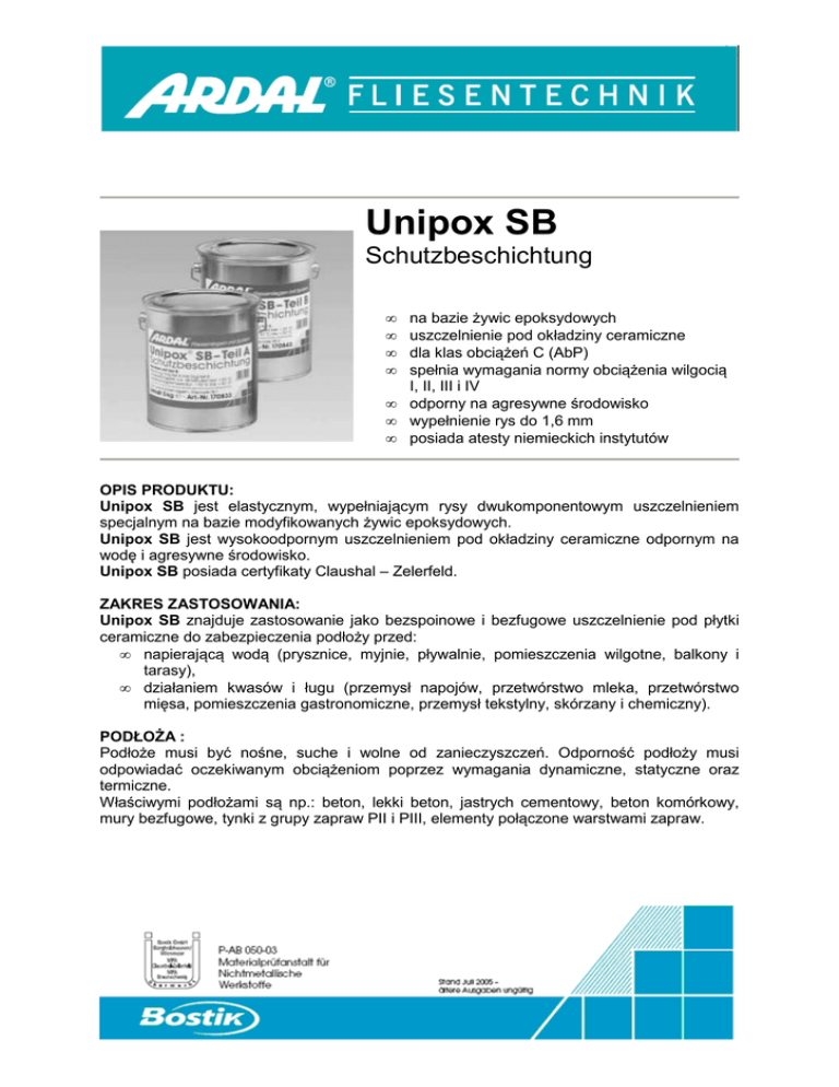 Unipox SB Schutzbeschichtung • • • • • • • na bazie żywic epoksydowych uszczelnienie pod okładziny ceramiczne dla klas obciążeń C (AbP) spełnia wymagania normy obciążenia wilgocią I, II, III i IV odporny na agresywne środowisko wypełnienie rys do 1,6 mm posiada atesty niemieckich instytutów OPIS PRODUKTU: Unipox SB jest elastycznym, wypełniającym rysy dwukomponentowym uszczelnieniem specjalnym na bazie modyfikowanych żywic epoksydowych. Unipox SB jest wysokoodpornym uszczelnieniem pod okładziny ceramiczne odpornym na wodę i agresywne środowisko. Unipox SB posiada certyfikaty Claushal – Zelerfeld. ZAKRES ZASTOSOWANIA: Unipox SB znajduje zastosowanie jako bezspoinowe i bezfugowe uszczelnienie pod płytki ceramiczne do zabezpieczenia podłoży przed: • napierającą wodą (prysznice, myjnie, pływalnie, pomieszczenia wilgotne, balkony i tarasy), • działaniem kwasów i ługu (przemysł napojów, przetwórstwo mleka, przetwórstwo mięsa, pomieszczenia gastronomiczne, przemysł tekstylny, skórzany i chemiczny). PODŁOŻA : Podłoże musi być nośne, suche i wolne od zanieczyszczeń. Odporność podłoży musi odpowiadać oczekiwanym obciążeniom poprzez wymagania dynamiczne, statyczne oraz termiczne. Właściwymi podłożami są np.: beton, lekki beton, jastrych cementowy, beton komórkowy, mury bezfugowe, tynki z grupy zapraw PII i PIII, elementy połączone warstwami zapraw. GRUNTOWANIE PODŁOŻY: Przed nałożeniem Unipox SB należy chłonne podłoża zabezpieczyć gruntem Unipox SB – Grundierung. Temperatura podłoża podczas prac gruntowania i powlekania nie powinna wynosić poniżej +10ºC. Koniecznie przed zastosowaniem Unipox SB – Grundierung oba komponenty (część A i część B) wymieszać w stosunku 2 : 1. Do pojemnika z częścią A dodać część B i wymieszać za pomocą odpowiedniego mieszadła do uzyskania jednorodnej masy. Wymieszany produkt Unipox SB – Grundierung powinien być przygotowany w pojemniku o odpowiedniej średnicy do prac wyrównawczych i natychmiast zużyty. Mieszanka nadaje się do wykonywania prac przez ok. 30 minut przy temperaturze +20ºC. Nakładać za pomocą wałka z krótkim włosem. Unipox SB – Grundierung należy na świeżo posypać piaskiem kwarcowym na całej powierzchni (uziarnienie: 0,3 – 0,6 mm). Po stwardnieniu warstwy gruntu usunąć pozostały piasek. Zużycie materiału: Czas twardnienia: ok. 150 – 200 g / m2 ok. 16 godzin przy temperaturze +20ºC WSKAZÓWKI DOT. WYKONYWANIA POWŁOKI USZCZELNIAJĄCEJ: Przed nałożeniem powłoki Unipox SB – Beschichtung, Unipox SB – Grundierung musi być związany. Koniecznie przed zastosowaniem Unipox SB oba komponenty (część A i część B) wymieszać w stosunku 1:1 w czystym pojemniku i za pomocą wiertarki i odpowiedniego mieszadła na jednolitą masę. Nanosić powłokę Unipox SB za pomocą wałka na zapiaskowaną zagruntowaną powłokę. Żeby zwiększyć stabilność na powierzchniach ściennych, należy dodać wagowo 2 – 3 % produktu zagęszczającego Stellmittel 222. Aby zagwarantować pewne uszczelnienie, niezbędne są min. 2 powłoki o grubości 1 mm każda. Zużycie Unipox SB wynosi ok. 1,3 kg/m2 na warstwę. Pierwsza powłoka musi związać przed nałożeniem drugiej. Nakładanie drugiej powłoki musi nastąpić w przeciągu 48 godzin po nałożeniu pierwszej . Ostatnią powłokę Unipox SB na świeżo należy posypać suchym piaskiem kwarcowym o uziarnieniu 0,6 – 1,2 mm na całej powierzchni. Zapiaskowanie służy jako mostek sczepny, aby utworzyć dobre połączenie ARDAL Epoxidharzklebstoff, Fliessbettepoxi lub Dünnbettmörtel z Unipox SB – Beschichtung. Układanie płytek powinno nastąpić dopiero po stwardnieniu powłoki. SZCZELINY DYLATACYJNE, ODPŁYWY PODŁOGOWE, PRZEJŚCIA RUROWE: Przejścia rurowe powinny mieć kołnierz, odpływy podłogowe powinny posiadać kołnierze zaciskowe. Fugi dylatacyjne i fugi ścienne powinny mieć na krawędziach odpowiednie nachylenie, tak żeby taśma uszczelniająca mogła być odpowiednio uformowana. W świeżą warstwę SB – Beschichtung na fugach dylatacyjnych montujemy taśmę uszczelniającą. Po związaniu pierwszej warstwy wykonujemy następne powłoki w kolejności. Kołnierze odpływów podłogowych powinny być wzmocnione mankietem uszczelniającym, ewentualnie siatką z włókna szklanego wtopionego w pierwszą warstwę uszczelnienia. Unipox SB – Grundierung może być wymieszany z suchym piaskiem kwarcowym. UKŁADANIE OKŁADZIN CERAMICZNYCH: Do przygotowania i układania płytek na Unipox SB – Beschichtung nadają się: • przy obciążeniach kwasami, ługiem i wodą: - ARDAL Unipox 810 (klej na bazie żywic epoksydowych wg DIN 18156 część 4), - ARDAL Unipox FE Fließbettepoxi, • przy obciążeniach wodą: - ARDAL Ardalith Pro (zaprawa cienkowarstwowa wg DIN 18156 część 2) z ARDAL Elasto 80 lub ARDAL Floorflex Schnell WSKAZÓWKA: Należy przestrzegać wymienionych technicznych przeprowadzaniu uszczelnienia Unipox SB: dokumentów przy planowaniu i INSTRUKCJE: Wydane przez Centralny Związek Budownictwa Niemieckiego (ZDB): - „Wskazówki do wykonywania uszczelnień w połączeniu z licowaniami i okładzinami z płytek wewnątrz i na zewnątrz budynków” - „Okładziny ceramiczne w budowie basenów – wskazówki do projektowania i wykonawstwa” DYREKTYWA WSPÓLNOTY BUDOWNICTWA PRZEMYSŁOWEGO: „Ochrona konstrukcji budowlanych z okładzin z płyt przed atakiem chemicznym” – karta S10, część 1 do 4. Wydane przez Wspólnotę Budownictwa Przemysłowego (AGI). DANE TECHNICZNE UNIPOX SB – SCHUTZBESCHICHTUNG: Baza: modyfikowana żywica epoksydowa Barwa mieszanki: szara Stosunek mieszania: część A : część B = 1 : 1 Czas obróbki: ok. 45 minut przy temperaturze +20ºC Temperatura obróbki: +10ºC do +30ºC Czas twardnienia: ok. 16 godzin przy temperaturze +20ºC Lepkość mieszanki: ok. 8000 mPas przy temperaturze +20ºC Specyficzny ciężar mie