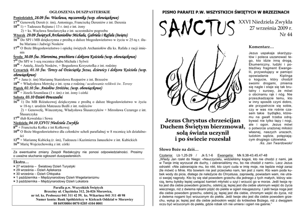 OGŁOSZENIA DUSZPASTERSKIE Poniedziałek 28.09 Św. Wacława, męczennika (wsp. obowiązkowe) 1730 Genowefę Dereń (r. śm), Antoniego, Franciszkę Dereniów z int. Derenia 1800 1) + Tadeusza Rejtana ( 13 r. śm) z int. żony 2) + ks. Wacława Smolarczyka z int. uczestników pogrzebu Wtorek 29.09 Świętych Archaniołów Michała, Gabriela i Rafała (święto) 1630 Do SPJ i MB dziękczynna z prośbą o dalsze błogosławieństwo w życiu w 25-tą r. ślubu Mariana i Jadwigi Nosków 1700 O Boże Błogosławieństwo i opiekę świętych Archaniołów dla ks. Rafała z racji imienin Środa 30.09 Św. Hieronima, prezbitera i doktora Kościoła (wsp. obowiązkowe) 700 Do SPJ w 1-szą rocznice ślubu Michała i Sylwii 1800 + Anielę, Józefa Nosków, + Bogusława Krzysztofka z int. rodziny Czwartek 01.10 Św. Teresy Teresy od Dzieciątka Jezus, dziewicy i doktora Kościoła (wsp. PISMO PARAFII P.W. WSZYSTKICH ŚWIĘTYCH W BRZEZINACH SANC SANCTUS XXVI Niedziela Zwykła 27 września 2009 r. Nr 44 Komentarz… obowiązkowe) 700 + Jana (r. śm) Mariannę Stanisława Rozparów z int. Brzozów 1800 + Władysława Metrykę z int. syna z rodziną / ucałowanie relikwii św. Teresy Piątek 02.10 Św. Aniołów Stróżów, (wsp. obowiązkowe) 1800 + Józefa Szumilasa (1 r. śm) z int. żony i córki Sobota 03.10 Dzień Powszedni 1600 1) Do MB Różańcowej dziękczynna z prośbą o dalsze błogosławieństwo w życiu w 18-tą r. urodzin Mateusza Bedli z int. rodziców 2) + Genowefę, Wincentynę, Władysława Ślusarczyków + Mirosława Cezarego z int. Ślusarczyka 1700 ślub Kowalska i Sowa Niedziela 04.10 XXVII Niedziela Zwykła 800 + Franciszka Kołka z int Kołkowej 1000 O Boże błogosławieństwo dla członków scholi parafialnej w 8 rocznicę ich działalności 1200 + Mariannę Kubicką (r. śm), Tadeusza i Kazimierza Januszków z int. Kubickich 1600 Marię Wojciechowską z int. córki Za ewentualne zmiany Zespół Redakcyjny nie ponosi odpowiedzialności. Prosimy o uważne słuchanie ogłoszeń duszpasterskich. Ekstra… × 27 września – Światowy Dzień Turystyki × 29 września – Dzień Aptekarza × 30 września – Dzień Chłopaka × 1 października – Międzynarodowy Dzień Wegetarianizmu × 3 października – Międzynarodowy Dzień Lokatora Parafia p.w. Wszystkich Świętych Brzeziny ul. Chęcińska 312, 26-026 Morawica, nr tel. ks. Proboszcz 041 311 42 59, ks. Wikariusz 041 311 48 98 Numer konta: Bank Spółdzielczy w Kielcach Oddział w Morawicy 08 84930004 0070 0205 4104 0001 Jezus Chrystus chrześcijan Duchem Świętym bierzmował, solą świata uczynił i po świecie rozesłał Jezus uspakaja skarżypytów i poleca uszanować tego, kto idzie inną drogą. Ekumeniczny, ludzki i pobłażliwy fragment Ewangelii, przywołujący w pamięci opowiadanie Kiplinga o kogucie, który chodził swoimi drogami, zmienia się nagle i staje się tak brutalny i surowy, że mówi o obcinaniu rąk i nóg. Nie przeszkadzajcie temu, kto w inny sposób czyni dobro, ale przypatrzcie się sobie, czy w was nie rośnie czasem takie bydlątko, któremu na gwałt trzeba odrąbywać nie tylko łapy i nogi, ale i ogon. Jezus mówi o potworze urażonej miłości własnej, naszych urazach, ludzkim sądzie, potępiającym drugiego człowieka. /ks. Jan Twardowski/ Słowo Boże na dziś… Czytania: Lb 1,25-29 / Jk 5,1-6 Ewangelia: Mk 9,38-43.45.47-48 „Wtedy Jan rzekł do Niego: «Nauczycielu, widzieliśmy kogoś, kto nie chodzi z nami, jak w Twoje imię wyrzucał złe duchy, i zabranialiśmy mu, bo nie chodził z nami». Lecz Jezus odrzekł: «Nie zabraniajcie mu, bo nikt, kto czyni cuda w imię moje, nie będzie mógł zaraz źle mówić o Mnie. Kto bowiem nie jest przeciwko nam, ten jest z nami. Kto wam poda kubek wody do picia, dlatego że należycie do Chrystusa, zaprawdę, powiadam wam, nie utraci swojej nagrody. Kto by się stał powodem grzechu dla jednego z tych małych, którzy wierzą, temu byłoby lepiej uwiązać kamień młyński u szyi i wrzucić go w morze. Jeśli twoja ręka jest dla ciebie powodem grzechu, odetnij ją; lepiej jest dla ciebie ułomnym wejść do życia wiecznego, niż z dwiema rękami pójść do piekła w ogień nieugaszony. I jeśli twoja noga jest dla ciebie powodem grzechu, odetnij ją; lepiej jest dla ciebie, chromym wejść do życia, niż z dwiema nogami być wrzuconym do piekła. Jeśli twoje oko jest dla ciebie powodem grzechu, wyłup je; lepiej jest dla ciebie jednookim wejść do królestwa Bożego, niż z dwojgiem oczu być wrzuconym do piekła, gdzie robak ich nie umiera i ogień nie gaśnie.” A w parafii… Boży człowiek… - św. Wincenty a Paulo (27 września) ▪ Dziś w parafii witamy ks. bp. Kazimierza Gurdę, który udzieli sakramentu bierzmowania naszej młodzieży, dokona Wizytacji Kanonicznej, a także poświęci odnowiony ołtarz i prezbiterium. Pamiętajmy o modlitwie za naszego Pasterza i za młodych, którzy osiągną dojrzałość chrześcijańską. ▪ 29 września w dzień świętych Archaniołów imieniny obchodzi nasz ks. Wikariusz Rafał Nowiński. Już dziś składamy Mu najserdeczniejsze życzenia. Niech św. Rafał Archanioł prowadzi Go dobrze po drogach życia. ▪ 1 października przypada wspomnienie św. Teresy od Dzieciątka Jezus, której relikwie posiada nasza parafia. Ich ucałowanie odbędzie się na Mszy Św. o godz 18.00 Zapraszamy wszystkich parafian do uczczenia tej Wielkiej Świętej Kościoła – „Małej Tereski z Lisieux” Wincenty pochodził z biednego domu. Od dzieciństwa był zdolny i pracował dużo nad sobą. Uczył się u franciszkanów i przywdział szaty duchowe już w wieku 19 lat. Rychło doceniono jego talenty-był jałmużnikiem królowej, a potem nauczycielem i powiernikiem potężnego rodu de Gondi. Właśnie tam wysłuchał raz spowiedzi umierającego wieśniaka i to odmieniło jego życie. Ignorancja religijna biedaka tak nim wstrząsnęła, że zaczął wygłaszać kazania. Wkrótce przed kościołem