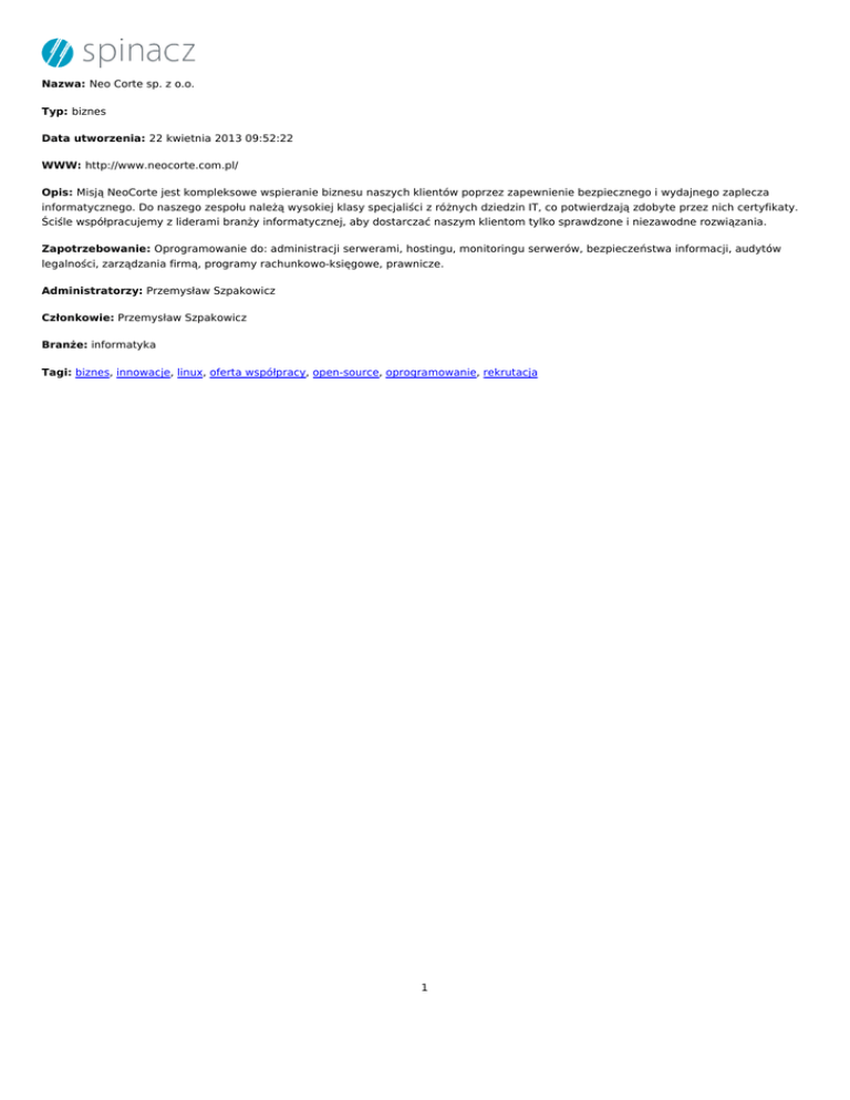 1 Nazwa: Neo Corte sp. z o.o. Typ: biznes Data utworzenia: 22