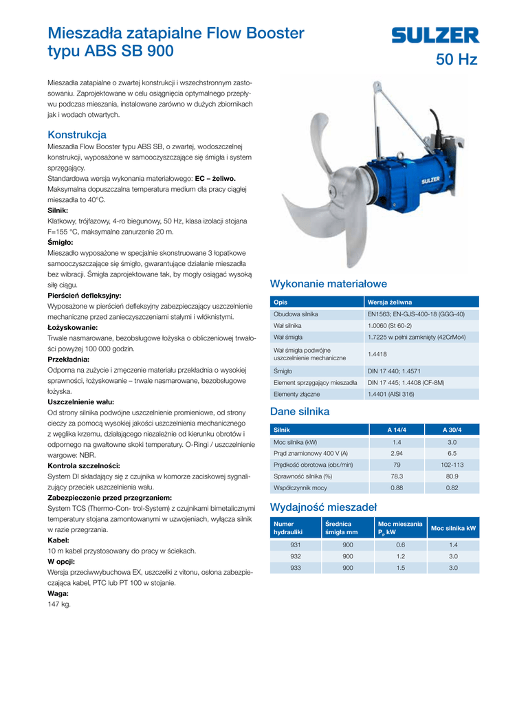 Mieszadła zatapialne Flow Booster typu ABS SB 900 50 Hz