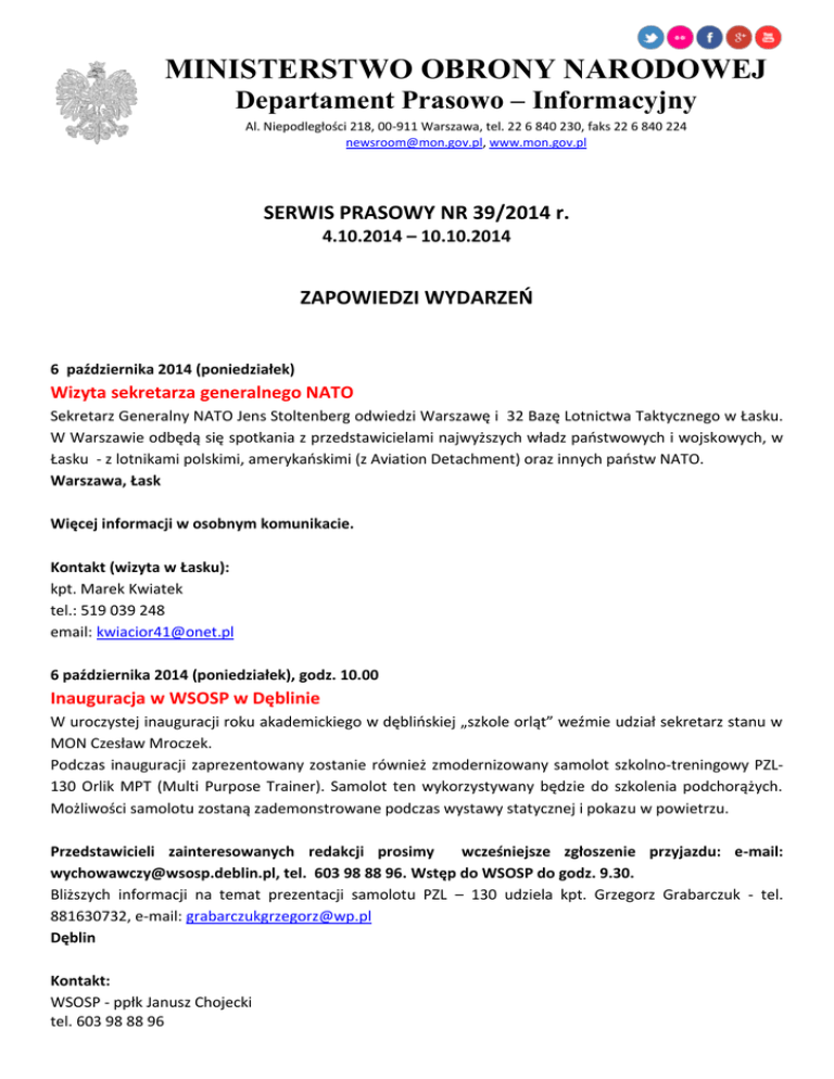 MINISTERSTWO OBRONY NARODOWEJ Departament Prasowo – Informacyjny Al. Niepodległości 218, 00-911 Warszawa, tel. 22 6 840 230, faks 22 6 840 224 [email protected], www.mon.gov.pl SERWIS PRASOWY NR 39/2014 r. 4.10.2014 – 10.10.2014 ZAPOWIEDZI WYDARZEŃ 6 października 2014 (poniedziałek) Wizyta sekretarza generalnego NATO Sekretarz Generalny NATO Jens Stoltenberg odwiedzi Warszawę i 32 Bazę Lotnictwa Taktycznego w Łasku. W Warszawie odbędą się spotkania z przedstawicielami najwyższych władz paostwowych i wojskowych, w Łasku - z lotnikami polskimi, amerykaoskimi (z Aviation Detachment) oraz innych paostw NATO. Warszawa, Łask Więcej informacji w osobnym komunikacie. Kontakt (wizyta w Łasku): kpt. Marek Kwiatek tel.: 519 039 248 email: [email protected] 6 października 2014 (poniedziałek), godz. 10.00 Inauguracja w WSOSP w Dęblinie W uroczystej inauguracji roku akademickiego w dęblioskiej „szkole orląt” weźmie udział sekretarz stanu w MON Czesław Mroczek. Podczas inauguracji zaprezentowany zostanie również zmodernizowany samolot szkolno-treningowy PZL130 Orlik MPT (Multi Purpose Trainer). Samolot ten wykorzystywany będzie do szkolenia podchorążych. Możliwości samolotu zostaną zademonstrowane podczas wystawy statycznej i pokazu w powietrzu. Przedstawicieli zainteresowanych redakcji prosimy wcześniejsze zgłoszenie przyjazdu: e-mail: [email protected], tel. 603 98 88 96. Wstęp do WSOSP do godz. 9.30. Bliższych informacji na temat prezentacji samolotu PZL – 130 udziela kpt. Grzegorz Grabarczuk - tel. 881630732, e-mail: [email protected] Dęblin Kontakt: WSOSP - ppłk Janusz Chojecki tel. 603 98 88 96 e-mail: [email protected] 6 – 10 października 2014 (poniedziałek - piątek) Centralny Zlot Klas Mundurowych Blisko sześciuset młodych ludzi, uczących się w 18 klasach mundurowych w całym kraju, będzie rywalizowało od 6 do 10 października br. o miano najlepszej klasy mundurowej. Wśród konkurencji są m.in. elementy strzelectwa, pierwszej pomocy, dwiczeo terenowych i testy z wiedzy teoretycznej. Rywalizacji przyglądad się będzie podsekretarz stanu w MON Maciej Jankowski, który odwiedzi zlot 8 października. Informacji na temat zlotu udziela rzecznik prasowy 11 Dywizji Kawalerii Pancernej mjr Artur Pinkowski – tel. 695 858 042. Redakcje zainteresowane udziałem swoich przedstawicieli proszone są o wysłanie formularza akredytacyjnego z danymi (nazwa redakcji, imię i nazwisko, numer tel. kontaktowego, ew. rodzaj pojazdu i numer rejestracyjny) na adres: [email protected]. Żagao Kontakt: mjr Artur Pinkowski kom. 695 858 042, e-mail: [email protected] 6 - 10 października 2014 (poniedziałek - piątek) Szkolenie SERE Szkolenie z zakresu SERE B zostanie przeprowadzone dla misji Resolute Support (Afganistan). OSG Trzcianiec Kontakt: kpt. Konrad Radzik tel.: 691 677 515 6 – 20 października 2014 (poniedziałek - sobota) Szkolenie NSR Dwiczenie rotacyjne żołnierzy pełniących służbę w ramach NSR. Wędrzyn Kontakt: mjr Artur Pinkowski tel.: 695 858 042 e-mail: [email protected] 6 – 21 października 2014 (poniedziałek - niedziela) Szkolenie nurków Minersko-zaporowe szkolenie poligonowe nurków-minerów i nurków inżynierii Marynarki Wojennej. Dziwnów Kontakt: kmdr ppor. Jacek Kwiatkowski tel.: 661 417 739 e-mail: [email protected] 7 października 2014 (wtorek) Otwarcie targów konserwatorskich Podsekretarz stanu w MON Beata Oczkowicz otworzy targi poświęcone konserwacji i restauracji zabytków oraz ochronie wyposażenia archiwów, muzeów i bibliotek w Warszawie. Więcej informacji na stronie: http://targidziedzictwo.pl/o-targach/tematyka.html Warszawa, ul. Marsa 56c Kontakt: Joanna Sawicka-Mordak tel.: 22 529 39 84 kom.: 728 493 691 e-mail: [email protected] 7 – 31 października 2014 (wtorek - piątek) Wspólne dwiczenia z Av-Det Rotacja komponentu Aviation Detachment w 33 Bazie Lotnictwa Transportowego, połączona ze wspólnym szkoleniem załóg samolotów C-130. Powidz Kontakt: kpt. Włodzimierz Baran tel. 519 038 312 7 października 2014 (wtorek) Rocznica bitwy pod Duklą W obchodach 70. rocznicy bitwy o Przełęcz Dukielską wezmą udział żołnierze, przedstawiciele MON, władz terytorialnych i społeczeostwa. Dukla, Zarszyn, Nowosielce Kontakt: kpt. Konrad Radzik tel.: 691 677 515 7 października 2014 (wtorek) Posłowie w brygadzie Wizyta przedstawicieli Sejmowej Komisji Obrony Narodowej w 15 Sieradzkiej Brygadzie Wsparcia Dowodzenia. Podczas wizyty posłowie zapoznają się ze strukturą, zadaniami oraz wyposażeniem jednostki. Sieradz, ul. Wojska Polskiego 78 Kontakt: mjr Andrzej Bubek tel.: 43 826 15 41 kom.: 693 565 041 email: [email protected]@wp.pl 9 października 2014 (czwartek), godz. 17.00 Rocznica Maciejowic W obchodach 220. rocznicy bitwy pod Maciejowicami weźmie udział sekretarz stanu w MON Czesław Mroczek. Więcej informacji na stronie: http://www.maciejowice.pl/news.details.pl.497.html Maciejowice Kontakt: Urząd Gminy w Maciejowicach tel.: 25 682 57 37 email: [email protected] 9 - 10 października 2014 (czwartek - piątek) Święto pancerniaków z Wesołej Święto 1 Brygady Pancernej w Wesołej Warszawa, Wesoła Kontakt: kpt. Zbigniew Gierczak tel.: 518 658 911 e-mail: [email protected] 10 października 2014 (piątek) Rocznica radiowców Uroczystości z okazji 40-lecia sformowania 3 Brygady Radiotechnicznej. Na wrocławskim rynku odbędzie się apel, pokaz musztry paradnej, koncert Orkiestry Reprezentacyjnej Sił Powietrznych, defilada oraz wystawa sprzętu jednostki. Wrocław Kontakt: kpt. Tomasz Słotwioski tel.: 519 038 777 e-mail: [email protected] 10 - 11 października 2014 (piątek - sobota) Polscy piloci w Hiszpanii Piloci wezmą udział w pokazach lotniczych Air Festival AIRE 75 - zaprezentuje się zespół akrobacyjny Orlik i samolot C-295. Madryt Kontakt: Leader zespołu Orlik kpt. Dariusz Stachurski tel.: 607 158 188 KRONIKA 27 września 2014 (sobota) NaszaArmia.pl W najnowszym odcinku progra
