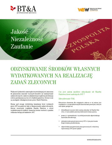 Jakość Niezależność Zaufanie ODZYSKIWANIE ŚRODKÓW WŁASNYCH WYDATKOWANYCH NA REALIZACJĘ ZADAŃ ZLECONYCH Większość jednostek samorządu terytorialnego jest zmuszona do ponoszenia znacznie wyższych kosztów na wykonywanie zadań zleconych z zakresu administracji rządowej niż dotacja celowa przekazana na ten cel z budżetu państwa. Kwoty te nie są następnie rekompensowane przez Skarb Państwa. Biorąc pod uwagę wieloletnią kumulację kwot wydanych przez JST na pokrycie luki w finansowaniu zadań zleconych, obecne roszczenia względem Skarbu Państwa o zwrot wydatkowanych środków stanowią istotne wartości z punktu widzenia bieżących budżetów JST. Czy jest zatem możliwe odzyskanie od Skarbu Państwa kwot należnych JST ? Zdecydowanie TAK. Kluczowym elementem dla osiągnięcia sukcesu w tej mierze jest współpraca z wyspecjalizowanymi kancelariami prawnymi, których rola będzie polegać na: • identyfikacji roszczeń, które można odzyskać od Skarbu Państwa, w tym analizie prawnej okoliczności danej sprawy, • pomocy w zgromadzeniu i wyselekcjonowaniu odpowiedniego materiału dowodowego, • zabezpieczeniu pozycji procesowej JST, w tym przerwaniu biegu terminu przedawnienia, • odpowiednim przygotowaniu pism procesowych i właściwej reprezentacji JST przed sądami WWW.BTAGROUP.PL Jakość Niezależność Zaufanie Nasza oferta Kim jesteśmy Wychodząc naprzeciw Państwa oczekiwaniom, Grupy BT&A Legal oraz kancelaria WBW Weremczuk Bobeł i Wspólnicy pragnie podzielić się z Państwem swoim doświadczeniem obejmującym usługi doradztwa prawnego, w tym usługi zastępstwa procesowego – w zakresie: BT&A to Grupa stworzona w 2009 r. przez specjalistów – prawników, doradców podatkowych i biegłych rewidentów – z poznańskiego oddziału firmy Ernst & Young. Przed utworzeniem Grupy BT&A, jej założyciele przez ponad dekadę zdobywali doświadczenie pracując dla największych przedsiębiorstw (zarówno międzynarodowych, jak i polskich) oraz instytucji publicznych. Mamy wieloletnie doświadczenie we współpracy z jednostkami samorządu terytorialnego w zakresie optymalizacji rozliczeń podatku VAT. Asystowaliśmy w procesie wdrożenia skonsolidowanych procedur rozliczania podatku VAT w jednym z największych miast w Polsce, posiadającym ponad 300 jednostek budżetowych. Przez kilka ostatnich lat pomogliśmy około 100 jednostkom samorządu terytorialnego w odzyskaniu podatku VAT naliczonego oraz przy planowaniu inwestycji pod kątem optymalizacji rozliczeń VAT. Przy odzyskiwaniu należności z tytułu zadań zleconych BT&A współpracuje z kancelarią WBW Weremczuk Bobeł & Wspólnicy, renomowaną kancelarią radców prawnych, wyspecjalizowaną m.in. w prowadzeniu sporów sądowych oraz posiadającą doświadczenie we współpracy z JST. • przeprowadzenia niezbędnych analiz prawnych oraz przygotowania dokumentowego do odzyskania od Skarbu Państwa środków własnych wydanych przez JST na realizację zadań zleconych z zakresu administracji publicznej oraz innych zadań zleconych ustawami oraz • reprezentacji JST w sporze ze Skarbem Państwa na etapie przedsądowym jak i na etapie sądowym SKONTAKTUJ SIĘ Z NAMI! Tomasz Ciszewski Telefon: + 48 61 646 04 52 Tel. kom.: + 48 519 345 830 E-mail: [email protected] Korneliusz Sawiński Telefon: + 48 61 646 04 53 Tel. kom.: + 48 519 345 831 E-mail: [email protected] WWW.BTAGROUP.PL