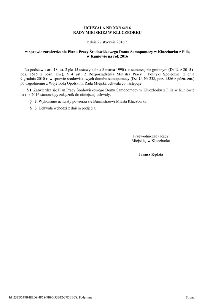 UCHWAŁA NR XX/164/16 RADY MIEJSKIEJ W KLUCZBORKU z dnia 27 stycznia 2016 r. w sprawie zatwierdzenia Planu Pracy Środowiskowego Domu Samopomocy w Kluczborku z Filią w Kuniowie na rok 2016 Na podstawie art. 18 ust. 2 pkt 15 ustawy z dnia 8 marca 1990 r. o samorządzie gminnym (Dz.U. z 2015 r. poz. 1515 z późn. zm.), § 4 ust. 2 Rozporządzenia Ministra Pracy i Polityki Społecznej z dnia 9 grudnia 2010 r. w sprawie środowiskowych domów samopomocy (Dz. U. Nr 238, poz. 1586 z późn. zm.) po uzgodnieniu z Wojewodą Opolskim, Rada Miejska uchwala co następuje: § 1. Zatwierdza się Plan Pracy Środowiskowego Domu Samopomocy w Kluczborku z Filią w Kuniowie na rok 2016 stanowiący załącznik do niniejszej uchwały. § 2. Wykonanie uchwały powierza się Burmistrzowi Miasta Kluczborka. § 3. Uchwała wchodzi z dniem podjęcia. Przewodniczący Rady Miejskiej w Kluczborku Janusz Kędzia Id: 25ED248B-BBD8-4F28-8B90-35BE2C9DEEC8. Podpisany Strona 1 Załącznik do Uchwały Nr XX/164/16 Rady Miejskiej w Kluczborku z dnia 27 stycznia 2016 r. Plan Pracy Środowiskowego Domu Samopomocy w Kluczborku Z Filią w Kuniowie na rok 2016 L.p. Nazwa zadania Adresaci zadania 1. Trening funkcjonowania w codziennym życiu - trening kulinarny Uczestnicy ŚDS – zgodnie z ustaleniami zespołu wspierająco – aktywizującego i indywidualnym planem wspierająco – aktywizującym danego uczestnika. 2. Trening funkcjonowania w codziennym Uczestnicy ŚDS – zgodnie z ustaleniami zespołu wspierająco – Id: 25ED248B-BBD8-4F28-8B90-35BE2C9DEEC8. Podpisany Metody, techniki, Formy narzędzia Termin realizacji wykorzystywa realizacji Opis spodziewanych efektów zadania - ne przy zadania realizacji zadania FUNKCJONAWANIE W CODZIENNYM ŻYCIU Trening Wykonywanie Codzienne Uczestnicy potrafią samodzielnie lub praktyczny zadania treningi w asyście terapeuty przygotować według przez cały posiłki oraz piec ciasta. Czytać instruktażu rok. ze zrozumieniem przepisy kulinarne, słownego nalewać płyny, wybierać właściwe terapeuty oraz produkty do określonego posiłku, demonstroukładać jadłospis, dobierać wania i obsługiwać sprzęt AGD, wybierać czynności. właściwe sztućce i posługiwać się nimi, zmywać i wycierać naczynia. Uczestnicy potrafią przygotowywać przetwory na zimę. Znają sposoby prawidłowego przechowywania żywności (przetworzonej i surowej). Uczestnicy kultywują tradycje świąteczne poprzez przygotowanie śniadania wielkanocnego (samodzielne przygotowanie potraw i pieczenie ciast) oraz wieczerzy wigilijnej (samodzielne przygotowanie potraw ). Trening Wykonywanie Raz w Uczestnicy potrafią samodzielnie lub praktyczny zadania tygodniu, w asyście terapeuty prać ręcznie według przez cały i obsłużyć pralkę automatyczną Osoby odpowiedzialne za realizację zadania Terapeuta odpowiedzialny za prowadzenie zajęć na pracowni kulinarnej. Terapeuta odpowiedzialny za prowadzenie Strona 2 życiu - trening prania aktywizującego i indywidualnym planem wspierająco – aktywizującym danego uczestnika. 3. Trening funkcjonowania w codziennym życiu - trening prasowania Uczestnicy ŚDS – zgodnie z ustaleniami zespołu wspierająco – aktywizującego i indywidualnym planem wspierająco – aktywizującym danego uczestnika. 4. Trening funkcjonowania w codziennym życiu Treningi samoobsługi: samodzielnego jedzenia, mycia rąk, ubierania się, zgłaszania i załatwiania potrzeb fizjologicznych; Uczestnicy ŚDS – zgodnie z ustaleniami zespołu wspierająco – aktywizującego i indywidualnym planem wspierająco – aktywizującym danego uczestnika. Id: 25ED248B-BBD8-4F28-8B90-35BE2C9DEEC8. Podpisany instruktażu słownego terapeuty oraz demonstrowania czynności. rok. Trening praktyczny Wykonywanie zadania według instruktażu słownego terapeuty oraz demonstrowania czynności. Raz w tygodniu, przez cały rok. Trening praktyczny Wykonywanie zadania według instruktażu słownego terapeuty oraz demonstrowania czynności. Codzienne treningi przez cały rok. zgodnie z instrukcją pralki. Prawidłowo dobrać kolory, tkaniny i temperaturę wody, wieszać pranie na suszarce oraz układać po wyschnięciu. Poprzez udział w treningach uczestnicy odczuwają potrzebę wdrażania nabytych umiejętności w życie codzienne. Uczestnicy potrafią samodzielnie/ w asyście terapeuty prasować proste lub skomplikowane rzeczy, poskładać odzież po wyprasowaniu, przygotować stanowisko pracy oraz posprzątać po zakończonym treningu, stosować wyuczone czynności w życiu codziennym, potrafią skupić uwagę na wykonanej czynności. Przestrzegają zasad bezpieczeństwa podczas treningu. Uczestnicy potrafią samodzielnie lub przy pomocy terapeuty spożywać posiłki, posługują się łyżką, widelcem. Uczestnicy potrafią samodzielnie lub w asyście terapeuty ubierać wierzchnie ubranie (zakładać kurtkę, buty). Uczestnicy potrafią samodzielnie załatwiać potrzeby fizjologiczne. Zgłaszają potrzeby fizjologiczne. Uczestnicy potrafią samodzielnie lub w asyście terapeuty myć ręce. treningu prania. Terapeuta odpowiedzialny za prowadzenie treningu prasowania. Wszyscy terapeuci Strona 3 Trening funkcjonowania w codziennym życiu – trening budżetowy Uczestnicy ŚDS – zgodnie z ustaleniami zespołu wspierająco – aktywizującego i indywidualnym planem wspierająco – aktywizującym danego uczestnika. Trening praktyczny i teoretyczny 6. Trening funkcjonowania w codziennym życiu – trening gospodarczotechniczny Uczestnicy ŚDS – zgodnie z ustaleniami zespołu wspierająco – aktywizującego i indywidualnym planem wspierająco – aktywizującym danego uczestnika. Trening praktyczny: sprzątania, dbania o rośliny, techniczny 7. Trening funkcjonowania w codziennym życiu – trening higieniczny teoretyczny Uczestnicy ŚDS – zgodnie z ustaleniami zespołu wspierająco – aktywizującego i indywidualnym planem wspierająco – Trening teoretyczny Trening praktyczny 5. Id: 25ED248B-BB