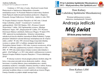 Andrzej Jedliczka ul. Parysa 67 20-712 Lublin tel. 81 526 84 95 Urodzony w 1935 roku w Łucku. Absolwent Liceum Sztuk Plastycznych w Sędziszowie Małopolskim o kierunku metaloplastycznym. Na Wydziale Malarstwa krakowskiej Akademii Sztuk Pięknych studiował pod kierunkiem profesorów: Zbigniewa Pronaszki, Jerzego Fedkowicza i Emila Krchy - dyplom w roku 1962. W Związku Polskich Artystów Plastyków od 1962 roku. Członek Grupy Lubelskiej „Zamek”. Uczestniczył w wystawach ogólnopolskich: 1962/1963 Radom, 1963 „Wystawa Czterech Województw" Lublin, 1965 Ogólnopolska wystawa „Młodego Malarstwa" Sopot, 1967 „Eksperyment 66" Lublin, 1971 Wystawa Dziewięciu Malarzy Lubelskich, Debreczyn (Węgry). W latach 19701980 zajmował się metaloplastyką - biżuterią i rekonstrukcją zabytkowych krat do obiektów muzealnych (Biała Podlaska). Z grupą plastyków lubelskich wykonał dekoracje metaloplastyczne do wnętrza statku „Lublin". W roku 1991 otworzył drugą swoją indywidualną wystawę w salonie ART w Lublinie, następnie brał udział we Wschodnim Salonie Sztuki w 1993 roku, wystawie rocznicowej „60 lat ZPAP" w 1996 roku, poplenerowej wystawie w Rzeszowie w roku 2001. W 1999 roku miała miejsce kolejna wystawa indywidualna w galerii „Pod Podłogą", a w 2011 roku udział w jubileuszowej wystawie Stulecia Związku Polskich Artystów Plastyków i 75-lecia lubelskiego ZPAP. W obecnej wystawie Artysta pragnie pokazać dorobek całego 50lecia, a więc prace powstałe tuż po ukończeniu studiów - obrazy lawowane o wyraźnej fakturze, prace metaloplastyczne z miedzi, przedmioty użytkowe z mosiądzu, biżuterię autorską w srebrze. Kończy przegląd pracami stricte malarskimi - pejzażem, w którym pragnie zatrzymać na płótnie obrazy ze swoich wędrówek po świecie (Węgry, Francja, Kanada) czy piękne zakątki naszego kraju. 55 lat Lubelskiej Spółdzielni Mieszkaniowej 2012 - Międzynarodowy Rok Spółdzielczości Dom Kultury Lubelskiej Spółdzielni Mieszkaniowej Wernisaż jubileuszowej wystawy malarstwa, metaloplastyki i biżuterii Andrzeja Jedliczki Mój świat 50-lecie pracy twórczej Dom Kultury LSM zaprasza Wykaz prac z wystawy jubileuszowej Tytuł pracy 1. 2. 3. 4. 5. 6. 7. 8. 9. 10. 11. 12. 13. 14. 15. 16. 17. 18. 19. 20. 21. 22. 23. 24. 25. 26. 27. 28. 29. 30. 31. 32. 33. 34. 35. 36. 38. 39. 40. 41. 42. 43. 44. 45. 46. 47. 48. 49. 50. 51. 52. 53. 54. 55. 56. 57. 58. 59. 60. 61. 62. 63. 64. 65. 66. 67. 68. Portret Sfera Zorza Narodziny Drzewo życia Ku końcowi Wschód słońca nad Wartą Zachód słońca nad Wartą Rozlewisko Warty Stóg Roztocze – Guciów Solec Zdrój Horyniec – Zalew Warta Zatoka Ontario Mgły nad polami Nad jeziorem Nad Krasnem Darłówek Zgliszcza dzwonnicy Kazimierz – Fara inaczej Niagara II Niagara III Poranne mgły Bałtyk przed sztormem Horyniec II Moja dzielnica Zatoka Pucka Kazimierz – Fara Przed burzą Nad wodą Warta Wola wielka – cerkiew Kościółek w Brzozowie Prusie – cerkiew Zalew w Horyńcu Falochron na Ontario Solec Zdrój I Solec Zdrój II Żaglówka Francja – Zamek Geneviers Pejzaż Łodzie w Darłówku Kapliczka Jeziorko Borek Mały Kopki siana Nidzica Guciów Żeglarz Żona Dziewczyna Pani w kapeluszu Ruda Przy samowarze Martwa natura Pejzaż Eksplozja Wschód nad Wartą Jeziorko Równina Węgierska Staw Lampa I Lampa II Lampa III Patera I Patera II Wymiary 73x40 80x80 40x60 Fi 62 93x51 103x48 54x67 54x67 60x73 60x80 73x60 46x55 30x55 42x58 41x52 40x50 40x50 33x45 33x45 55x38 40x32 75x90 48x95 24x51 24x51 24x51 33x33 32x40 33x27 23x32 26x33 28x41 27x33 24x30 18x24 18x24 18x24 18x24 18x24 18x24 41x33 30x40 18x24 27x37 27x37 30x41 23x30 32x41 33x41 50x40 45x33 50x41 74x60 68x60 73x60 60x53 66x76 60x70 33x42 33x42 33x42 33x42 Wys. 110 Wys. 72 Wys. 50 Fi 59 Fi 32 Technika Miedź Miedź Miedź Miedź Miedź Miedź Płótno, olej Płótno, olej Płótno, olej Płótno, olej Płótno, olej Płótno, olej Płótno, olej Płótno, olej Płótno, olej Płótno, olej Płótno, olej Płótno, olej Płótno, olej Płótno, olej Płótno, olej Płótno, olej Płótno, olej Płótno, olej Płótno, olej Płótno, olej Płótno, olej Płótno, olej Płótno, olej Płótno, olej Płótno, olej Płótno, olej Płótno, olej Płótno, olej Płótno, olej Płótno, olej Płótno, olej Płótno, olej Płótno, olej Płótno, olej Płótno, olej Płótno, olej Płótno, olej Płótno, olej Płótno, olej Płótno, olej Płótno, olej Płótno, olej Płótno, olej Płótno, olej Płótno, olej Płótno, olej Płótno, olej Płótno, olej Płótno, olej Płótno, olej Płótno, olej Płótno, olej Pastel Akwarela Pastel Pastel Mosiądz Mosiądz Mosiądz Miedź Mosiądz Rok 1972 1979 1975 1969 1981 2012 2010 2000 1996 2012 1999 2010 2007 2008 1999 2001 2009 1983 2000 2007 2011 1999 1999 2007 2000 2007 1972 2005 2012 2009 2006 2002 2006 2001 2004 2007 1999 2010 2010 2009 1997 1980 2001 2008 2008 1996 2001 2000 1996 2006 2009 2004 1964 1990 1970 1972 1975 1976 1998 2001 1997 1997 1973 1980 2011 2002 1985 55 lat Lubelskiej Spółdzielni Mieszkaniowej 2012 - Międzynarodowy Rok Spółdzielczości Dom Kultury Lubelskiej Spółdzielni Mieszkaniowej serdecznie zaprasza na wernisaż jubileuszowej wystawy malarstwa, metaloplastyki i biżuterii Andrzeja Jedliczki Mój świat 50-lecie pracy twórczej Wernisaż odbędzie się w piątek 7 grudnia 2012 r. o godz. 17.00 w Galerii Sztuki Domu Kultury LSM w Lublinie, ul. K. Wallenroda 4a, tel. 81 743 48 29 www.domkulturylsm.pl Wstęp wolny