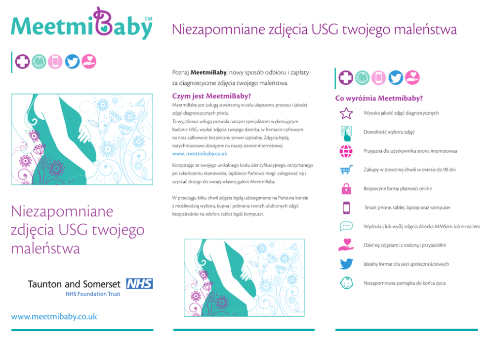 Meetmi aby TM Niezapomniane zdjęcia USG twojego maleństwa Poznaj MeetmiBaby, nowy sposób odbioru i zapłaty za diagnostyczne zdjęcia twojego maleństwa. Czym jest MeetmiBaby? MeetmiBaby jest usługą stworzoną w celu ulepszenia procesu i jakości zdjęć diagnostycznych płodu. Co wyróżnia Meetmibaby? Wysoka jakość zdjęć diagnostycznych Ta wyjątkowa usługa pozwala naszym specjalistom wykonującym badanie USG, wysłać zdjęcia twojego dziecka, w formacie cyfrowym na nasz całkowicie bezpieczny serwer szpitalny. Zdjęcia będą natychmiastowo dostępne na naszej stronie internetowej www. meetmibaby.co.uk Korzystając ze swojego unikalnego kodu identyfikacyjnego, otrzymanego po zakończeniu skanowania, będziecie Państwo mogli zalogować się i Dowolność wyboru zdjęć Przyjazna dla użytkownika strona internetowaa Zakupy w dowolnej chwili w okresie do 90 dni uzyskać dostęp do swojej własnej galerii MeetmiBaby. Bezpieczne formy płatności online W przeciągu kilku chwil zdjęcia będą udostępnione na Państwa koncie Niezapomniane zdjęcia USG twojego maleństwa z możliwością wyboru, kupna i pobrania twoich ulubionych zdjęć Smart phone, tablet, laptop oraz komputer bezpośrednio na telefon, tablet bądź komputer. Wydrukuj lub wyślij zdjęcia dziecka MMSem lub e-mailem Dziel się zdjęciami z rodziną i przyjaciółmi Idealny format dla sieci społecznościowych Taunton and Somerset NHS Foundation Trust www.meetmibaby.co.uk Niezapomniana pamiątka do końca życia Niezapomniane zdjęcia USG twojego maleństwa Taunton and Somerset Cennik NHS Foundation Trust Naszym celem jest uatrakcyjnienie państwa wspomnień z okresu przedporodowego Poszczególne zdjęcia Jak to działa? 1. Termin spotkania zostanie wysłany pocztą. 2. Po rejestracji w klinice przedporodowej zostaniesz poproszony o zajęcie miejsca w poczekalni. 1 x zdjęcie £10.00 (Wszystkie ceny zawierają 20% podatku VAT) Formy Płatności Oferujemy różne sposoby płatności, w tym płatność kartami Visa, MasterCard i Maestro. 3. Podczas skanowania diagnostycznego, jeśli to możliwe, specjalista wykona zdjęcie USG. 4. Specjalista USG przekaże Państwu unikalny kod, potrzebny do uzyskania dostępu do strony internetowej MeetmiBaby. Co mówią inni pacjęci ... 5. Po zalogowaniu się na stronie uzyskają Państwo dostęp do galerii zdjęć dziecka. 6. Stąd można zakupić wybrane zdjęcie. 7. W ciągu kilku chwil będziecie Państwo mieli możliwość pobrania swojego ulubionego zdjęcia bezpośrednio na telefon, tablet lub komputer. 8. Ciesz sie, przesyłaj i udostępniaj bliskim i znajomym skany swojego maleństwa. O W celu uzyskania więcej informacji, odwiedź naszą stronę internetową: www.meetmibaby.co.uk www.meetmibaby.co.uk Nicola Shipton, Taunton, Somerset: Wyłączenie odpowiedzialności Uwaga: Zdjęcia MeetmiBaby nie posiadają jakości zdjęć diagnostycznych i są wyłącznie przeznaczone do użytku osobistego . Nasi specjaliści i personel szpitalny nie są w stanie wydrukować Państwu zdjęć. 0345 055 9888 or [email protected] Meetmi aby www.meetmibaby.co.uk “To takie cudowne móc pokazać po raz pierwszy nasze maleństwo przyjaciołom i rodzinie” “Super, że teraz możemy podzielić się naszymi zdjęciami USG przez internet z bliskimi i przyjaciółmi, ktorzy mieszkają za granicą” “Prostota w obsłudze oraz wspaniała jakość zdjęć” Szpital nie może zagwarantować możliwości zrobienia zdjęcia dziecka, ponieważ zależy to od położenia dziecka oraz jakości obrazu, którego dotyczy pomiar BMI. TM Nowy serwis został opracowany, w celu znacznej poprawy jakości zdjęć noworodków oraz, co sie z tym wiąże, doświadczeń przyszłych mam. Chcemy, aby wszyscy nasi przyszli rodzice, wynieśli jak najwięcej dobrych wspomnień z tego cudownego okresu i wierzymy, że MeetmiBaby im w tym pomoże “Wspaniale jest posiadać zdjęcia na telefonie, dzieki temu nie muszę martwić się o to, że ktoś je może podrzeć bądź zniszczyć” Meetmi aby TM 0345 055 9888 [email protected]