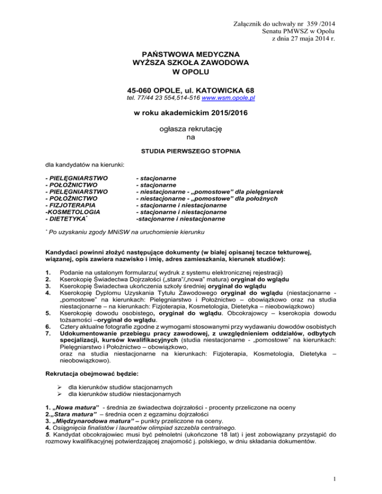 Załącznik do uchwały nr 359 /2014 Senatu PMWSZ w Opolu z dnia 27 maja 2014 r. PAŃSTWOWA MEDYCZNA WYŻSZA SZKOŁA ZAWODOWA W OPOLU 45-060 OPOLE, ul. KATOWICKA 68 tel. 77/44 23 554,514-516 www.wsm.opole.pl w roku akademickim 2015/2016 ogłasza rekrutację na STUDIA PIERWSZEGO STOPNIA dla kandydatów na kierunki: - PIELĘGNIARSTWO - POŁOŻNICTWO - PIELĘGNIARSTWO - POŁOŻNICTWO - FIZJOTERAPIA -KOSMETOLOGIA - DIETETYKA* * - stacjonarne - stacjonarne - niestacjonarne - „pomostowe” dla pielęgniarek - niestacjonarne - „pomostowe” dla położnych - stacjonarne i niestacjonarne - stacjonarne i niestacjonarne -stacjonarne i niestacjonarne Po uzyskaniu zgody MNiSW na uruchomienie kierunku Kandydaci powinni złożyć następujące dokumenty (w białej opisanej teczce tekturowej, wiązanej, opis zawiera nazwisko i imię, adres zamieszkania, kierunek studiów): 1. 2. 3. 4. 5. 6. 7. Podanie na ustalonym formularzu( wydruk z systemu elektronicznej rejestracji) Kserokopię Świadectwa Dojrzałości („stara”/„nowa” matura) oryginał do wglądu Kserokopię Świadectwa ukończenia szkoły średniej oryginał do wglądu Kserokopię Dyplomu Uzyskania Tytułu Zawodowego oryginał do wglądu (niestacjonarne „pomostowe” na kierunkach: Pielęgniarstwo i Położnictwo – obowiązkowo oraz na studia niestacjonarne – na kierunkach: Fizjoterapia, Kosmetologia, Dietetyka – nieobowiązkowo) Kserokopię dowodu osobistego, oryginał do wglądu. Obcokrajowcy – kserokopia dowodu tożsamości –oryginał do wglądu. Cztery aktualne fotografie zgodne z wymogami stosowanymi przy wydawaniu dowodów osobistych Udokumentowanie przebiegu pracy zawodowej, z uwzględnieniem oddziałów, odbytych specjalizacji, kursów kwalifikacyjnych (studia niestacjonarne - „pomostowe” na kierunkach: Pielęgniarstwo i Położnictwo – obowiązkowo, oraz na studia niestacjonarne na kierunkach: Fizjoterapia, Kosmetologia, Dietetyka – nieobowiązkowo). Rekrutacja obejmować będzie: dla kierunków studiów stacjonarnych dla kierunków studiów niestacjonarnych 1. „Nowa matura” - średnia ze świadectwa dojrzałości - procenty przeliczone na oceny 2.„Stara matura” – średnia ocen z egzaminu dojrzałości 3. „Międzynarodowa matura” – punkty przeliczone na oceny. 4. Osiągnięcia finalistów i laureatów olimpiad szczebla centralnego. 5. Kandydat obcokrajowiec musi być pełnoletni (ukończone 18 lat) i jest zobowiązany przystąpić do rozmowy kwalifikacyjnej potwierdzającej znajomość j. polskiego, w dniu składania dokumentów. 1 Niezaliczenie jednego z etapów procesu rekrutacji wyklucza przyjęcie na studia do Państwowej Medycznej Wyższej Szkoły Zawodowej w Opolu. W przypadku małej liczby kandydatów uczelnia zastrzega sobie prawo do nieuruchomienia kierunku. Niezłożenie kompletu dokumentów w wyznaczonym terminie skutkuje skreśleniem z listy osób zakwalifikowanych. Brak orzeczenia lekarskiego stwierdzającego brak przeciwwskazań zdrowotnych do podjęcia studiów w PMWSZ w Opolu na danym kierunku, skutkuje skreśleniem z listy osób przyjętych. Plan rekrutacji na I rok studiów na rok akademicki 2015/2016 1. 2. 3. 4. 5. Zakończenie rejestracji elektronicznej 17.07.2015 r. Ogłoszenie listy osób zakwalifikowanych 24.07.2015 r. Osoba zakwalifikowana zobowiązana jest osobiście złożyć komplet dokumentów do Instytutowej Komisji Rekrutacyjnej 27.07.2015 r. oraz 28.07.2015 r. w godz. 8.00- 15.00 Niezłożenie kompletu dokumentów w wyznaczonym terminie skutkuje skreśleniem z listy osób zakwalifikowanych. Komplet dokumentów składanych przez obcokrajowca musi być przetłumaczony na język polski przez tłumacza przysięgłego. Dopuszcza się złożenie dokumentów przez osoby trzecie, upoważnione notarialnie.( nie dotyczy obcokrajowców). Osoby przyjęte otrzymują od Instytutowej Komisji Rekrutacyjnej skierowanie do lekarza medycyny pracy. Orzeczenie lekarskie stwierdzającego brak przeciwwskazań zdrowotnych do podjęcia studiów w PMWSZ w Opolu na danym kierunku, należy dostarczyć do dnia 04.09.2015 r. do Działu Kształcenia i Spraw Studenckich ( dopuszcza się możliwość dostarczenia orzeczenia droga pocztowa za potwierdzeniem odbioru.). Brak orzeczenia skutkuje skreśleniem z listy osób przyjętych. Ogłoszenie wyników rekrutacji na wszystkich kierunkach – 29.07.2015 r. Termin składania odwołań do Uczelnianej Komisji Rekrutacyjnej . – do 12.08.2015 r. Podstawą odwołań od decyzji Komisji Rekrutacyjnej jest naruszenie warunków i trybu rekrutacji na studia. Nabór uzupełniający: (w przypadku niewypełnienia planowanych limitów przyjęć) 1. Zakończenie rejestracji elektronicznej 11.09.2015 r. 2. Ogłoszenie listy osób zakwalifikowanych 15.09.2015 r. 3. Osoba zakwalifikowana zobowiązana jest osobiście złożyć komplet dokumentów do Instytutowej Komisji Rekrutacyjnej 17.09.2015 r. w godz. 8.00- 15.00. Niezłożenie kompletu dokumentów w wyznaczonym terminie skutkuje skreśleniem z listy osób zakwalifikowanych. Komplet dokumentów składanych przez obcokrajowca musi być przetłumaczony na język polski przez tłumacza przysięgłego. Dopuszcza się złożenie dokumentów przez osoby trzecie, upoważnione notarialnie.( nie dotyczy obcokrajowców). Osoby przyjęte otrzymują od Instytutowej Komisji Rekrutacyjnej skierowanie do lekarza medycyny pracy. Orzeczenie lekarskie stwierdzającego brak przeciwwskazań zdrowotnych do podjęcia studiów w PMWSZ w Opolu na danym kierunku, należy dostarczyć do dnia 24.09.2015 r. do Działu Kształcenia i Spraw Studenckich ( dopuszcza się możliwość dostarczenia orzeczenia droga pocztowa za potwierdzeniem odbioru.). Brak orzeczenia skutkuje skreśleniem z listy osób przyjętych. 4. Ogłoszenie wyników rekrutacji na wszystkich kierunkach - 18.09.2015 r. 5. Termin składania odwołań do Uczelnianej Komisji Rekrutacyjnej - do 02.10.2015 r. Podstawą odwołań od decyzji Komisji Rekrutacyjnej jest naruszen