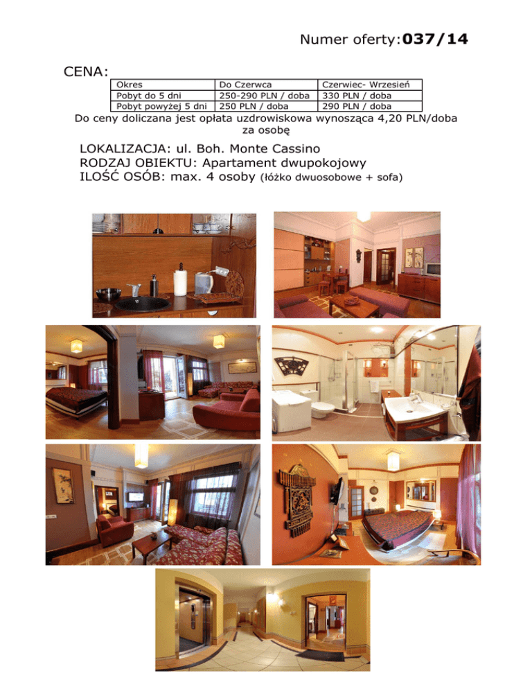 Numer oferty:037/14 CENA: Okres Pobyt do 5 dni Pobyt powyżej 5 dni Do Czerwca 250-290 PLN / doba 250 PLN / doba Czerwiec- Wrzesień 330 PLN / doba 290 PLN / doba Do ceny doliczana jest opłata uzdrowiskowa wynosząca 4,20 PLN/doba za osobę LOKALIZACJA: ul. Boh. Monte Cassino RODZAJ OBIEKTU: Apartament dwupokojowy ILOŚĆ OSÓB: max. 4 osoby (łóżko dwuosobowe + sofa) Numer oferty: 037/14 LOKALIZACJA: ul. Boh. Monte Cassino Lp. PRZEDMIOT OCENY UWAGI 1. Nowe/stare budownictwo 2. Nowe/stare meble 3. Parking na posesji/Garaż Nowa, ekskluzywna kamienica, I piętro, balkon wychodzący na ul. Boh. Monte Cassino Meble ekskluzywne, mieszkanie urządzone w stylu orientalnym, nowoczesność połączona z chińskimi antykami Miejsce parkingowe w garażu podziemnym 4. Balkon / taras / ogródek Balkon 5. Telewizor (Kablówka, TV Sat), Radio TV Sat w każdym pokoju, 6. Dostęp do telefonu Nie 7. Dostęp do internetu Tak 8. Dostęp do kuchni: Otwarty aneks kuchenny, który można ‘zamknąć w szafie’, kuchenka mikrofalowa, czajnik elektryczny, toster, naczynia i sztućce na 6 osób 9. Dostęp do łazienki: Łazienka z kabiną prysznicową, pralka, żelazko, suszarka do włosów Lodówka Kuchenka Czajnik bezprzewodowy Wyposażenie (sztućce, zastawa, garnki) Wanna Kabina prysznicowa Oddzielnie WC Łazienka współużytkowana 10. Pościel, ręczniki Dostępne na miejscu, dostępne też dodatkowe koce. 11. Dostęp do szafy / półek System szaf z drzwiami przesuwanymi 12. Pobyt ze zwierzątkiem NIE! 13. Pokój zamykany na klucz 14. Niepełnosprawni (winda, podjazd) Winda przed drzwiami apartartamentu, podjazd dla wózków 15. Plac zabaw dla dzieci Patio z galerią i kawiarnią 16. Centrum miasta, główny deptak, 400 m do molo i plaży, 700 m do Dworca PKP, 700 m do kortów tenisowych i krytej pływalni 17. Lokalizacja Centrum – Dworzec PKP Plaża, park Dzielnica Komunikacja miejska Osoby palące 18. Piwnica/schowek Możliwość przechowania rowerów w garażu 19. Faktura VAT lub Rachunek Faktura Vat, 20. Inne Tak