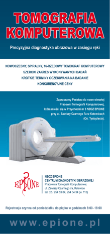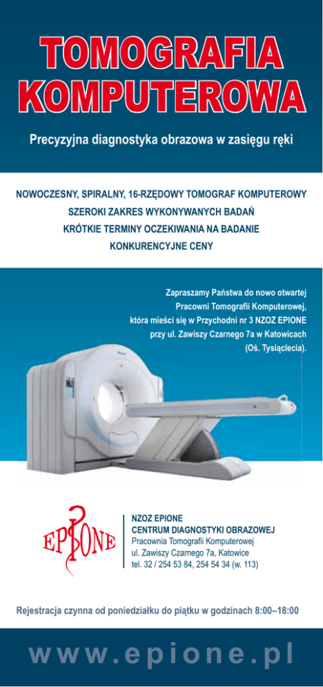 TOMOGRAFIA KOMPUTEROWA Precyzyjna diagnostyka obrazowa w zasięgu ręki NOWOCZESNY, SPIRALNY, 16-RZĘDOWY TOMOGRAF KOMPUTEROWY SZEROKI ZAKRES WYKONYWANYCH BADAŃ KRÓTKIE TERMINY OCZEKIWANIA NA BADANIE KONKURENCYJNE CENY Zapraszamy Państwa do nowo otwartej Pracowni Tomografii Komputerowej, która mieści się w Przychodni nr 3 NZOZ EPIONE przy ul. Zawiszy Czarnego 7a w Katowicach (Oś. Tysiąclecia). NZOZ EPIONE CENTRUM DIAGNOSTYKI OBRAZOWEJ Pracownia Tomografii Komputerowej ul. Zawiszy Czarnego 7a, Katowice tel. 32 / 254 53 84, 254 54 34 (w. 113) Rejestracja czynna od poniedziałku do piątku w godzinach 8:00 –18:00 w w w. e p i o n e . p l ZAKRES WYKONYWANYCH BADAŃ TOMOGRAFIA KOMPUTEROWA TK głowy 200,00 zł + kontrast zł + kontrast ZAKRES WYKONYWANYCH 250,00 BADAŃ TK przysadki mózgowej TK twarzoczaszki TOMOGRAFIA TK ucha środkowego TK oczodołów TK głowy K O M P U T E R200,00 O W Azł + kontrast TK zatok obocznych nosa TK przysadki mózgowej TK twarzoczaszki TK krtani TK środkowego TK tkanekucha miękkich szyi TK oczodołów TK kręgosłupa (1 odcinek) TK zatok obocznych nosa TK kości TK krtani TK stawów TK tkanek miękkich szyi TK klatki piersiowej(1 odcinek) TK kręgosłupa TK kości HRCT klatki piersiowej TK stawów TK klatki piersiowej z opcją naczyniową TK klatki piersiowej TK jamy brzusznej HRCT klatki piersiowej TK miednicy TK klatkimniejszej piersiowej z opcją naczyniową TK jamy i miednicy mniejszej TK brzusznej jamy brzusznej miednicy Angio TK – CT tętnicmniejszej dogłowowych TK jamy brzusznej Angio – CT koła Willisai miednicy mniejszej Angio – CT tętnic dogłowowych Angio – CT aorty brzusznej Angio – CT koła Willisa Angio Angio – CT –aorty piersiowej CT aorty brzusznej Angio Angio – CT –całej aorty CT aorty piersiowej Angio Angio – CT –tętnic nerkowych i nerek CT całej aorty Angio – CT tętnic nerkowych i nerek Angio – CT tętnic kończyn dolnych Angio – CT tętnic kończyn dolnych TK kolonoskopia TK kolonoskopia TK bronchoskopia TK bronchoskopia Kontrast niskoosmolarny Kontrast niskoosmolarny Kontrast doustny Kontrast doustny 250,00 zł 200,00 zł + kontrast 200,00 zł + kontrast 200,00 zł 250,00 zł + kontrast 200,00 zł + kontrast 250,00 zł + kontrast 250,00 zł + kontrast 250,00 zł + kontrast 200,00 zł + kontrast 270,00 zł 200,00 zł + kontrast 250,00 zł 250,00 zł + kontrast 250,00 zł 250,00 zł + kontrast 300,00 zł + kontrast 270,00 zł + kontrast 250,00 zł + kontrast 250,00 zł 250,00 zł + kontrast 400,00 zł + kontrast 300,00 zł + kontrast 300,00 zł + kontrast 250,00 zł + kontrast 300,00 zł + kontrast 400,00 zł + kontrast 400,00 zł + kontrast 300,00 zł + kontrast 300,00 zł + kontrast 400,00 zł 400,00 zł + kontrast 400,00 zł 400,00 zł + kontrast 400,00 zł 400,00 zł + kontrast 400,00 zł 400,00 zł + kontrast 600,00 zł 400,00 zł + kontrast 400,00 zł 600,00 zł + kontrast 400,00 zł + kontrast 400,00 zł 400,00 zł + kontrast 500,00 zł + kontrast 500,00 zł + kontrast 500,00 zł + kontrast 500,00 zł + kontrast 60,00 60,00 – 100,00 zł – 100,00 zł 30,00 zł 30,00 zł ww w .. ee p p ii o o nn ee.. ppll www