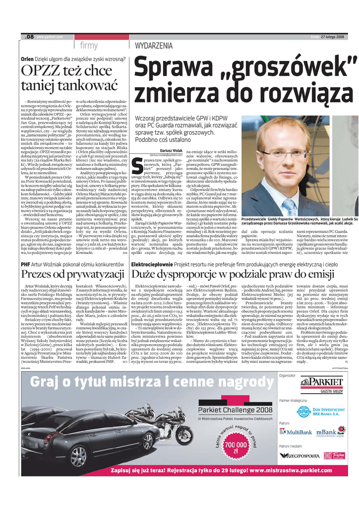 .08 www.parkiet.com środa 27 lutego 2008 firmy Orlen Dzięki ulgom dla związków zyski wzrosną? OPZZ też chce taniej tankować – Rozważymy możliwość ponownego wystąpienia do Orlenu z propozycją wprowadzenia zniżek dla członków OPZZ – powiedział wczoraj „Parkietowi” Jan Guz, przewodniczący tej centrali związkowej. Ma jednak wątpliwości, czy – ze względu na „zamieszanie polityczne”, jakie towarzyszy ostatnio sprawie zniżek dla związkowców – to najwłaściwszy moment na takie negocjacje. OPZZ wyszedł z podobną inicjatywą już przed trzema laty (za rządów Marka Belki). Wtedy jednak związkowcy usłyszeli od przedstawicieli Orlenu, że to niemożliwe. W poniedziałek prezes Orlenu Piotr Kownacki powiedział, że koncern mógłby udzielać ulg na zakup paliwa nie tylko członkom Solidarności. – Gdyby jakiś inny, masowy związek zawodowy zwrócił się z podobną ofertą, to bylibyśmy gotowi podjąć rozmowy również z tą organizacją – stwierdził szef koncernu. Wczoraj na nasze pytanie o ewentualną umowę z OPZZ biuro prasowe Orlenu odpowiedziało: „Jeśli jakakolwiek organizacja czy instytucja, mająca status podmiotu gospodarczego, zgłosi się do nas, zagwarantuje zakup określonej ilości paliwa, to podejmiemy negocjacje w celu określenia odpowiedniego rabatu, odpowiadającego zadeklarowanemu wolumenowi”. Orlen wynegocjował (choć jeszcze nie podpisał) umowę z należącą do Komisji Krajowej Solidarności spółką Solkarta. Strony nie zdradzają warunków porozumienia, ale według naszych informacji, członkom Solidarności za każdy litr paliwa kupowany na stacjach Bliska i Orlen płaciliby odpowiednio o 4 lub 8 gr mniej niż pozostali klienci (nic nie wiadomo, czy ustalono z Solkartą minimalny wolumen zakupu paliwa). Analitycy powątpiewają w korzyści, jakie miałby z tego typu umowy Orlen. Po naszej publikacji nt. umowy z Solkartą przewodniczący rady nadzorczej Orlenu Maciej Mataczyński poprosił prezesa koncernu o wyjaśnienia w tej sprawie. Kownacki uznał jednak, że wykracza to poza zasady ładu korporacyjnego, jakie obowiązują w spółce, i nie zamierza wstrzymywać prac nad umową z Solkartą. Przekonuje też, że porozumienie przełoży się na wyniki Orlenu. – W pierwszym roku dzięki tej umowie zysk netto ma wzrosnąć o 3 mln zł, a w każdym kolejnym o 12 mln zł – powiedział BAM Kownacki. PHF Artur Woźniak pokonał ośmiu konkurentów WYDARZENIA Sprawa „groszówek” zmierza do rozwiąza Wczoraj przedstawiciele GPW i KDPW oraz PC Guarda rozmawiali, jak rozwiązać sprawę tzw. spółek groszowych. Podobno coś ustalono Dariusz Wolak na emisje idące w setki milionów walorów, oferowanych prawa tzw. spółek gro- „po nominale” z zachowaniem szowych, którą „Par- prawa poboru. GPW zasygnalikiet” poruszył jako zowała, że może przesunąć tzw. pierwszy, przyciąga groszowe spółki z systemu nouwagę tych, którzy „lubują się” towań ciągłych do fixingu, co w inwestowaniu w tego typu pa- skutecznie ukróciłoby spekulapiery. Dla spekulantów kilkuna- cję ich akcjami. stoprocentowe zmiany kursu Odpowiedź firm była bardzo w ciągu dnia są doskonałą oka- szybka. PC Guard już na 7 marzją do zarobku. Odbywa się to ca zaplanował walne zgromakosztem mniej wprawnych in- dzenie, które miało zająć się tewestorów, którzy skuszeni matem scalenia papierów. Akperspektywą olbrzymich zy- cjonariusze mieli zdecydować, sków kupują akcje groszowych że każde sto papierów informaspółek. tycznej spółki o wartości nomiZarząd Giełdy Papierów War- nalnej 1 gr każdy zostanie połątościowych, w porozumieniu czonych w jeden o wartości noz Komisją Nadzoru Finansowe- minalnej 1 zł. Rok wcześniej pogo, postanowił ukrócić splity znańska firma podzieliła walory (podziały) akcji, po których w stosunku 1 do 100. Marcowe wartość nominalna spada posiedzenie udziałowców do 1 grosza. W kolejnym ruchu zostało jednak przełożone, bo spółki często decydują się nie wiadomo było, jak ma wyglą- S [email protected] Przedstawiciele Giełdy Papierów Wartościowych, którą kieruje Ludwik So zarządzanego przez Dariusza Grześkowiaka rozmawiali, jak scalić akcje. dać cała operacja scalania papierów. Sprawa miała być wyjaśniona na wczorajszym spotkaniu przedstawicieli GPW i KDPW, na które zostali również zapro- szeni reprezentanci PC Guarda. Niestety, mimo że temat interesuje bardzo wielu inwestorów (spółkami groszowymi handlują głównie gracze indywidualni), uczestnicy spotkanie nie Elektrociepłownie Projekt resortu nie preferuje firm produkujących energię elektryczną i ciepło Prezes od prywatyzacji Duże dysproporcje w podziale praw do emisji Artur Woźniak, który decyzją rady nadzorczej objął stanowisko szefa Polskiego Holdingu Farmaceutycznego, ma przede wszystkim przeprowadzić prywatyzację trzech Polf wchodzących w jego skład: warszawskiej, tarchomińskiej i pabianickiej. Świadczy o tym choćby fakt, że nowy prezes nie ma doświadczenia w branży farmaceutycznej. Choć z wykształcenia jest inżynierem (absolwentem Wyższej Szkoły Inżynierskiej w Zielonej Górze), przez kilka lat (1995–2000) pracował w Agencji Prywatyzacji w Ministerstwie Skarbu Państwa (wcześniej Ministerstwo PrzeREKLAMA kształceń Własnościowych). Z naszych informacji wynika, że uczestniczył m.in. w prywatyzacji Elektrociepłowni Kraków i branży tytoniowej. – Właśnie dlatego pokonał ośmiu innych kandydatów – mówi Mirosław Miara, jeden z członków rady. Woźniak najlepiej przeszedł rozmowę kwalifikacyjną, w czasie której wszyscy kandydaci odpowiadali na te same punktowane pytania (liczyła się liczba zdobytych punktów). – Konkurs pomyślany był tak, by kryteria były jak najbardziej obiektywne – tłumaczy Hubert ZaMCH wadzki, prokurent PHF. Elektrociepłownie zawodowe z niepokojem oczekują na oficjalny podział uprawnień do emi