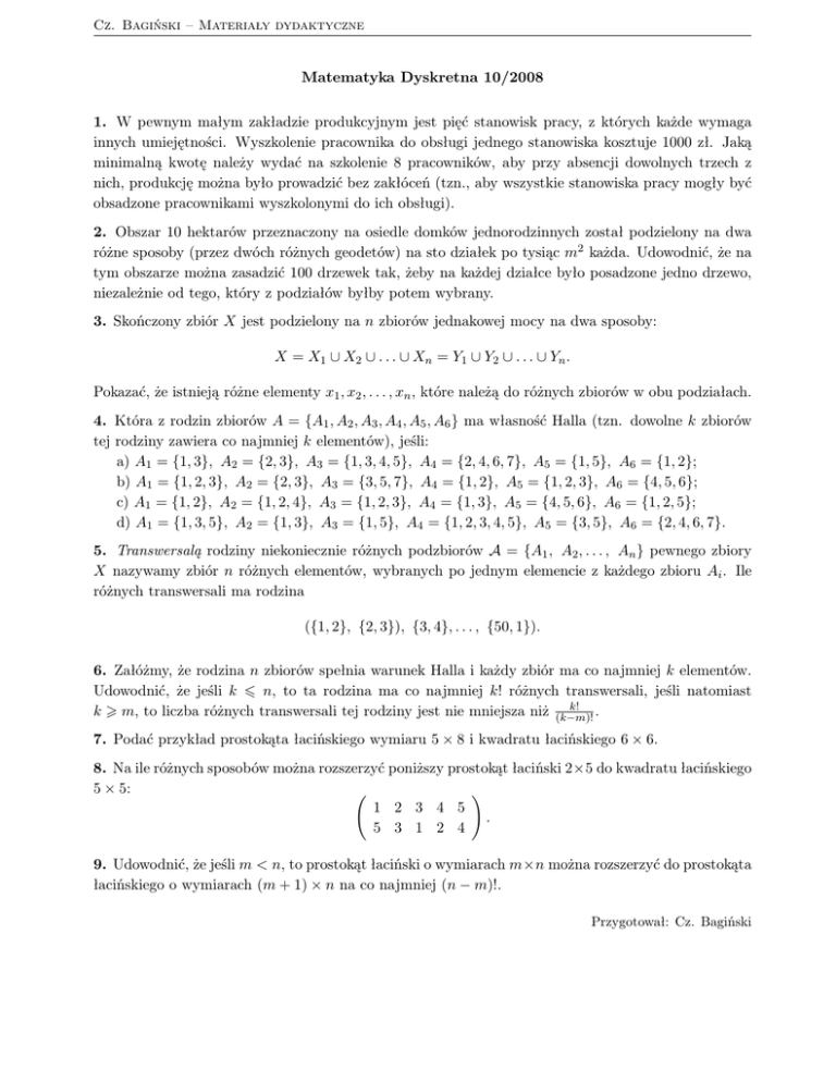 5. Transwersalą rodziny niekoniecznie różnych podzbiorów A = {A1 , A2 , . . . , An } pewnego zbiory