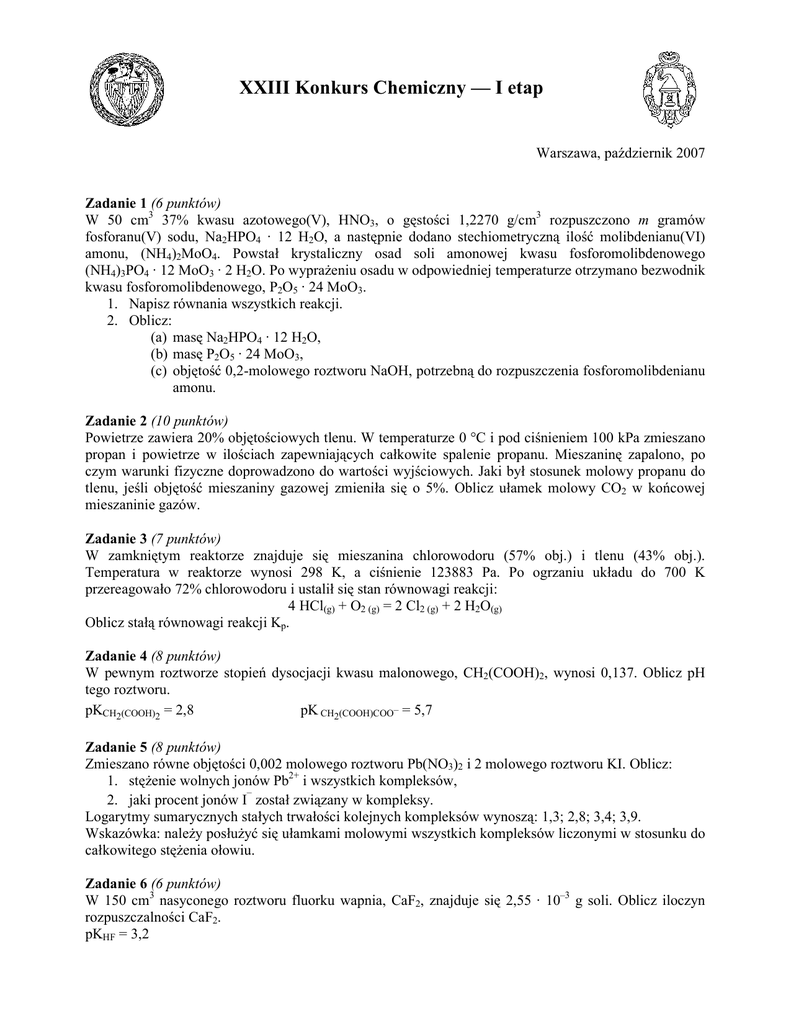XXIII Konkurs Chemiczny — I etap Warszawa, październik 2007 Zadanie 1 (6 punktów) W 50 cm3 37% kwasu azotowego(V), HNO3, o gęstości 1,2270 g/cm3 rozpuszczono m gramów fosforanu(V) sodu, Na2HPO4 · 12 H2O, a następnie dodano stechiometryczną ilość molibdenianu(VI) amonu, (NH4)2MoO4. Powstał krystaliczny osad soli amonowej kwasu fosforomolibdenowego (NH4)3PO4 · 12 MoO3 · 2 H2O. Po wyprażeniu osadu w odpowiedniej temperaturze otrzymano bezwodnik kwasu fosforomolibdenowego, P2O5 · 24 MoO3. 1. Napisz równania wszystkich reakcji. 2. Oblicz: (a) masę Na2HPO4 · 12 H2O, (b) masę P2O5 · 24 MoO3, (c) objętość 0,2-molowego roztworu NaOH, potrzebną do rozpuszczenia fosforomolibdenianu amonu. Zadanie 2 (10 punktów) Powietrze zawiera 20% objętościowych tlenu. W temperaturze 0 °C i pod ciśnieniem 100 kPa zmieszano propan i powietrze w ilościach zapewniających całkowite spalenie propanu. Mieszaninę zapalono, po czym warunki fizyczne doprowadzono do wartości wyjściowych. Jaki był stosunek molowy propanu do tlenu, jeśli objętość mieszaniny gazowej zmieniła się o 5%. Oblicz ułamek molowy CO2 w końcowej mieszaninie gazów. Zadanie 3 (7 punktów) W zamkniętym reaktorze znajduje się mieszanina chlorowodoru (57% obj.) i tlenu (43% obj.). Temperatura w reaktorze wynosi 298 K, a ciśnienie 123883 Pa. Po ogrzaniu układu do 700 K przereagowało 72% chlorowodoru i ustalił się stan równowagi reakcji: 4 HCl(g) + O2 (g) = 2 Cl2 (g) + 2 H2O(g) Oblicz stałą równowagi reakcji Kp. Zadanie 4 (8 punktów) W pewnym roztworze stopień dysocjacji kwasu malonowego, CH2(COOH)2, wynosi 0,137. Oblicz pH tego roztworu. pKCH2(COOH)2 = 2,8 pK CH2(COOH)COO– = 5,7 Zadanie 5 (8 punktów) Zmieszano równe objętości 0,002 molowego roztworu Pb(NO3)2 i 2 molowego roztworu KI. Oblicz: 1. stężenie wolnych jonów Pb2+ i wszystkich kompleksów, – 2. jaki procent jonów I został związany w kompleksy. Logarytmy sumarycznych stałych trwałości kolejnych kompleksów wynoszą: 1,3; 2,8; 3,4; 3,9. Wskazówka: należy posłużyć się ułamkami molowymi wszystkich kompleksów liczonymi w stosunku do całkowitego stężenia ołowiu. Zadanie 6 (6 punktów) W 150 cm3 nasyconego roztworu fluorku wapnia, CaF2, znajduje się 2,55 · 10–3 g soli. Oblicz iloczyn rozpuszczalności CaF2. pKHF = 3,2 Zadanie 7 (8 punktów) Roztwór chlorku cyny, SnCl2, o pH = 1,5 nasycano gazowym siarkowodorem aż do całkowitego strącenia SnS (tzn., że stężenie jonów Sn2+ pozostałych w roztworze nie przekracza wartości 10–5 mol/dm3). Ile mg jonów Sn2+ pozostanie w 400 cm3 tego roztworu? Nasycony roztwór siarkowodoru zawiera 0,1 mola H2S w 1 dm3. pKrSnS = 25 pKH2S = 7,1 pKHS– = 12,9 Zadanie 8 (8 punktów) 20 g mieszaniny węglanów dwóch metali roztworzono w nadmiarze kwasu solnego, otrzymując odpowiednie chlorki. Następnie wydzielono metale, prowadząc elektrolizę przez 3 godziny, przy natężeniu prądu 2 A (zakładamy, że na katodzie wydzielają się tylko metale). Jaka objętość dwutlenku węgla (mierzona w warunkach normalnych) wydzieliła się w reakcji węglanów z kwasem solnym? Zadanie 9 (6 punktów) 1 g stali chromowej rozpuszczono w kwasie – otrzymano roztwór soli chromu(III). Chrom(III) utleniono do chromianu(VI) za pomocą bizmutanu(V) sodu.Następnie chromian zredukowano używając soli Mohra [Fe(NH4)2 · FeSO4 · 6 H2O]. Stechiometryczna ilość soli, potrzebna do zredukowania chromianu, równa jest jej zawartości w 51,9 cm3 0,1 molowego roztworu (w praktyce używa się nadmiaru odczynnika). Napisz równania reakcji i oblicz procentową zawartość chromu w stali. Zadanie 10 (8 punktów) Elektrolizowano 1 dm3 2,5 molowego roztworu NaClO3 prądem o natężeniu 3 A do momentu, gdy 95% NaClO3 uległo przemianie w NaClO4. Temperatura roztworu wynosiła 298 K. Wydajność prądowa była równa 80%. 1. Napisz równania reakcji elektrodowych. 2. Oblicz SEM powstałego wskutek elektrolizy ogniwa (a) w momencie, gdy zacznie wydzielać się gazowy wodór (przyjmij, że nastąpi to wtedy, gdy przez elektrolizer przepłynie ładunek Q = 2,34375 · 10–3 F), (b) w chwili kończenia elektrolizy. 3. Oblicz czas trwania elektrolizy. E0 ClO4–/ClO3– = + 1,189 V E0 OH–/H2 = – 0,8277 V R = 8,3143 J/(K · mol) Zadanie 11 (6 punktów) W reakcji dezoksybenzoiny (1,2-difenyloetanonu) z eterem chlorometylowoizopropylowym, prowadzonej wobec zasady, otrzymano produkt A o wzorze sumarycznym C18H20O2. Widmo 1H NMR związku A (δ, ppm): 0,96 (dublet, J = 6 Hz, 6H); 3,85 (septet, J = 6 Hz, 1H); 4,92 (singlet, 2H); 6,08 (singlet, 1H); 7,0-7,9 (multiplet, 10H). Podaj wzór strukturalny związku A i objaśnij, jak on powstał. Zadanie 12 (8 punktów) Jakie są relacje między diastereoizomery, itp.)? przedstawionymi parami związków (enancjomery, CH3 H Cl (a) Cl H Cl H (b) Cl D H3 C H H Cl Cl D H3 C H CH3 HO (c) H3C H Br Cl Br H H3C HO H H Cl H (d) H Cl H Cl H identyczne, Zadanie 13 (8 punktów) W poniższej reakcji powstaje produkt zawierający tylko jeden asymetryczny atom węgla. Jaki to produkt, jak on powstaje, czy jest optycznie czynny? H HO HBr ? H Zadanie 14 (9 punktów) Jak otrzymać S z substratów organicznych zawierających najwyżej cztery atomy węgla i dowolnych odczynników nieorganicznych? Zadanie 15 (12 punktów) Zaproponuj syntezy 3-metylobut-2-en-1-olu i 4-metylo-1,3-dioksanu z substratów organicznych zawierających najwyżej trzy atomy węgla i dowolnych odczynników nieorganicznych. Zadanie 16 (8 punktów) Jak z malonianu dietylu i innych dowolnych reagentów organicznych i nieorganicznych otrzymać związek B? B HO OH Związek B poddany działaniu katalitycznej ilości mocnego kwasu uległ cyklizacji do związku o wzorze sumarycznym C9H18O2. Podaj wzór tego związku. Zadanie 17 (12 punktów) Dysponując malonianem dietylu, (Z)-1,4-dichlorobut-2-enem i cyklopentanonem oraz dowolnymi odczynnikami nieorganicznymi, zaproponuj syntezy wszystkich izomerycznych kwasów cyklopenteno