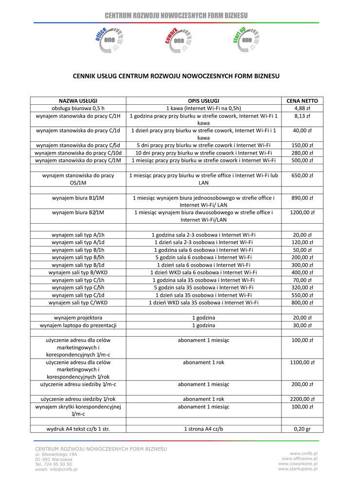 CENTRUM ROZWOJU NOWOCZESNYCH FORM BIZNESU CENNIK USŁUG CENTRUM ROZWOJU NOWOCZESNYCH FORM BIZNESU NAZWA USŁUGI obsługa biurowa 0,5 h wynajem stanowiska do pracy C/1H CENA NETTO 4,88 zł 8,13 zł wynajem stanowiska do pracy C/5d wynajem stanowiska do pracy C/10d wynajem stanowiska do pracy C/1M OPIS USŁUGI 1 kawa (Internet Wi-Fi na 0,5h) 1 godzina pracy przy biurku w strefie cowork, Internet Wi-Fi 1 kawa 1 dzień pracy przy biurku w strefie cowork, Internet Wi-Fi i 1 kawa 5 dni pracy przy biurku w strefie cowork i Internet Wi-Fi 10 dni pracy przy biurku w strefie cowork i Internet Wi-Fi 1 miesiąc pracy przy biurku w strefie cowork i Internet Wi-Fi wynajem stanowiska do pracy OS/1M 1 miesiąc pracy przy biurku w strefie office i Internet Wi-Fi lub LAN 650,00 zł wynajem biura B1/1M 1 miesiąc wynajem biura jednoosobowego w strefie office i Internet Wi-Fi/ LAN 1 miesiąc wynajem biura dwuosobowego w strefie office i Internet Wi-Fi/LAN 890,00 zł wynajem stanowiska do pracy C/1d wynajem biura B2/1M 40,00 zł 150,00 zł 280,00 zł 500,00 zł 1200,00 zł wynajem sali typ A/1h wynajem sali typ A/1d wynajem sali typ B/1h wynajem sali typ B/5h wynajem sali typ B/1d wynajem sali typ B/WKD wynajem sali typ C/1h wynajem sali typ C/5h wynajem sali typ C/1d wynajem sali typ C/WKD 1 godzina sala 2-3 osobowa i Internet Wi-Fi 1 dzień sala 2-3 osobowa i Internet Wi-Fi 1 godzina sala 6 osobowa i Internet Wi-Fi 5 godzin sala 6 osobowa i Internet Wi-Fi 1 dzień sala 6 osobowa i Internet Wi-Fi 1 dzień WKD sala 6 osobowa i Internet Wi-Fi 1 godzina sala 35 osobowa i Internet Wi-Fi 5 godzin sala 35 osobowa i Internet Wi-Fi 1 dzień sala 35 osobowa i Internet Wi-Fi 1 dzień WKD sala 35 osobowa i Internet Wi-Fi 20,00 zł 120,00 zł 50,00 zł 200,00 zł 300,00 zł 400,00 zł 70,00 zł 320,00 zł 550,00 zł 800,00 zł wynajem projektora wynajem laptopa do prezentacji 1 godzina 1 godzina 20,00 zł 30,00 zł użyczenie adresu dla celów marketingowych i korespondencyjnych 1/m-c użyczenie adresu dla celów marketingowych i korespondencyjnych 1/rok użyczenie adresu siedziby 1/m-c abonament 1 miesiąc 100,00 zł abonament 1 rok 1100,00 zł abonament 1 miesiąc 200,00 zł użyczenie adresu siedziby 1/rok wynajem skrytki korespondencyjnej 1/m-c abonament 1 rok abonament 1 miesiąc 2200,00 zł 100,00 zł wydruk A4 tekst cz/b 1 str. 1 strona A4 cz/b 0,20 gr CENTRUM ROZWOJU NOWOCZESNYCH FORM BIZNESU ul. Słowackiego 19A 01-592 Warszawa Tel. 724 95 50 50 email: [email protected] www.crnfb.pl www.officeone.pl www.coworkone.pl www.startupone.pl CENTRUM ROZWOJU NOWOCZESNYCH FORM BIZNESU wydruk A4 tekst kol 1 str. wydruk A3 tekst cz/b 1 str. wydruk A3 tekst kol 1 str. wydruk A4 grafika cz/b 1 str. wydruk A4 grafika kol 1 str. wydruk A3 grafika cz/b 1 str. wydruk A3 grafika kol 1 str. skanowanie A4/A3 cz/b ręczne 1strona skanowanie A4/A3 cz/b automat 1 strona skanowanie A4/A3 kol ręczne 1str 1 strona A4 kol 1 strona A3 cz/b 1 strona A3 kol 1 strona A4 grafika cz/b 1 strona A4 grafika kol 1 strona A3 grafika cz/b 1 strona A3 grafika kol 1 strona cz/b pierwsza (ręcznie) 1,70 zł 0,40 gr 3,40 zł 0,75 gr 2,00 zł 1,50 zł 4,00 zł 2,00 zł 1 strona cz/b kolejna (automat) 0,50 gr 1 strona kol pierwsza (ręcznie) 5,00 zł skanowanie A4/A3 kol automat 1 strona fax 1 strona logo na wejściu 1 m-c 1 strona kol kolejna (automat) 2,00 zł 1 strona fax Umieszczenie tabliczki z logotypem na wejściu 1,00 zł 25,00 zł CENTRUM ROZWOJU NOWOCZESNYCH FORM BIZNESU ul. Słowackiego 19A 01-592 Warszawa Tel. 724 95 50 50 email: [email protected] www.crnfb.pl www.officeone.pl www.coworkone.pl www.startupone.pl