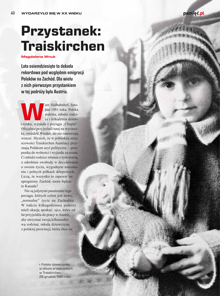 40 WYDARZYŁO SIĘ W XX WIEKU Przystanek: Traiskirchen Magdalena Wnuk Lata osiemdziesiąte to dekada rekordowa pod względem emigracji Polaków na Zachód. Dla wielu z nich pierwszym przystankiem w tej podróży była Austria. W W ien Südbahnhof, listopad 1981 roku. Polska rodzina, młodzi rodzice i kilkuletnia dziewczynka, wysiada z pociągu „Chopin”. Oficjalnie przyjechali tutaj na wycieczkę, zwiedzić Wiedeń, ale nie zamierzają wracać. Słyszeli, że w pobliskiej miejscowości Traiskirchen Austriacy przyznają Polakom azyl polityczny – przepustkę do wolności i wyjazdu za ocean. Ci młodzi rodzice właśnie o tym marzą, o odrobinie swobody w decydowaniu o swoim życiu, wygodnym mieszkaniu i pełnych półkach sklepowych. Liczą, że wszystko to zapewni im upragniony Zachód, może będzie to Kanada? Nie są jedynymi pasażerami tego pociągu, których celem jest nowe, „normalne” życie na Zachodzie. W trakcie kilkugodzinnej podróży mieli okazję spotkać: ojca, który od lat przyjeżdża do pracy w Austrii, aby utrzymać swoją kilkuosobową rodzinę; młodą dziewczynę z polskiej prowincji, która chce się Polska dziewczynka w obozie przejściowym w Traiskirchen, 26 grudnia 1981 roku 41 WYDARZYŁO SIĘ W XX WIEKU doskonalić jako pianistka pod okiem wiedeńskich nauczycieli; i niepokornego dziennikarza z Warszawy, którego przełożeni odsunęli od najciekawszych projektów. W 1982 roku o azyl w ośrodku dla uchodźców w Traiskirchen, wystąpiło 30 tys. Polaków. Nigdy wcześniej i nigdy później w tym kraju nie było tak dużej fali migracji z Polski. Austriacy nie byli zainteresowani przyjęciem na stałe tak licznej grupy obcokrajowców. W latach siedemdziesiątych i osiemdziesiątych XX wieku ten kraj nie prowadził otwartej polityki imigracyjnej. Jego celem było raczej ułatwienie uchodźcom dalszej podróży do krajów zamorskich. Za sprawą programów imigracyjnych takich państw, jak: Stany Zjednoczone, Kanada, Australia, Nowa Zelandia i RPA, Polacy i inni obywatele Europy Środkowo-Wschodniej mogli próbować legalnego wyjazdu za ocean. Dla wielu te programy stały się przepustką do upragnionego wolnego świata. Austria była jednym z głównych pośredników w polityce imigracyjnej tych krajów, obok RFN, Włoch, Szwecji czy Grecji. Zapewniała uchodźcom kilkumiesięcz- Fot. EastNews/AP Photo Fot. EastNews/AP Photo/Peter Knopp Przepustka do wolnego świata ne zakwaterowanie i wyżywienie, ale przeważnie nie zachęcała do pozostania. Większość Polaków wyjeżdżała. W latach osiemdziesiątych tylko kilkanaście tysięcy zdecydowało się pozostać w Austrii. „Wysiadłem z pociągu na Wien Südbahnhof. Na ulicy przed dworcem panował szalony ruch, kolorowe auta, kolorowe szyldy, reklamy. Wszystko zupełnie inne niż w Polsce” – opowiadał o swoim przyjeździe do Wiednia jeden z bohaterów reportażu Janusza Horodeckiego Ojczyzna kołem się toczy. Dość szybko podjął decyzję o pozostaniu na Zachodzie. Marzył o wyjeździe do Ameryki. Zgłosił się na policję, skąd został przewieziony do obozu w Traiskirchen. Tam, podobnie jak tysiącom innych Polaków, zabrano mu paszport, zrobiono zdjęcie i wystawiono tymczasowy dokument tożsamości. Po pierwszej rozmowie z policją otrzymał łóżko w zbiorowej sali w specjalnie wyznaczonym budynku. W obozie przejściowym w Austrii każdy nowo przybyły przechodził dwutygodniową kwarantannę, podczas której nie mógł opuszczać nie tylko ośrodka, lecz także wyznaczonych pomieszczeń. Po tym czasie mógł rozpocząć właściwą procedurę imigracyj- Polscy uchodźcy w Traiskirchen, 15 grudnia 1981 roku; z powodu przeludnienia ośrodka część łóżek ustawiono na korytarzu 42 WYDARZYŁO SIĘ W XX WIEKU ną, trwającą od trzech do dwunastu miesięcy. Podczas kolejnych wywiadów z urzędnikami azylanci deklarowali, do jakiego kraju chcieliby wyjechać. Następnie otrzymywali zaproszenie na „interwju” do ambasady lub konsulatu tego kraju. Jeśli spełniali kryteria zapotrzebowania na rynku pracy, mogli być prawie pewni, że otrzymają wizę. Bo USA, Kanada i Australia nie tyle przyjmowały potrzebujących uchodźców, ile poszukiwały potrzebnych na ich rynkach pracy specjalistów, fachowców i robotników. Na początku lat osiemdziesiątych warunki w obozie w Traiskirchen były bardzo złe. Ośrodek był przeludniony. Jak mówi jedna z ówczesnych pracownic obozu, mógł pomieścić bezpiecznie ok. 1–2 tys. osób, a w tym okresie liczba rejestrujących się była znacznie wyższa. Mieszkańcy mieli kłopoty z umyciem się, załatwieniem potrzeb fizjologicznych, o jakiejkolwiek prywatności nie mogło być mowy. Nawet jednak w takich warunkach niektórzy potrafili znaleźć dobre strony sytuacji, jak na przykład inny azylant: „Obóz jak dla mnie bardzo fajny, duża sala, to były kiedyś koszary, no i sala tak duża, łóżek chyba 80, koedukacyjna, fajnie było. Myśmy śpiewali dość dużo”. Długotrwałe zagęszczenie ludzi na niewielkiej przestrzeni groziło rozprzestrzenianiem się chorób i wybuchami agresji. O bójkach między mieszkańcami Traiskirchen, często różnych narodowości, donosiła wiedeńska prasa. Austriacki urząd do spraw cudzoziemców ratował sytuację, kwaterując ludzi w pensjonatach rozproszonych po całym kraju. Wiele z nich znajdowało się na terenie Styrii. Azylantów wysyłano do niewielkich górskich miejscowości, gdzie oprócz wycieczek nie mieli nic do roboty. W trakcie oczekiwania na wynik procedury większość nie otrzymywała zezwolenia na zatrudnienie w Austrii. Ich pobyt w tym kraju był przecież tymczasowy. Niektórzy, jeśli mieli szczęście i predyspozycje, podejmowali pracę na czarno. W prowincjonalnych WYDARZYŁO SIĘ W XX WIEKU austriackich miejscowościach w zasadzie jedyną możliwością była pomoc „u Bauera” przy żniwach lub winobraniu. Jeśli ktoś otrzymał zakwaterowanie w hotelu w Wiedniu, miał więcej m