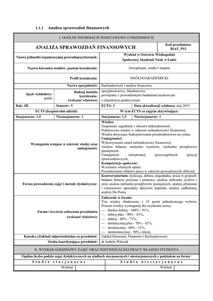 1.1.1 Analiza sprawozdań finansowych I. OGÓLNE INFORMACJE PODSTAWOWE O PRZEDMIOCIE Kod przedmiotu: RiAF_PS3 ANALIZA SPRAWOZDAŃ FINANSOWYCH Wydział w Ostrowie Wielkopolski Społecznej Akademii Nauk w Łodzi Nazwa jednostki organizacyjnej prowadzącej kierunek: Zarządzanie, studia I stopnia Nazwa kierunku studiów, poziom kształcenia: OGÓLNOAKADEMICKI Profil kształcenia: Nazwa specjalności: Język wykładowy: polski Rok: III Rodzaj modułu kształcenia: (wskazać właściwe) Semestr: V ECTS (bezpośredni udział): Stacjonarne: 1,5 Niestacjonarne: 1 Wymagania wstępne w zakresie wiedzy oraz umiejętności: Forma prowadzenia zajęć i metody dydaktyczne: Forma i kryteria zaliczania przedmiotu (wskazać właściwe): Katedra (Zakład) odpowiedzialna za przedmiot: Osoba koordynująca przedmiot: Rachunkowość i analiza finansowa specjalnościowy, fakultatywny powiązany z prowadzonymi badaniami naukowymi o charakterze praktycznym ECTS: 3 Data aktualizacji sylabusu: maj 2015 W tym ECTS za zajęcia aktywizujące: Stacjonarne: 1,5 Niestacjonarne: 1 Wiedza: Znajomość zagadnień z obszaru mikroekonomii. Podstawowa wiedza w zakresie rachunkowości finansowej. Wiedza dotycząca funkcjonowania przedsiębiorstwa na rynku. Umiejętności: Wykorzystanie zasad rachunkowości finansowej. Analiza bilansu, rachunku wyników, rachunku przepływów pieniężnych. Umiejętność interpretacji poszczególnych pozycji sprawozdawczych. Kompetencje społeczne: Wyrażanie własnych opinii. Prezentowanie efektów pracy w zakresie prowadzonych obliczeń. Konwersatorium: dyskusja, debata, pogadanka, praca w grupach: badanie bilansu poziome i pionowe, analiza rachunku zysków i strat, analiza rachunku przepływów pieniężnych, analiza płynności i rentowności sprzedaży aktywów kapitału, analiza zadłużenia, analiza Du Ponta. Zaliczenie w formie: Test wiedzy zbudowany z 25 pytań jednokrotnego wyboru. Procent wiedzy wymaganej dla uzyskania oceny: bardzo dobrej - 100% - 91%, dobrej plus - 90% - 81%, dobrej - 80% - 71%, dostatecznej plus - 70% - 61%, dostatecznej - 60% - 51%, niedostatecznej - 50% i mniej. Zakład Ekonomii, Finansów i Rachunkowości dr Izabela Witczak II. WYMIAR GODZINOWY ZAJĘĆ ORAZ INDYWIDUALNEJ PRACY WŁASNEJ STUDENTA Ogólna liczba godzin zajęć dydaktycznych na studiach stacjonarnych i niestacjonarnych z podziałem na formy: St udi a st acj onar ne Wykład: St udi a nie st ac j ona rne Wykład: Ćwiczenia: Konwersatorium: Ćwiczenia: Konwersatorium: 30 Laboratorium: Ćwiczenia projektowe: Laboratorium: Ćwiczenia projektowe: Warsztaty: Seminarium: Warsztaty: Seminarium: Zajęcia terenowe: Praktyki: Zajęcia terenowe: Praktyki: Konsultacje przedmiotowe: Egzaminy i zaliczenia w sesji 18 Konsultacje przedmiotowe: Egzaminy i zaliczenia w sesji 3 Inna forma (jaka): 2 Inna forma (jaka): RAZEM: 33 RAZEM: 20 Praca własna studenta (PWS): 42 Praca własna studenta (PWS): 55 RAZEM z PWS: 75 RAZEM z PWS: Sumaryczne obciążenie pracą studenta wg form aktywności: 75 Szacowana liczba godzin potrzebnych na zrealizowanie aktywności: Forma aktywności: studia stacjonarne studia niestacjonarne Godziny realizowane w bezpośrednim kontakcie z nauczycielem akademickim: 33 20 Praca własna studenta / związana z prowadzonymi badaniami naukowymi: Przygotowanie się do zajęć 42 55 10 10 Wykonanie projektów Zapoznanie z literaturą podstawową 12 25 Przygotowanie do egzaminu Przygotowanie do zaliczenia 20 20 75 75 Przygotowanie esejów/prezentacji/referatów SUMA: III. TREŚCI KSZTAŁCENIA Treści kształcenia (uszczegółowione, zaprezentowane z podziałem na poszczególne formy zajęć, opis szczegółowy poszczególnych bloków kształcenia): Konwersatorium: 1. 2. 3. 4. 5. 6. Istota analizy finansowej Metody analizy finansowej Źródła analizy finansowej i zasady ich weryfikacji Wykorzystanie sprawozdań finansowych w analizie sytuacji finansowej i majątkowej przedsiębiorstwa Analiza wskaźnikowa Analiza finansowa w ocenie zagrożenia działalności jednostki IV. OBSZAROWE I KIERUNKOWE EFEKTY KSZTAŁCENIA Kod wg KEK: Wiedza: Kod KRK: K_W14 zna standardowe metody statystyczne oraz wybrane inne metody ilościowe a także narzędzia informatyczne gromadzenia, analizy i prezentacji danych ekonomicznych i społecznych S1A_W06 K_W15 zna typowe metody badań i analiz w wybranych obszarach działalności organizacji S1A_W06 (np. analizy rynku, analizy finansowej, jakości produktów i usług) K_W18 posiada elementarną wiedzę na temat istoty i znaczenia wybranych norm i standardów w poszczególnych obszarach działalności organizacji (np. standardy rachunkowości, standardy znormalizowanych systemów zarządzania, normy pracy itp.) S1A_W07 Kod wg KEK: Umiejętności: Kod KRK: K_U01 posiada elementarne umiejętności obserwacji, opisu, analizy i interpretacji podstawowych zjawisk i procesów zachodzących w organizacji z wykorzystaniem podstawowych pojęć i ujęć teoretycznych S1A_U01, S1A_U02 K_U06 potrafi formułować i analizować problemy w celu rozwiązywania praktycznych problemów występujących w organizacji S1A_U02, S1A_U03 K_U07 potrafi zastosować i ocenić przydatność wybranych metod i narzędzi do opisu i analizy działalności organizacji S1A_U02, S1A_U03, S1A_U04 K_U09 ma elementarne umiejętności analizy i prognozowania poziomu i zmian wybranych wielkości i mierników osiągnięć organizacji S1A_U04 K_U12 potrafi zastosować wybrane metody i narzędzia analityczne oraz systemy informatyczne wspomagające procesy podejmowania decyzji S1A_U07, S1A_U04 Kod wg KEK: Kompetencje społeczne: Kod KRK: K_K02 jest przygotowany do organizowania i kierowania (na poziomie podstawowym) pracą zespołów (projektowych, zadaniowych itp.) i organizacji w środowisku pracy i poza nim S1A_K02 K_K03 posiada zdolności uczestniczenia w przygotowaniu i realizacji różnych projektów i ma świadomość możliwego oddziaływania skutków podejmowanych decyzji S1A_K05 K_K11 ma świadomość koniecz