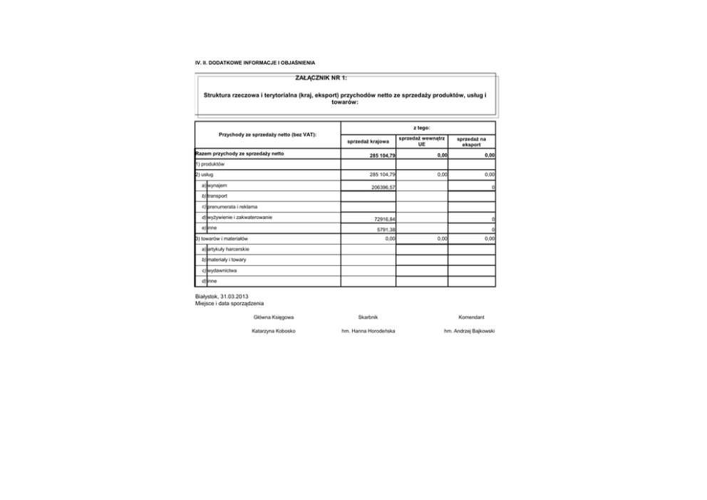 IV. II. DODATKOWE INFORMACJE I OBJAŚNIENIA ZAŁĄCZNIK NR 1: Struktura rzeczowa i terytorialna (kraj, eksport) przychodów netto ze sprzedaży produktów, usług i towarów: z tego: Przychody ze sprzedaży netto (bez VAT): sprzedaż krajowa Razem przychody ze sprzedaży netto sprzedaż wewnątrz UE sprzedaż na eksport 285 104,79 0,00 0,00 285 104,79 0,00 0,00 1) produktów 2) usług a) wynajem 206396,57 0 72916,84 0 b) transport c) prenumerata i reklama d) wyżywienie i zakwaterowanie e) inne 5791,38 3) towarów i materiałów 0,00 0 0,00 0,00 a) artykuły harcerskie b) materiały i towary c) wydawnictwa d) inne Białystok, 31.03.2013 Miejsce i data sporządzenia Główna Księgowa Skarbnik Katarzyna Kobosko hm. Hanna Horodeńska Komendant hm. Andrzej Bajkowski IV.II DODATKOWE INFORMACJE I OBJAŚNIENIA ZAŁĄCZNIK NR 5 Rozliczenie głównych pozycji różniących podstawę opodatkowania podatkiem dochodowym od wyniku finansowego brutto (zysku lub straty brutto)metodą wynikową: PRZYCHODY 1. Przychody wynikające z ksiąg rachunkowych łącznie z tego: 1) przychody ze składek członkowskich 2) inne przychody działalności statutowej 3) przychody działalności gospodarczej (ze sprzedaży) 4) pozostałe przychody operacyjne 5) przychody finansowe 6) zyski nadzwyczajne 2. Korekty przychodów - razem (+ lub -) z tego: 1) przychody niestanowiące przychodów podatkowych ( - ) c) obroty wewnętrzne do rozliczenia dotacji - wkład własny d) równowartość odpisów amortyzacyjnych środków trwałych sfinansowanych z dotacji 3. przychody podatkowe nie ujęte w księgach rachunkowych z oszacowania wartosci przychodu z tytułu nieodpłatnego użytkowania nieruchomości od osób prawnych 4. Przychody podatkowe ( 1 + 2 + 3 ) 5. Koszty wynikające z ksiąg rachunkowych łącznie z tego: 1) koszty działalności statutowej sfinansowanej ze składek 2) inne koszty działalności statutowej 3) koszty działalności gospodarczej (koszt własny sprzedanych produktów, towarów i usług) 4) koszty ogólnozakładowe, w tym ogólnoadministracyjne działalności statutowej 5) pozostałe koszty operacyjne 6) koszty finansowe 7) straty nadzwyczajne 6. Korekty kosztów wynikających z ksiąg rachunkowych - różnice trwałe łącznie ( - ) z tego: 1) zapłacone odsetki budżetowe 2) Niedobory kasowe uznane w koszty 3) amortyzacja środków trwałych oraz wartości niematerialnych i prawnych przeznaczona na cele statutowe 4) obroty wewnętrzne do rozliczenia dotacji - wkład własny 5) koszty sfinansowane z dotacji 6) renta wypłacana byłemu pracownikowi z tytułu wypadku przy pracy 7. Korekty kosztów wynikających z ksiąg rachunkowych - różnice przejściowe - łącznie ( - ) z tego: 1) ujęte w koszty a niewypłacone wynagrodzenia 2) ujęte w koszty lecz nie przekazane do ZUS składki na ubezpieczenia społeczne w części opłacanej przez pracodawcę oraz nieodprowadzone składki na FP i FGŚP 3) naliczone i niezapłacone odsetki od zobowiązań z tytułu dostaw i usług 8. Koszty podatkowe nie ujęte w księgach rachunkowych bieżącego roku z tego: 1) wypłacone umowy zlecenia naliczone w koszty 2011 r. 2) wpłacone składki ZUS płatnika oraz FP i FGŚP od wynagrodzeń za miesiąc grudzień 2011 3) naliczone w latach poprzednich odsetki od zobowiązań z tytułu dostaw i usług zapłacone w 2012r. 9. Koszty podatkowe - łącznie (poz. 5+6+7+8) 10. Dochód podatkowy (poz 4-9) ZŁ. 1810753,55 41655,68 1463191,83 285104,79 18615,01 2186,24 0,00 -117322,00 -117322,00 116902,00 420,00 13200,00 1706631,55 1702709,87 0,00 1489282,81 29934,15 159544,41 23085,58 862,92 0,00 -347843,19 246,39 267,3 47852,54 61090,00 220386,96 18000,00 -6021,98 3187,30 2611,17 223,51 6209,34 1265,00 2497,14 2447,20 1355054,04 351577,51 11. Dochód podatkowy przeznaczony na cele statutowe 12. Dochody zadeklarowane jako wolne od podatku a wydatkowane na cele niezgodne z celami statutowymi ZHP określonymi w art.. 17, ust. 1 ustawy o podatku dochodowym od osób prawnych stanowiące - tzw. "inne zobowiązania podatkowe" 13. Podatek dochodowy od osób prawnych stanowiący tak zwane inne zobowiązania podatkowe (19% x poz. 12) 333063,82 18513,69 3518 Białystok, 31.03.2013 Główna Księgowa Katarzyna Kobosko Skarbnik hm. Hanna Horodeńska Komendant hm. Andrzej Bajkowski IV. II. DODATKOWE INFORMACJE I OBJAŚNIENIA ZAŁĄCZNIK NR 6: Informacja o kosztach rodzajowych, w tym o kosztach wytworzenia produktów i uslug na własne potrzeby ( dotyczy Jednostek ZHP sporządzajacej wariant kalkulacyjny rachunku zysków i strat): Koszty wg rodzajów za rok: Wyszczególnienie kosztów poprzedni obrotowy Razem koszty 1 805 308,78 1 678 069,67 1 805 308,78 1 678 069,67 40 980,16 49 374,18 b) zużycie materiałów 631 871,42 531 377,44 c) zużycie energii 116 000,90 115 547,81 d) usługi obce 381 877,55 393 484,33 e) wynagrodzenia z umów o pracę 173 751,41 134 761,45 f) wynagrodzenia z umow cywilnoprawnych 146 880,74 145 446,02 g) ubezpieczenia społeczne i inne świadczenia 36 858,18 31 071,36 h) koszty podróży służbowych 39 108,89 42 875,62 0,00 124,23 9 280,00 19 292,83 228 699,53 214 714,40 z tego: 1. koszty operacyjne wg rodzajów: a) amortyzacja i) koszty reprezentacji i reklamy j) podatki i opłaty k) pozostałe koszty rodzajowe 2. koszty wytworzenia produktów i usług na własne potrzeby na potrzeby innych rodzajow dzialalności Białystok, 31.03.2013 Miejsce i data sporządzenia Główna Księgowa Katarzyna Kobosko Skarbnik hm. Hanna Horodeńska Komendant hm. Andrzej Bajkowski