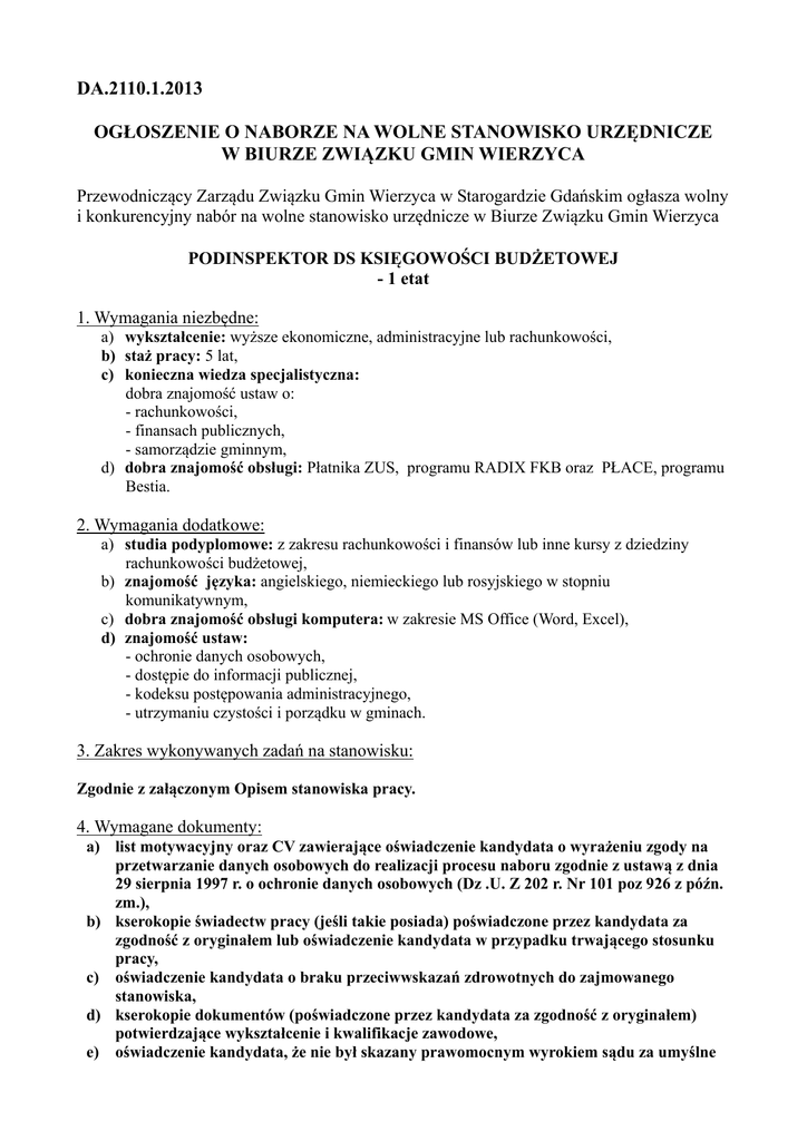 DA.2110.1.2013 OGŁOSZENIE O NABORZE NA WOLNE STANOWISKO URZĘDNICZE W BIURZE ZWIĄZKU GMIN WIERZYCA Przewodniczący Zarządu Związku Gmin Wierzyca w Starogardzie Gdańskim ogłasza wolny i konkurencyjny nabór na wolne stanowisko urzędnicze w Biurze Związku Gmin Wierzyca PODINSPEKTOR DS KSIĘGOWOŚCI BUDŻETOWEJ - 1 etat 1. Wymagania niezbędne: a) wykształcenie: wyższe ekonomiczne, administracyjne lub rachunkowości, b) staż pracy: 5 lat, c) konieczna wiedza specjalistyczna: dobra znajomość ustaw o: - rachunkowości, - finansach publicznych, - samorządzie gminnym, d) dobra znajomość obsługi: Płatnika ZUS, programu RADIX FKB oraz PŁACE, programu Bestia. 2. Wymagania dodatkowe: a) studia podyplomowe: z zakresu rachunkowości i finansów lub inne kursy z dziedziny rachunkowości budżetowej, b) znajomość języka: angielskiego, niemieckiego lub rosyjskiego w stopniu komunikatywnym, c) dobra znajomość obsługi komputera: w zakresie MS Office (Word, Excel), d) znajomość ustaw: - ochronie danych osobowych, - dostępie do informacji publicznej, - kodeksu postępowania administracyjnego, - utrzymaniu czystości i porządku w gminach. 3. Zakres wykonywanych zadań na stanowisku: Zgodnie z załączonym Opisem stanowiska pracy. 4. Wymagane dokumenty: a) list motywacyjny oraz CV zawierające oświadczenie kandydata o wyrażeniu zgody na przetwarzanie danych osobowych do realizacji procesu naboru zgodnie z ustawą z dnia 29 sierpnia 1997 r. o ochronie danych osobowych (Dz .U. Z 202 r. Nr 101 poz 926 z późn. zm.), b) kserokopie świadectw pracy (jeśli takie posiada) poświadczone przez kandydata za zgodność z oryginałem lub oświadczenie kandydata w przypadku trwającego stosunku pracy, c) oświadczenie kandydata o braku przeciwwskazań zdrowotnych do zajmowanego stanowiska, d) kserokopie dokumentów (poświadczone przez kandydata za zgodność z oryginałem) potwierdzające wykształcenie i kwalifikacje zawodowe, e) oświadczenie kandydata, że nie był skazany prawomocnym wyrokiem sądu za umyślne przestępstwo ścigane z oskarżenia publicznego lub umyślne przestępstwo skarbowe, f) inne dokumenty o posiadanych kwalifikacjach i umiejętnościach, g) kandydat chcący skorzystać z uprawnienia, o którym mowa w art. 13 a ust 2 ustawy o pracownikach samorządowych (Dz.U. z 2008 r. Nr 223, poz. 1458 z późn. zm.)jest obowiązany do złożenia wraz z w/w dokumentami kopii dokumentu potwierdzającego niepełnosprawność. Wymagane dokumenty aplikacyjne należy składać lub przesłać w terminie do dnia 11 marca 2013 r. godz. 15.00 pod adresem: Związek Gmin Wierzyca, ul. Zblewska 18, 83-200 Starogard Gdański w zaklejonych kopertach z dopiskiem: „Nabór na wolne stanowisko pracy Podinspektor ds. księgowości budżetowej w Biurze Związku Gmin Wierzyca”. Aplikacje, które wpłyną do Biura Związku po wyżej określonym terminie nie będą rozpatrywane. Z regulaminem naboru można się zapoznać w Biurze Związku Gmin Wierzyca ul. Zblewska 18, 83-200 Starogard Gdański w dni robocze od 8.00 - 14.00. Dodatkowe informacje można uzyskać pod numerem telefonu (58) 56 21 997 . Kandydaci spełniający wymagania formalne i dopuszczeni do II etapu konkursu zostaną o tym powiadomieni telefonicznie wraz z podaniem terminu testu i rozmowy kwalifikacyjnej. Informacja o wskaźniku zatrudnienia osób niepełnosprawnych: W miesiącu poprzedzającym datę ogłoszenia o naborze wskaźnik zatrudnienia osób niepełnosprawnych w Biurze Związku Gmin Wierzyca, w rozumieniu przepisów o rehabilitacji zawodowej i społecznej oraz zatrudnianiu osób niepełnosprawnych, jest niższy niż 6%. Informacja o wyniku naboru będzie niezwłocznie po przeprowadzonym naborze umieszczona na tablicy ogłoszeń Biura oraz w BIP Związku Gmin Wierzyca w portalu Wrota Pomorza. Przewidywana forma zatrudnienia i termin: 1. umowa na czas określony, 2. termin zatrudnienia: od 1 kwietnia 2013 r. 3. wymiar: 1 etat. Przewodniczący Zarządu Związku Gmin Wierzyca Wojciech Pomin Opis stanowiska pracy 1.Nazwa stanowiska* Podinspektor ds. księgowości budżetowej 2. Wymiar czasu pracy pełny wymiar czasu 3.Nazwa komórki organizacyjnej Dział finansowo - księgowy 4.Relacje stanowiska do innych stanowisk, jednostek, podmiotów:** a) pracownik zastępuje głównego księgowego b) pracownik zastępowany jest c) pracownik współpracuje z głównego księgowego księgowością podatkową, Urzędem Skarbowym, ZUS, bankiem obsługującym 5. Szczegółowy zakres zadań oraz czynności wykonywanych na stanowisku Prowadzenie księgowości dla Zarządu Związku Gmin (Organ) Wprowadzanie planu dochodów i wydatków, wprowadzanie zmian w planach Weryfikacja i księgowanie wpływów dochodów budżetowych wg rodzaju Zasilanie wydatków budżetowych wg zapotrzebowania jednostki Sporządzanie sprawozdań budżetowych miesięcznych, kwartalnych i rocznych zgodnie w wymogami Ministra Finansów w zakresie dochodów, wydatków budżetowych oraz nadwyżce i deficycie budżetu. Sporządzanie zestawień obrotów i sald kont syntetycznych i analitycznych, dziennika obrotów Prowadzenie księgowości dla jednostki budżetowej Kontrola dokumentów finansowych pod względem formalnym i rachunkowym. Dekretacja dokumentów i księgowanie. Dokonywanie przelewów. Rejestracja zaangażowania wydatków wraz z bieżącą analizą. Wprowadzanie planu dochodów i wydatków, wprowadzanie zmian w planach. Weryfikacja i księgowanie wpływów opłat za wywóz odpadów komunalnych. Naliczanie płac i pochodnych, sporządzanie list płac. Naliczenie składek ZUS, fundusz pracy, podatku dochodowego od osób fizycznych. terminowe złożenie deklaracji i odprowadzanie na wskazane konta ZUS, US. Prowadzenie ewidencji wydatków strukturalnych. Comiesięczne uzgadnianie kosztów z wydatkami budżetowymi. Prowadzenie rozrachunków wobec dostawców. Prowadzenie ewidencji środków trwałych, naliczanie umorzeń. Prowadzenie ewidencji wartości materialnych i 