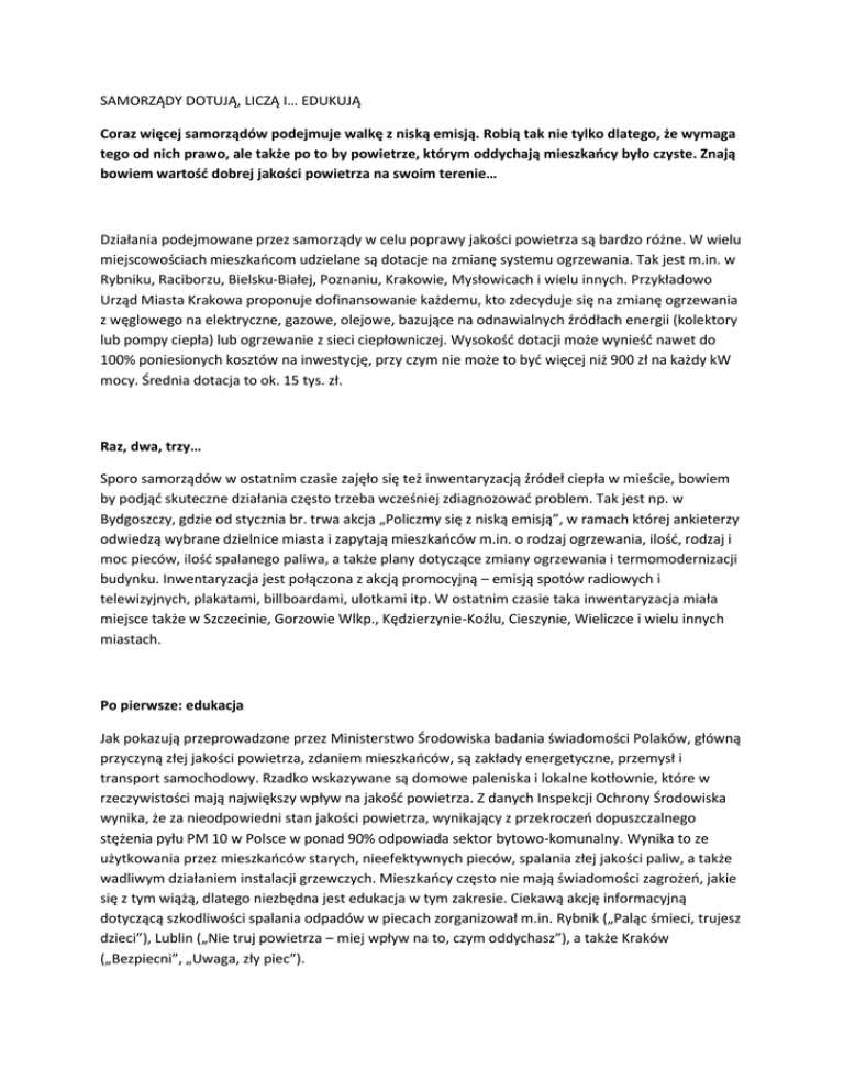 SAMORZĄDY DOTUJĄ, LICZĄ I… EDUKUJĄ Coraz więcej samorządów podejmuje walkę z niską emisją. Robią tak nie tylko dlatego, że wymaga tego od nich prawo, ale także po to by powietrze, którym oddychają mieszkaocy było czyste. Znają bowiem wartośd dobrej jakości powietrza na swoim terenie… Działania podejmowane przez samorządy w celu poprawy jakości powietrza są bardzo różne. W wielu miejscowościach mieszkaocom udzielane są dotacje na zmianę systemu ogrzewania. Tak jest m.in. w Rybniku, Raciborzu, Bielsku-Białej, Poznaniu, Krakowie, Mysłowicach i wielu innych. Przykładowo Urząd Miasta Krakowa proponuje dofinansowanie każdemu, kto zdecyduje się na zmianę ogrzewania z węglowego na elektryczne, gazowe, olejowe, bazujące na odnawialnych źródłach energii (kolektory lub pompy ciepła) lub ogrzewanie z sieci ciepłowniczej. Wysokośd dotacji może wynieśd nawet do 100% poniesionych kosztów na inwestycję, przy czym nie może to byd więcej niż 900 zł na każdy kW mocy. Średnia dotacja to ok. 15 tys. zł. Raz, dwa, trzy… Sporo samorządów w ostatnim czasie zajęło się też inwentaryzacją źródeł ciepła w mieście, bowiem by podjąd skuteczne działania często trzeba wcześniej zdiagnozowad problem. Tak jest np. w Bydgoszczy, gdzie od stycznia br. trwa akcja „Policzmy się z niską emisją”, w ramach której ankieterzy odwiedzą wybrane dzielnice miasta i zapytają mieszkaoców m.in. o rodzaj ogrzewania, ilośd, rodzaj i moc pieców, ilośd spalanego paliwa, a także plany dotyczące zmiany ogrzewania i termomodernizacji budynku. Inwentaryzacja jest połączona z akcją promocyjną – emisją spotów radiowych i telewizyjnych, plakatami, billboardami, ulotkami itp. W ostatnim czasie taka inwentaryzacja miała miejsce także w Szczecinie, Gorzowie Wlkp., Kędzierzynie-Koźlu, Cieszynie, Wieliczce i wielu innych miastach. Po pierwsze: edukacja Jak pokazują przeprowadzone przez Ministerstwo Środowiska badania świadomości Polaków, główną przyczyną złej jakości powietrza, zdaniem mieszkaoców, są zakłady energetyczne, przemysł i transport samochodowy. Rzadko wskazywane są domowe paleniska i lokalne kotłownie, które w rzeczywistości mają największy wpływ na jakośd powietrza. Z danych Inspekcji Ochrony Środowiska wynika, że za nieodpowiedni stan jakości powietrza, wynikający z przekroczeo dopuszczalnego stężenia pyłu PM 10 w Polsce w ponad 90% odpowiada sektor bytowo-komunalny. Wynika to ze użytkowania przez mieszkaoców starych, nieefektywnych pieców, spalania złej jakości paliw, a także wadliwym działaniem instalacji grzewczych. Mieszkaocy często nie mają świadomości zagrożeo, jakie się z tym wiążą, dlatego niezbędna jest edukacja w tym zakresie. Ciekawą akcję informacyjną dotyczącą szkodliwości spalania odpadów w piecach zorganizował m.in. Rybnik („Paląc śmieci, trujesz dzieci”), Lublin („Nie truj powietrza – miej wpływ na to, czym oddychasz”), a także Kraków („Bezpiecni”, „Uwaga, zły piec”). Mając na uwadze stan jakości powietrza w Łodzi i fakt, że niska emisja również jest powszechnym zjawiskiem w niej występującym Veolia Energia Łódź podjęła się realizacji kampanii informacyjnoedukacyjnej – „Niska emisja – wielka sprawa”. autor: Małgorzata Masłowska-Bandosz / ABRYS