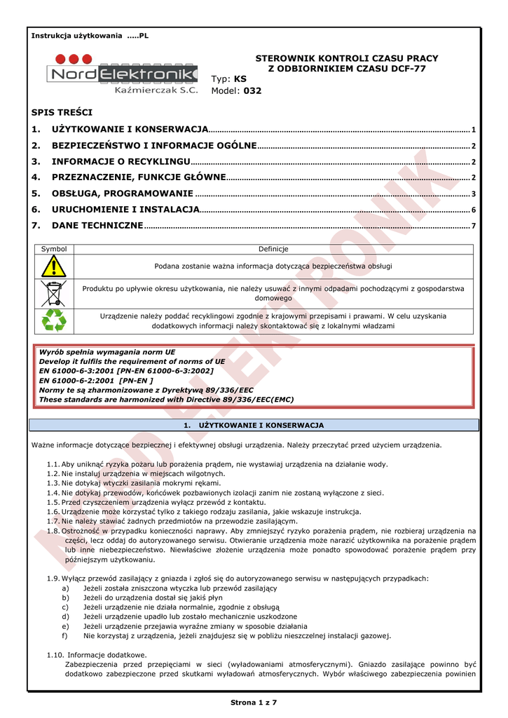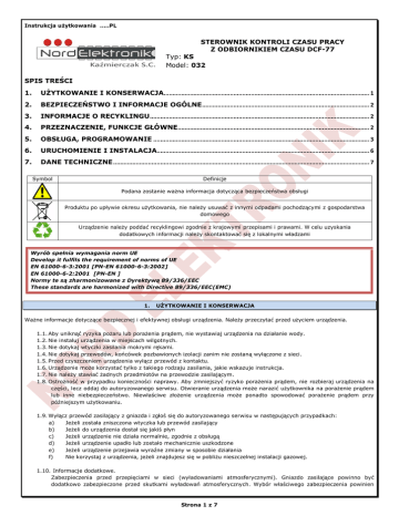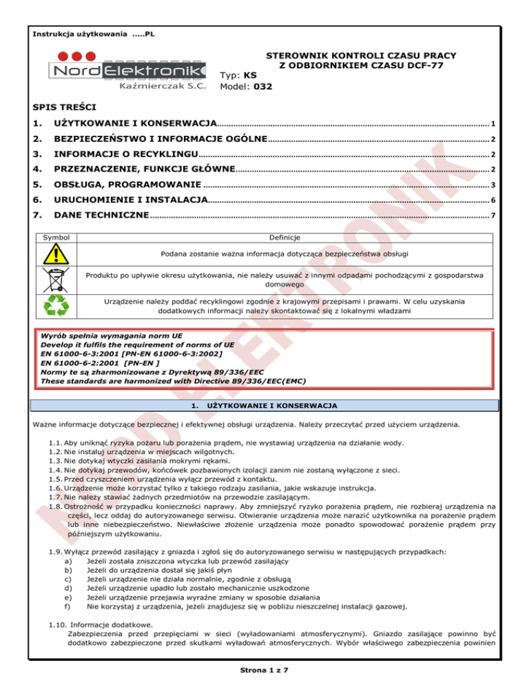 Instrukcja użytkowania .....PL STEROWNIK KONTROLI CZASU PRACY Z ODBIORNIKIEM CZASU DCF-77 Typ: KS Model: 032 SPIS TREŚCI 1. UŻYTKOWANIE I KONSERWACJA...................................................................................................................... 1 2. BEZPIECZEŃSTWO I INFORMACJE OGÓLNE ................................................................................................ 2 3. INFORMACJE O RECYKLINGU.............................................................................................................................. 2 4. PRZEZNACZENIE, FUNKCJE GŁÓWNE.............................................................................................................. 2 5. OBSŁUGA, PROGRAMOWANIE ............................................................................................................................ 3 6. URUCHOMIENIE I INSTALACJA.......................................................................................................................... 6 7. DANE TECHNICZNE ................................................................................................................................................... 7 Symbol Definicje Podana zostanie ważna informacja dotycząca bezpieczeństwa obsługi Produktu po upływie okresu użytkowania, nie należy usuwać z innymi odpadami pochodzącymi z gospodarstwa domowego Urządzenie należy poddać recyklingowi zgodnie z krajowymi przepisami i prawami. W celu uzyskania dodatkowych informacji należy skontaktować się z lokalnymi władzami Wyrób spełnia wymagania norm UE Develop it fulfils the requirement of norms of UE EN 61000-6-3:2001 [PN-EN 61000-6-3:2002] EN 61000-6-2:2001 [PN-EN ] Normy te są zharmonizowane z Dyrektywą 89/336/EEC These standards are harmonized with Directive 89/336/EEC(EMC) 1. UŻYTKOWANIE I KONSERWACJA Ważne informacje dotyczące bezpiecznej i efektywnej obsługi urządzenia. Należy przeczytać przed użyciem urządzenia. 1.1. Aby uniknąć ryzyka pożaru lub porażenia prądem, nie wystawiaj urządzenia na działanie wody. 1.2. Nie instaluj urządzenia w miejscach wilgotnych. 1.3. Nie dotykaj wtyczki zasilania mokrymi rękami. 1.4. Nie dotykaj przewodów, końcówek pozbawionych izolacji zanim nie zostaną wyłączone z sieci. 1.5. Przed czyszczeniem urządzenia wyłącz przewód z kontaktu. 1.6. Urządzenie może korzystać tylko z takiego rodzaju zasilania, jakie wskazuje instrukcja. 1.7. Nie należy stawiać żadnych przedmiotów na przewodzie zasilającym. 1.8. Ostrożność w przypadku konieczności naprawy. Aby zmniejszyć ryzyko porażenia prądem, nie rozbieraj urządzenia na części, lecz oddaj do autoryzowanego serwisu. Otwieranie urządzenia może narazić użytkownika na porażenie prądem lub inne niebezpieczeństwo. Niewłaściwe złożenie urządzenia może ponadto spowodować porażenie prądem przy późniejszym użytkowaniu. 1.9. Wyłącz przewód zasilający z gniazda i zgłoś się do autoryzowanego serwisu w następujących przypadkach: a) Jeżeli została zniszczona wtyczka lub przewód zasilający b) Jeżeli do urządzenia dostał się jakiś płyn c) Jeżeli urządzenie nie działa normalnie, zgodnie z obsługą d) Jeżeli urządzenie upadło lub zostało mechanicznie uszkodzone e) Jeżeli urządzenie przejawia wyraźne zmiany w sposobie działania f) Nie korzystaj z urządzenia, jeżeli znajdujesz się w pobliżu nieszczelnej instalacji gazowej. 1.10. Informacje dodatkowe. Zabezpieczenia przed przepięciami w sieci (wyładowaniami atmosferycznymi). Gniazdo zasilające powinno być dodatkowo zabezpieczone przed skutkami wyładowań atmosferycznych. Wybór właściwego zabezpieczenia powinien Strona 1 z 7 być przeprowadzony przez uprawnionego instalatora. Uszkodzenie urządzenia spowodowane przepięciami w sieci w wyniku wyładowań atmosferycznym nie są objęte gwarancją, nawet, jeśli zastosowano wymienione wyżej zabezpieczenia dodatkowe. Podczas prób przeprowadzonych w docelowych warunkach użytkowania sprzętu nie stwierdzono szkodliwego wpływu urządzenia na inne urządzenia elektryczne i elektroniczne. UWAGA. Moduł powinien być zmontowany zgodnie z instrukcją. Produkt przeznaczony jest dla osób dorosłych. 2. BEZPIECZEŃSTWO I INFORMACJE OGÓLNE 2.1. Nie montować urządzenia w pomieszczeniach o wysokiej temperaturze. Wysokie temperatury mogą być przyczyną uszkodzeń podzespołów elektronicznych, odkształceń lub stopienia elementów plastikowych. 2.2. Nie używać urządzenia w miejscach wilgotnych np.: łazienka, sauny parowe, może to spowodować pożar lub być przyczyną porażenia elektrycznego. 2.3. Urządzenie powinno być zawsze suche. Nie powinno być narażone na padające krople i bryzgi wodne. W przypadku zawilgocenia urządzenia może to spowodować uszkodzenie podzespołów elektronicznych. 2.4. Nie wkładać żadnych przedmiotów w otwory wentylacyjne, grozi to uszkodzeniem urządzenia. 2.5. Nie upuszczaj, nie uderzaj i nie potrząsaj urządzeniem. Nieostrożne obchodzenie się z nim może spowodować uszkodzenie podzespołów elektronicznych i delikatnych mechanizmów. 2.6. Do czyszczenia nie używać wody, chemikaliów, rozpuszczalników. Czyścić wilgotną ściereczką z dodatkiem detergentów. 2.7. Do czyszczenia reflektorów używaj miękkiej, czystej i suchej ściereczki. 2.8. W przypadku wydobywania się podejrzanego zapachu/dym/, odłączyć niezwłocznie od zasilania i skontaktować się ze sprzedawcą lub producentem. 2.9. Nie próbować samemu naprawiać urządzenia. Skontaktować się ze sprzedawcą lub producentem. 2.10. Serwis prowadzi producent: Nord Elektronik Kaźmierczak S.C., 76-200 Słupsk , ul. Mikołaja Reja 53, Tel./Fax. +48 59. 7272445, 697 697 381 serwis@ nordelektronik.pl Okres gwarancji wynosi 2 lata od daty zakupu w siedzibie Firmy NORD ELEKTRONIK Kaźmierczak S.C. W przypadku reklamacji, odpowiedzialność dotyczy wyłącznie produkowanych przez nas zestawów i podze