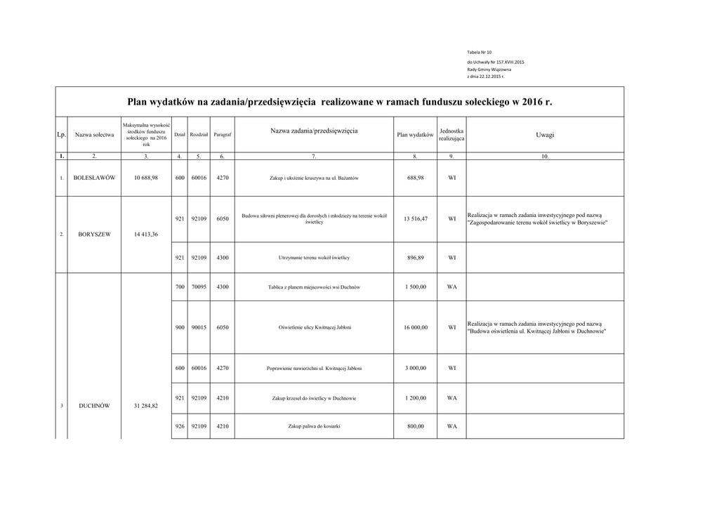 Plan wydatków na zadania/przedsięwzięcia realizowane w ramach funduszu sołeckiego w 2016 r.